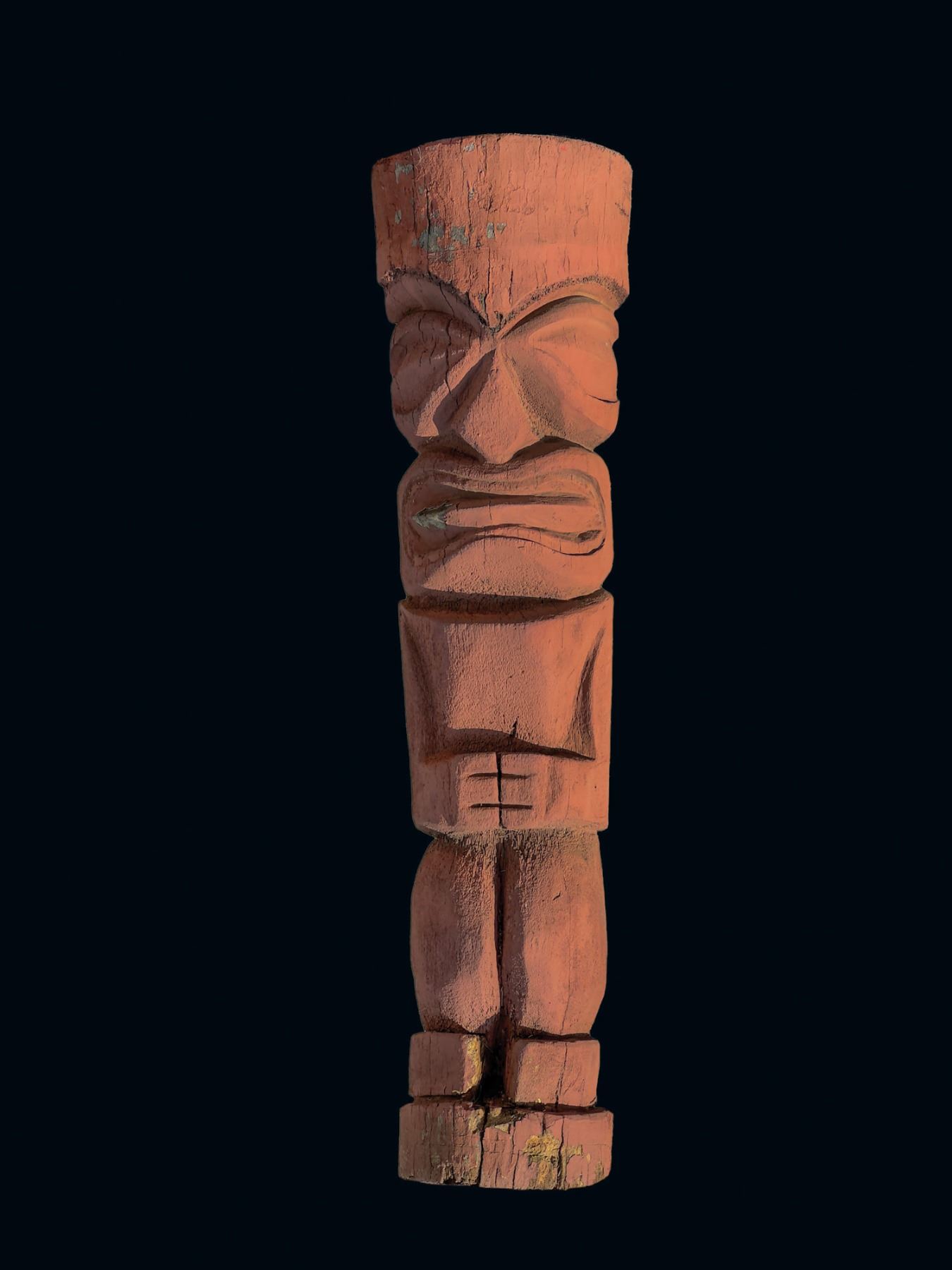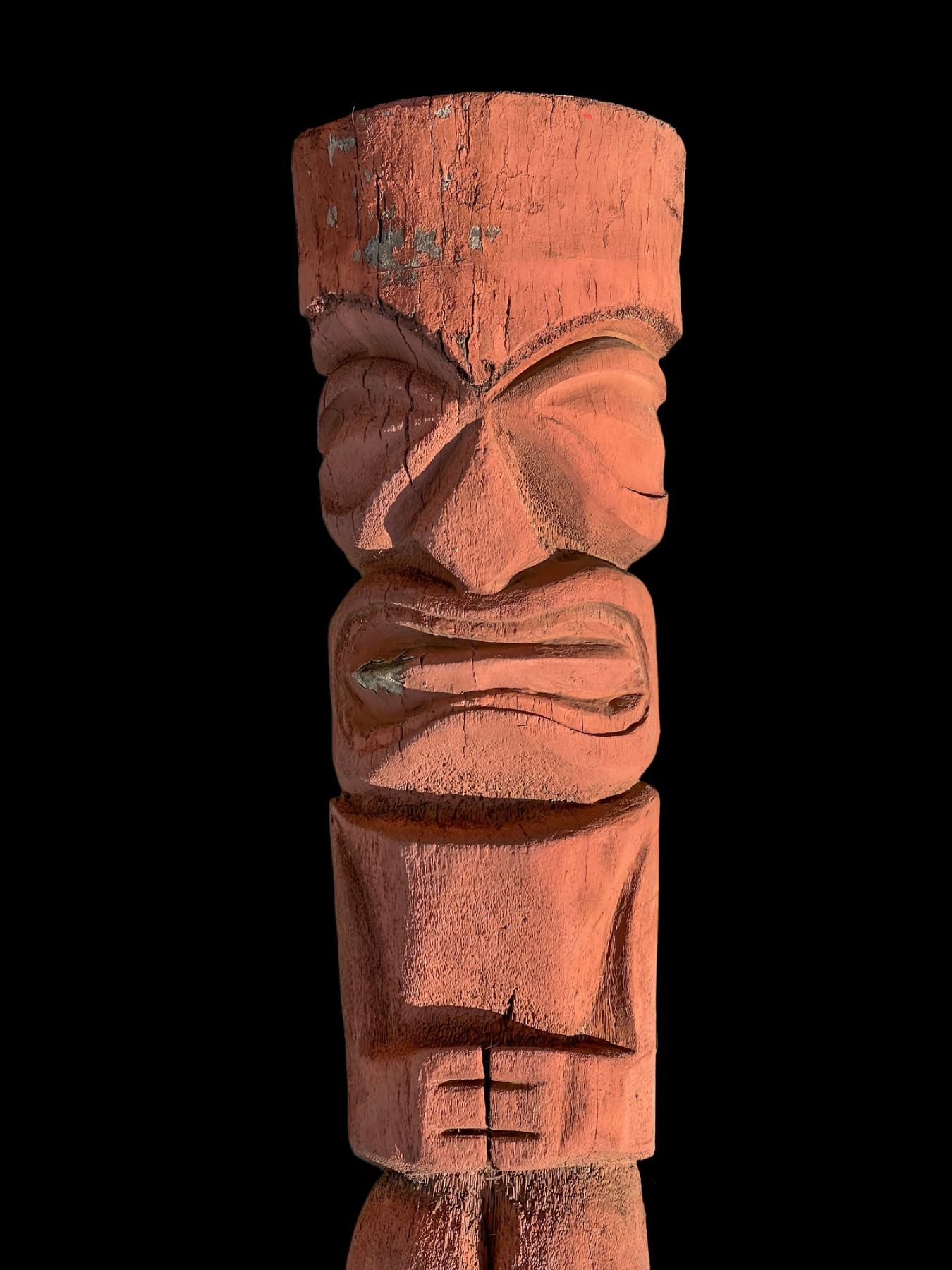 (1960s)* Classic mid-60s restaurant Tiki! This piece was "rescued" by Sven from an old shed behind a closed-down Poly-Chinese Restaurant in Fresno, CA while he was on a television production shoot. Although the condition of this palm Tiki is rather fragile, it is in good enough condition for display and possible full restoration. Sven chose to keep it original. There are areas of separation and cracking however, the paint is intact and overall, the piece is solid. Please see attached online photos and ask questions before bidding. We have priced the starting bid accordingly. VG with fragile areas at the base and rear. 19x74x10.