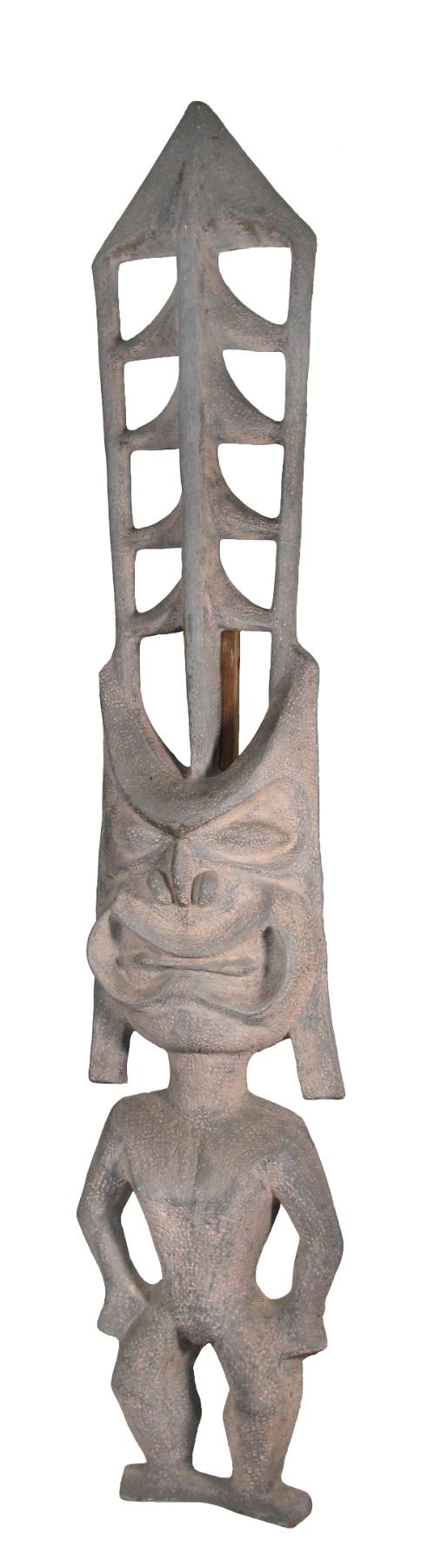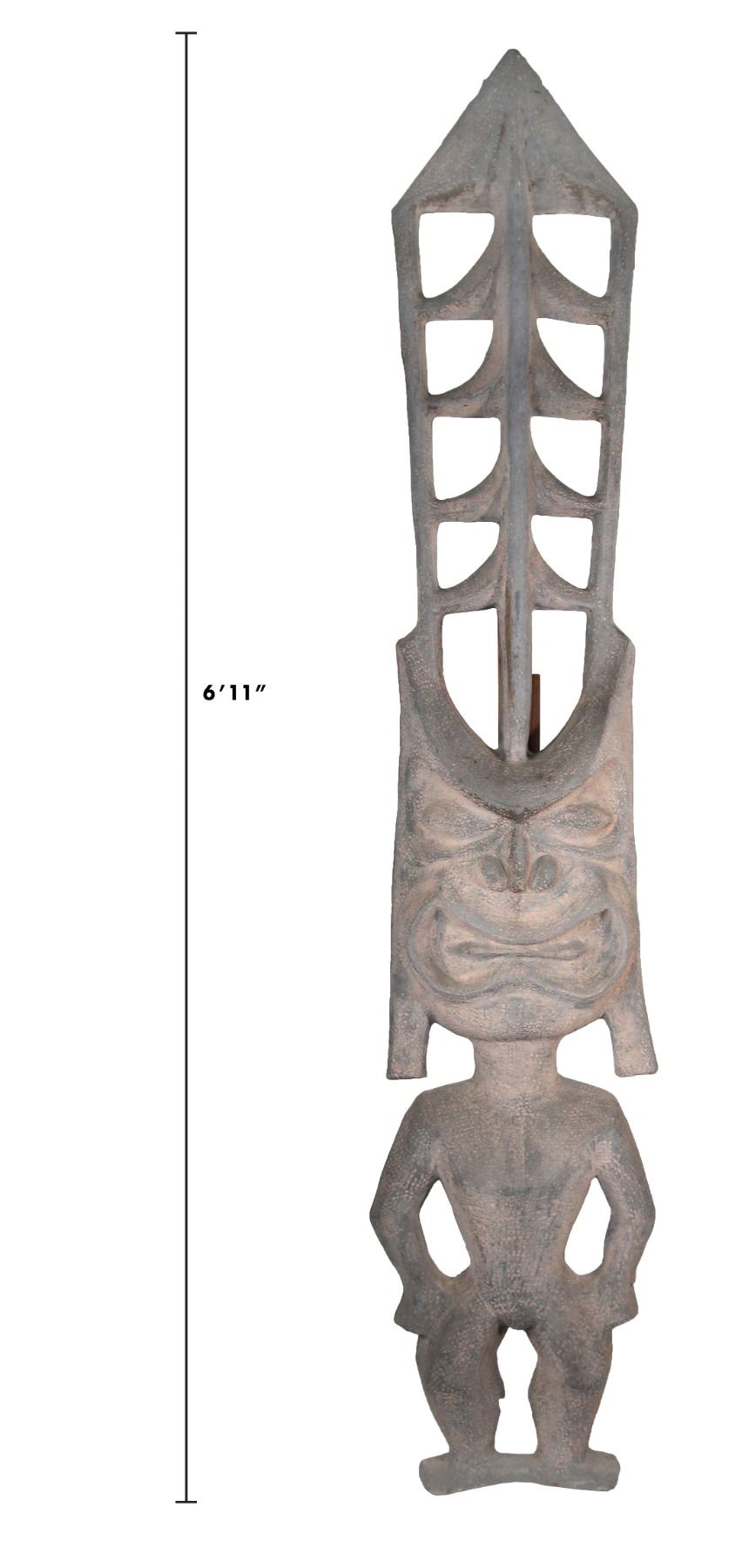 (1960s) Off the charts promotional Tiki for United Airlines. Wonderful variation on the Hawaiian Tiki God of peace, Lono with it's high, open cut, pointed headdress and wide mouth. Standing at almost 7 feet, the figure is made of fiberglass with faux stone finish. 83"x16". VG+.
