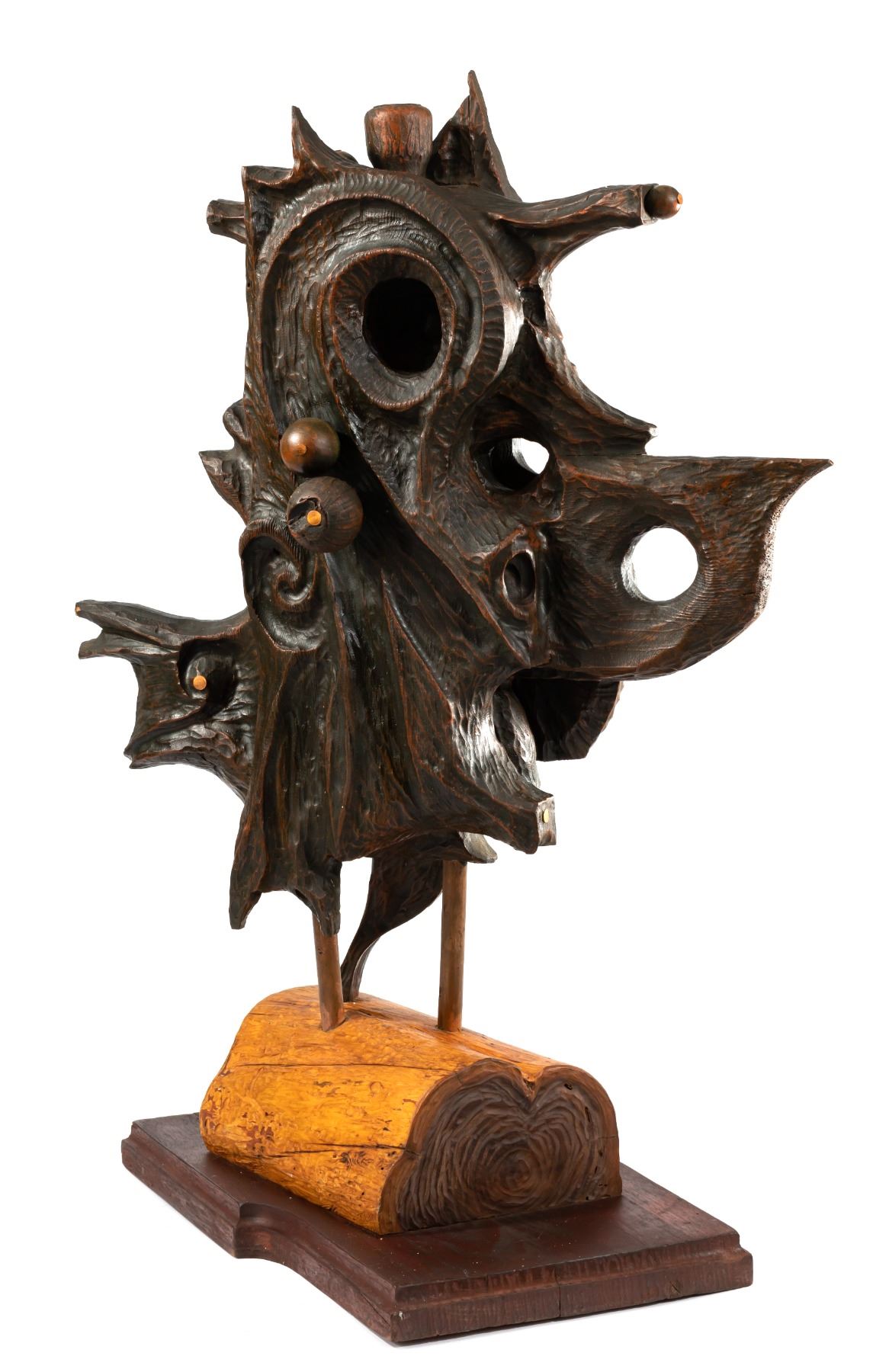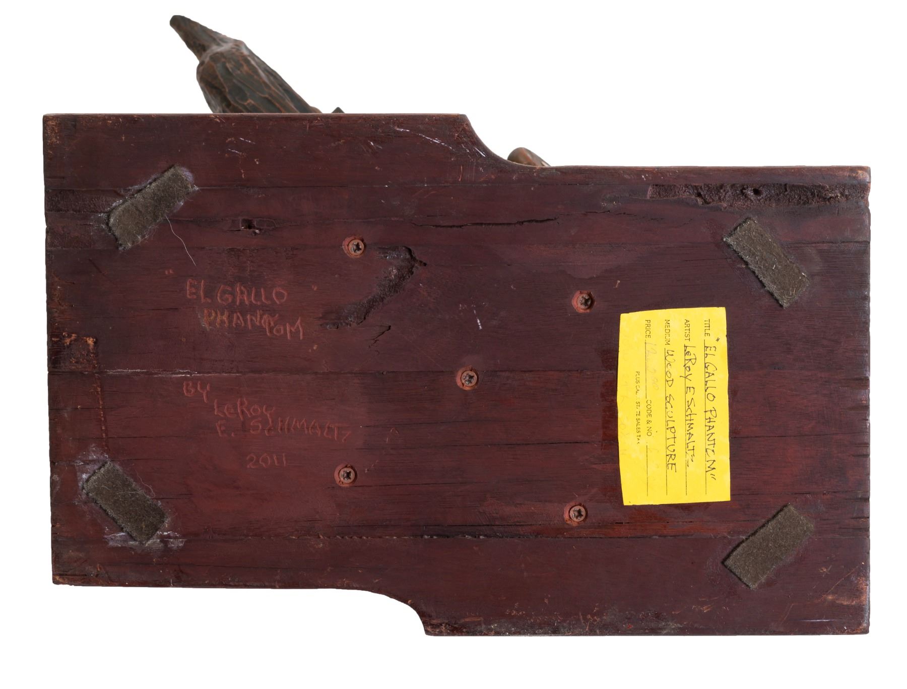 (2011) An impressive sculpture out of wood and copper accents, mounted on a custom base. Entitled, "EL GALLO PHANTOM", the bat-like abstract features carved and turned wood parts. Signed under the custom base by LeRoy Schmaltz in both carving and paper label. Sold by the LEROY SCHMALTZ ESTATE. 22"x30.5"x17". VG+.