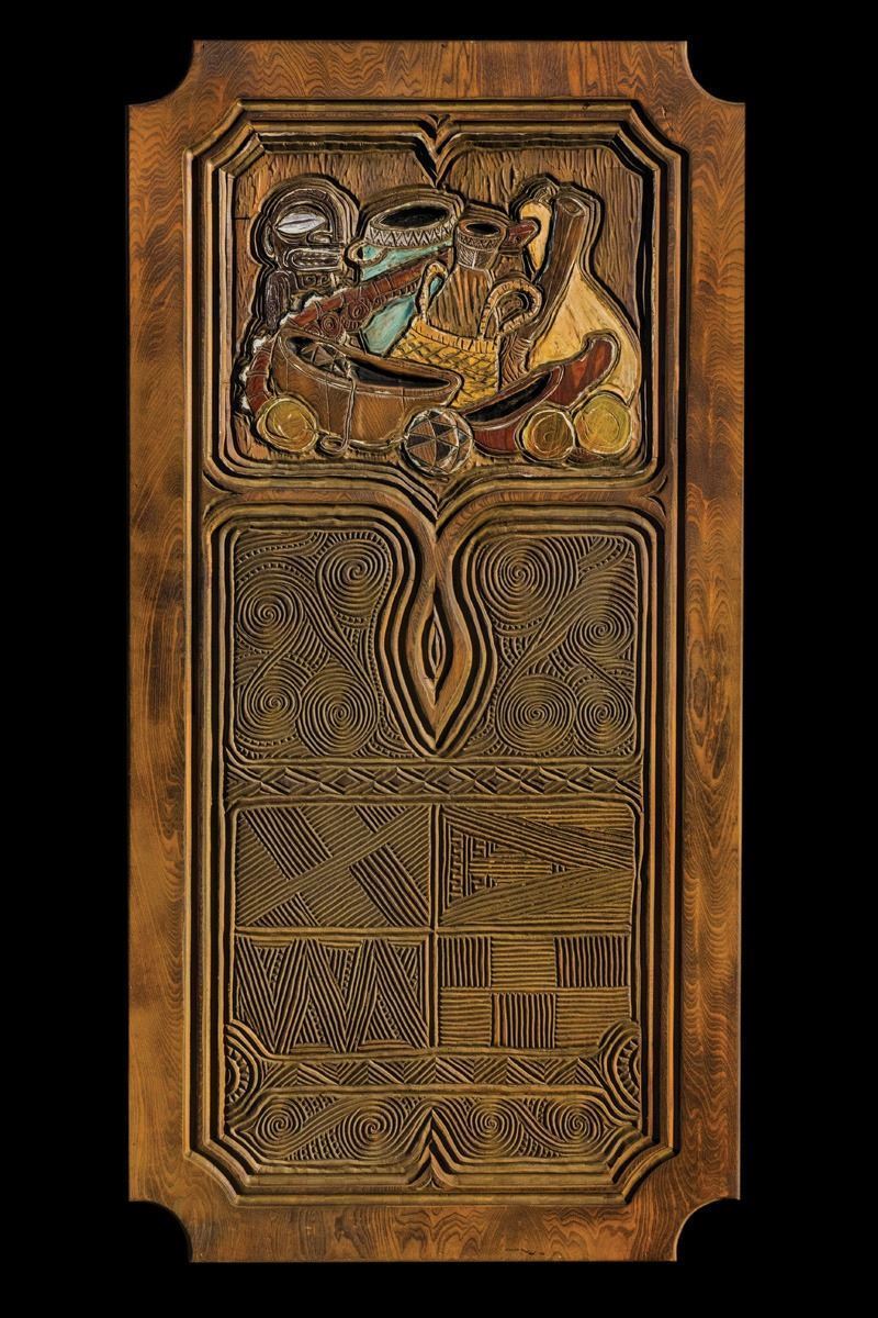 (1970s) A large "carved painting" Marquesan still life study by LeRoy Schmaltz.80"x40"VG+ with typical wear