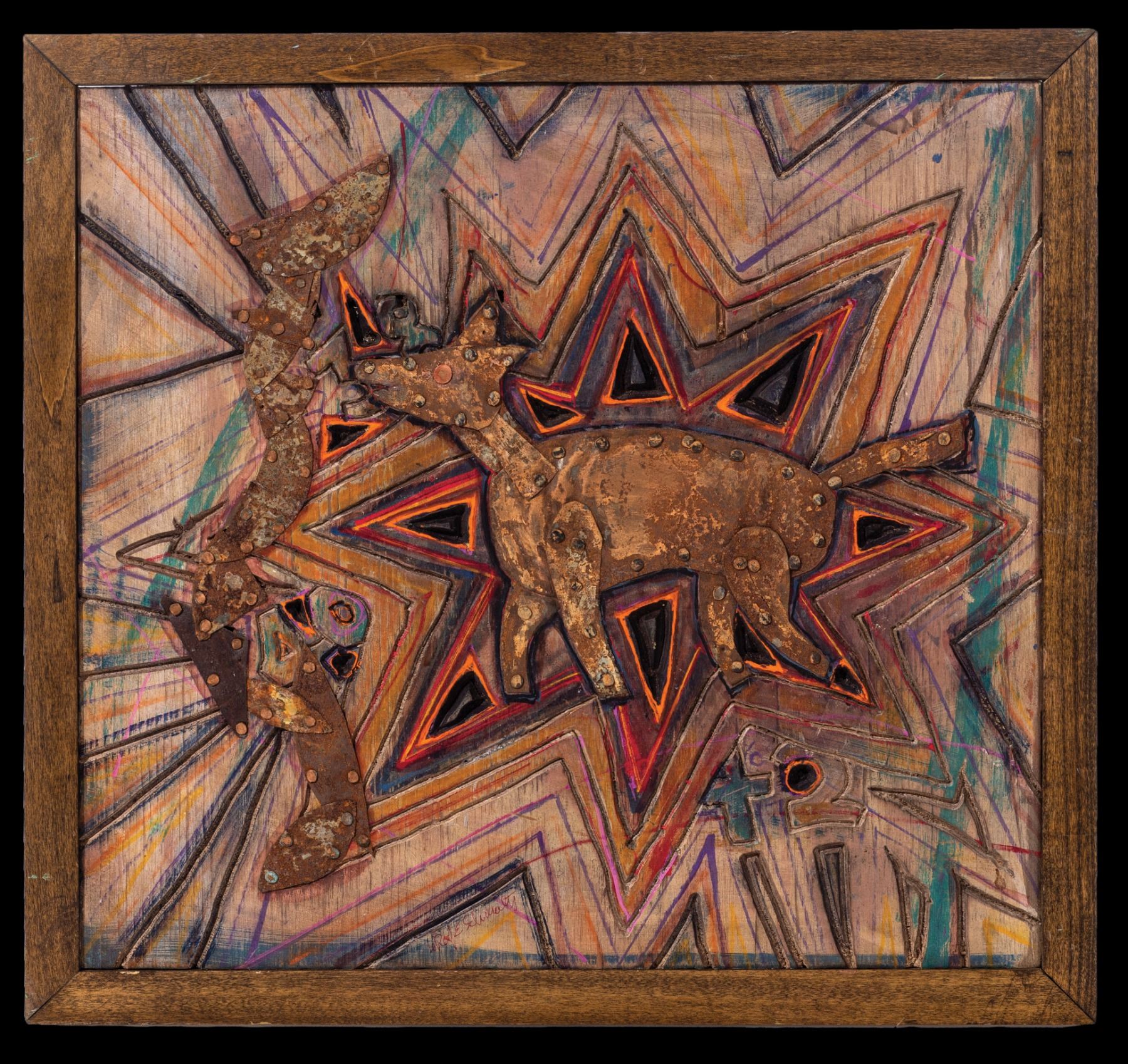 (2015) Signed. Acrylic, cut tin cans, wood. 19"x20". VG+ with typical wear.