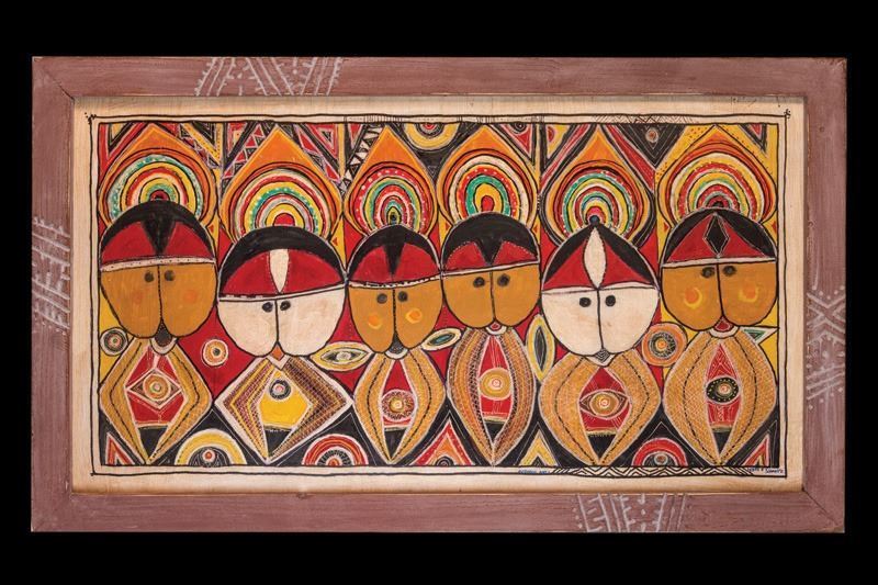 (2020) Ablem style - New Guinea - Sepik River Reigon, Yam Gods in a Row painting in carved frame.23"x39".VG+ with typical wear