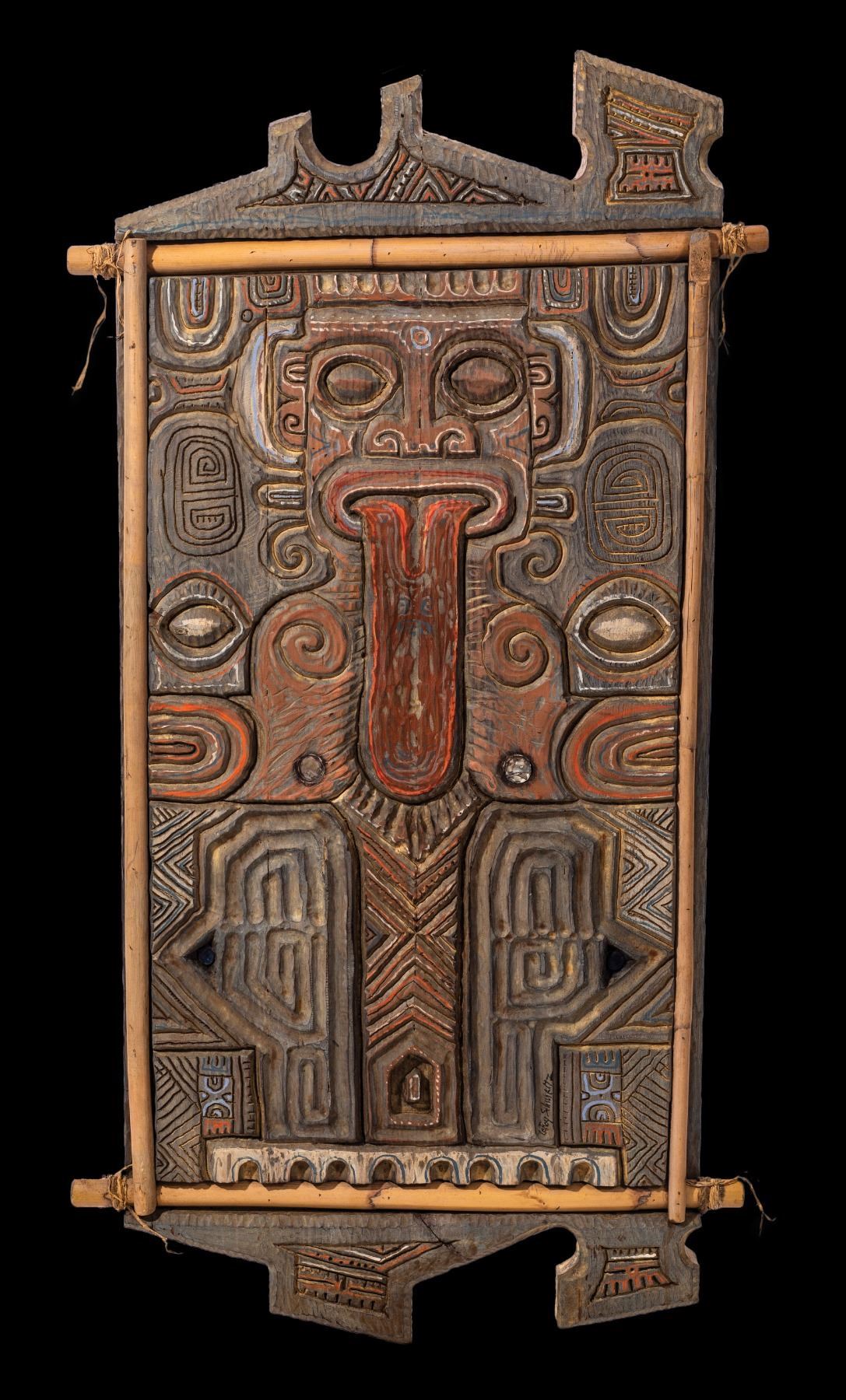 (2013) Signed. Exquisite, large 'carved painting' panel by LeRoy. A quasi Marquesan-inspired work with detailed imagery, bamboo framing and abalone shell insets. 50"x26.6". VG+ with typical wear.