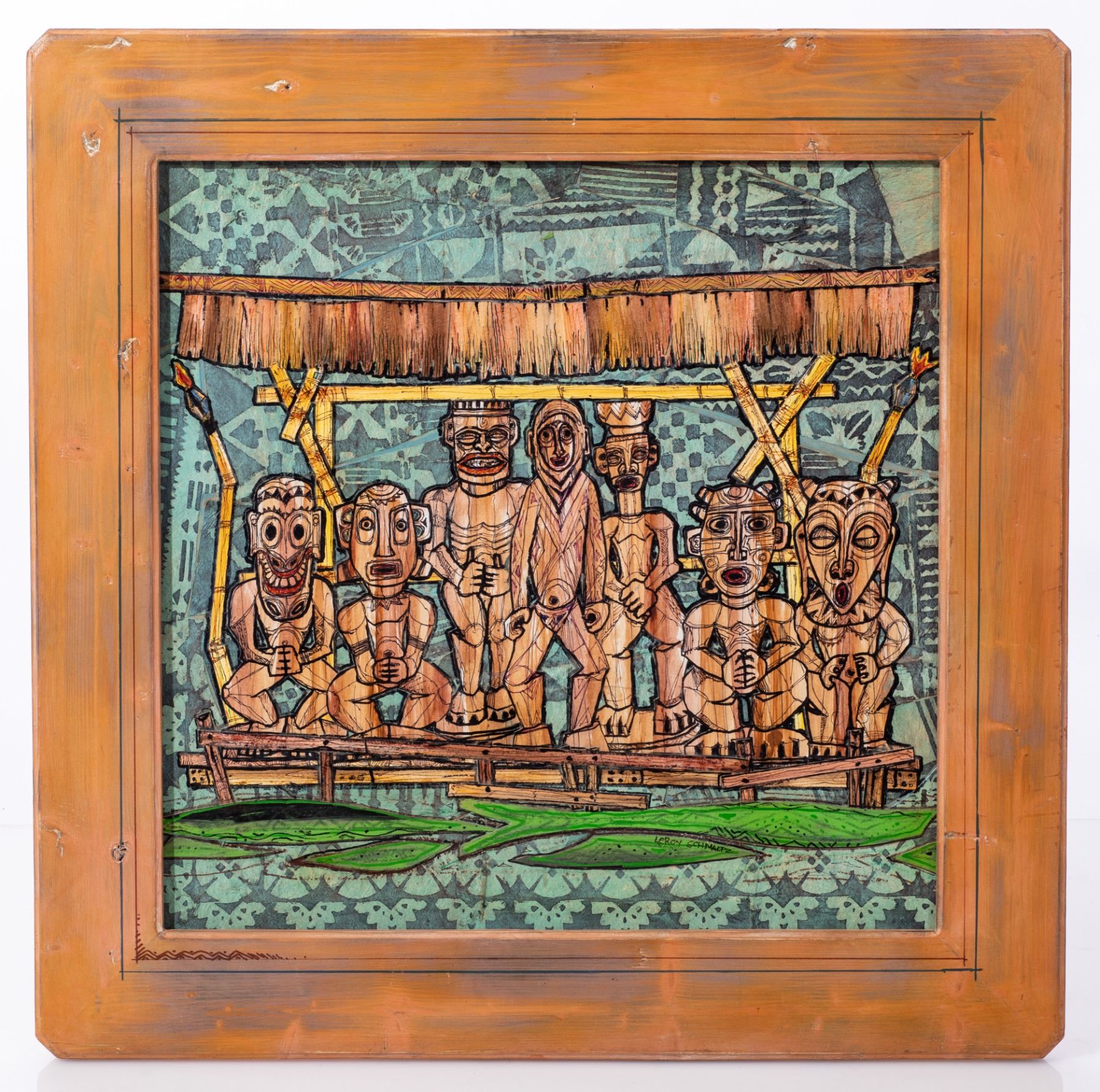 (2000s). A masterful collage from the master of Tiki! Personal art created by LeRoy outside of Oceanic Arts. Signed by LeRoy Schmaltz. Collage: tapa, paper, ink, acrylic. 31"x31". VG+ with typical wear.