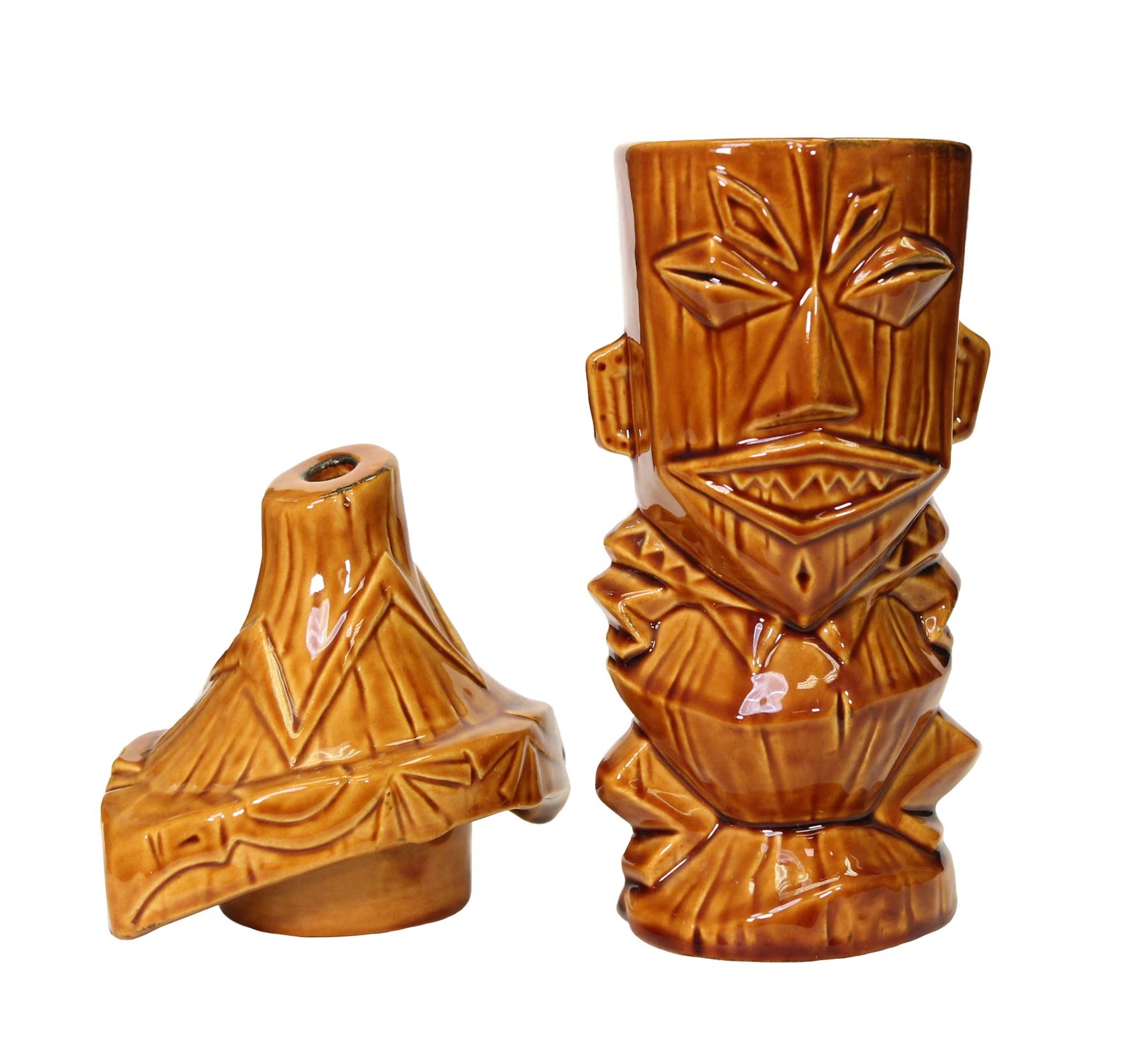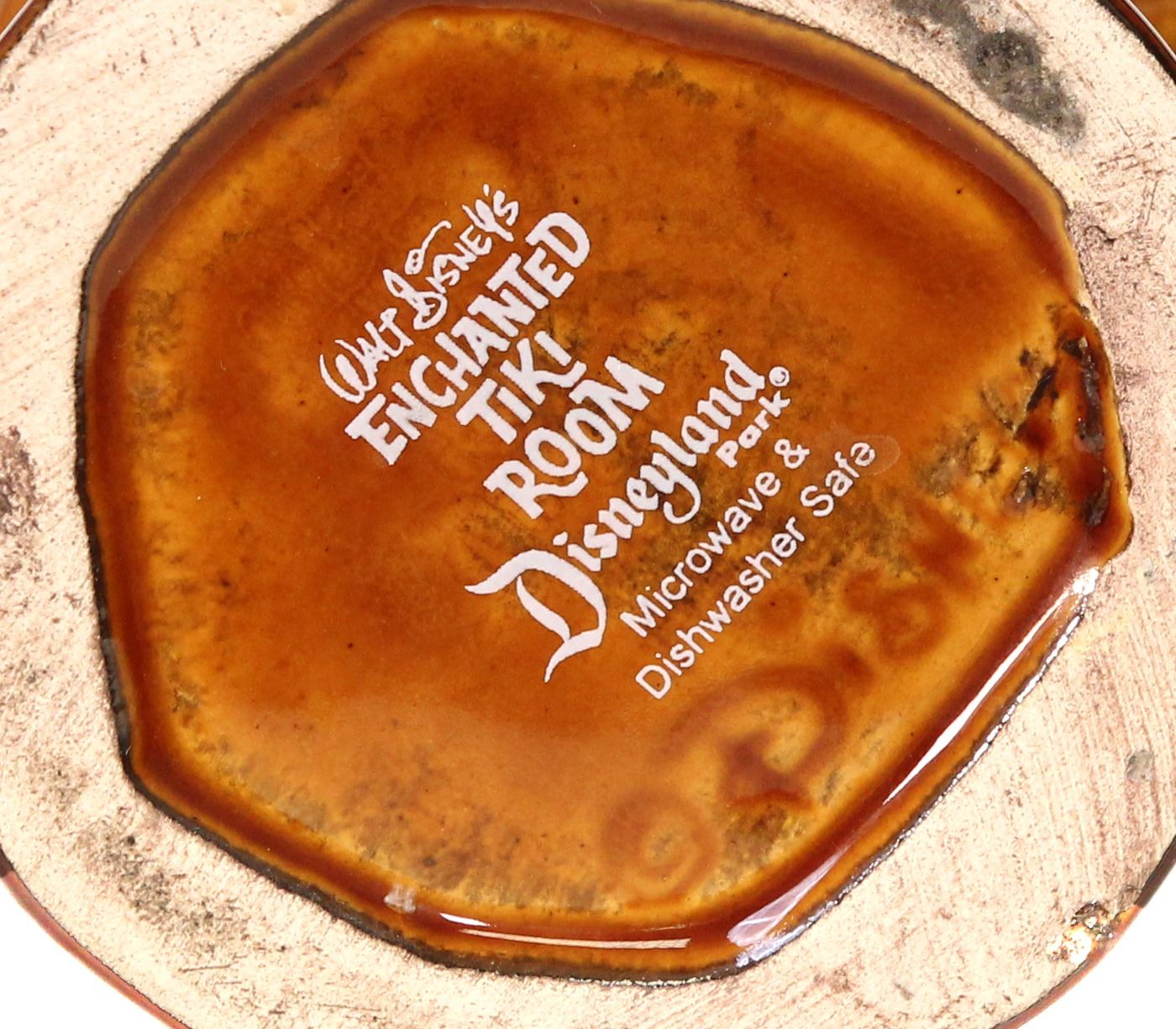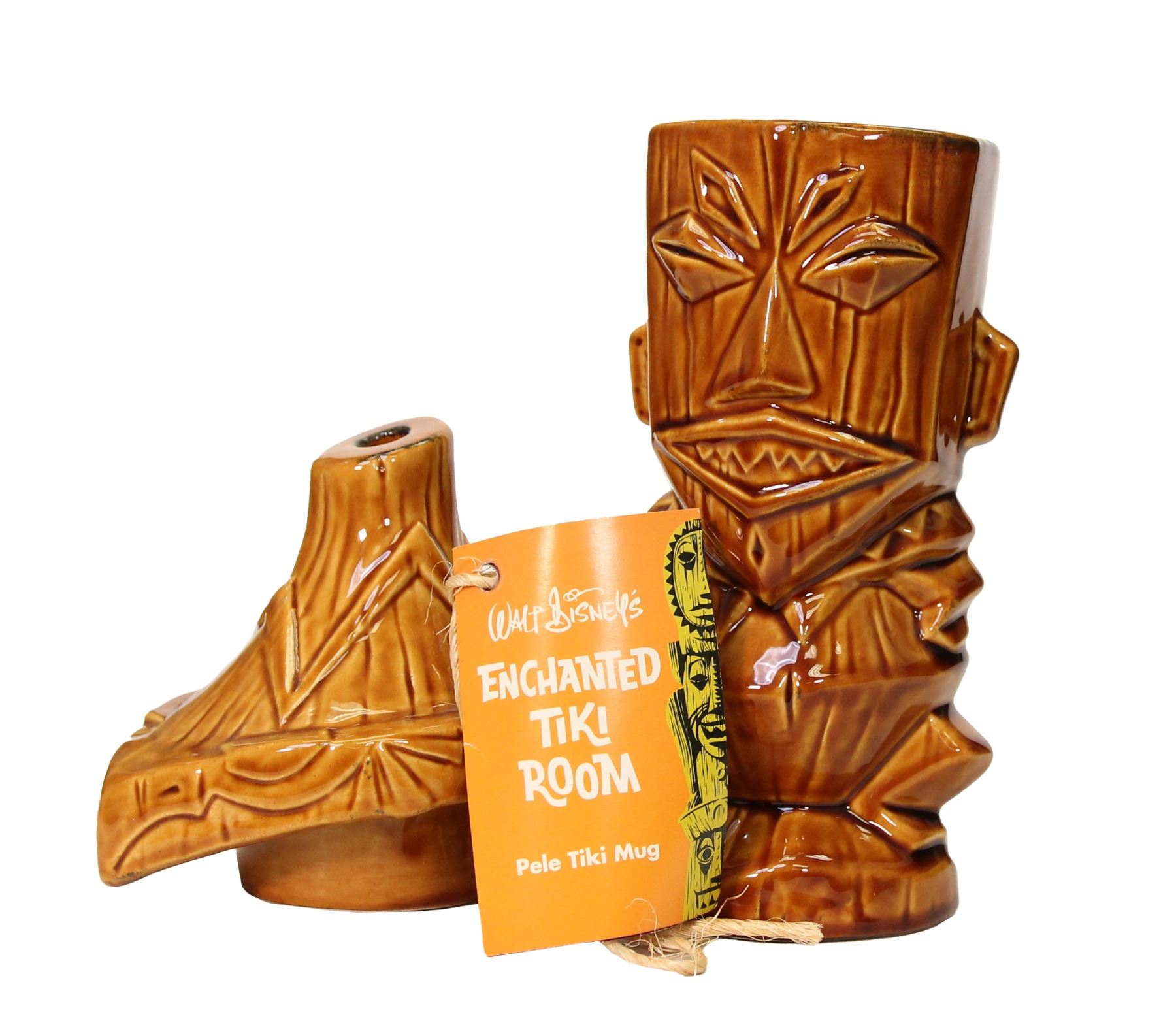 (2000s) Highly collectible "Enchanted Tiki Room" Pele Tiki mug features a wonderful light ochre glazing and fanciful design. Designed by Jody Daily. Removable hat lid and comes with original sales tag. FROM THE SVEN KIRSTEN KOLLECTION. Ceramic. Mug-7.5"x3.5" w/ Lid-11.25"x5.5". VG+.