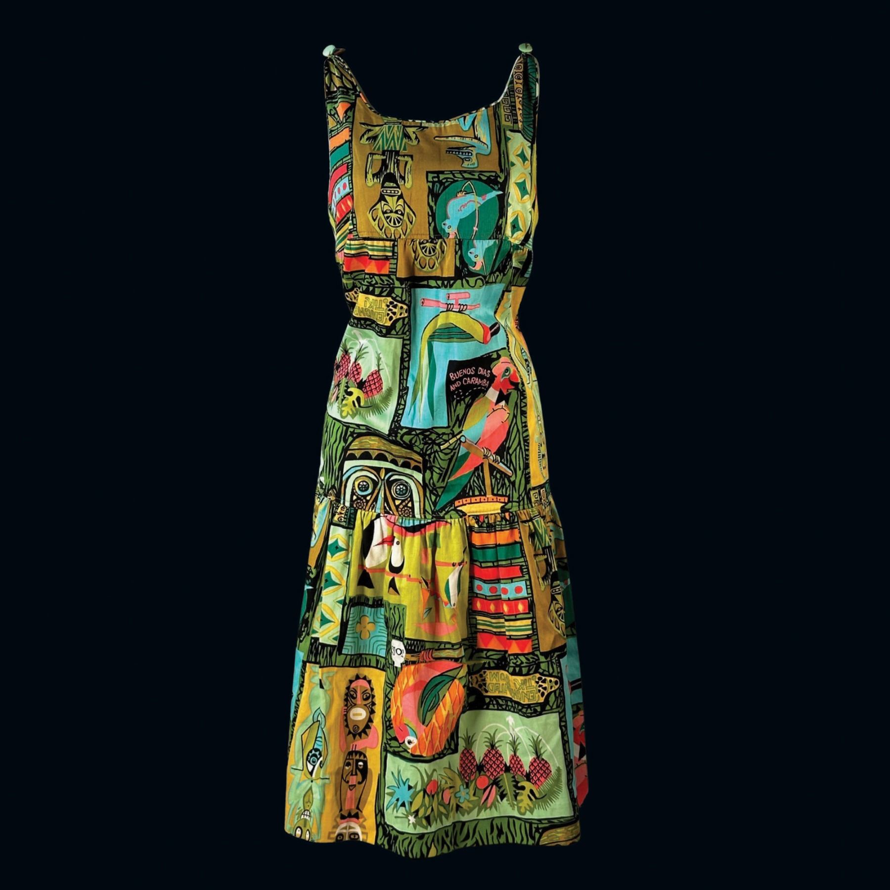 (2000s) A new, unworn Disneyland Enchanted Tiki Room Hostess dress limited edition replica created by Kevin Kidney and Jody Daily for Disney. These are as close as one can get to an original with bright color and the recreated metallic thread interior tag. These sold out almost immediately. EX and unworn. CHEST-20" WAIST-23" LENGTH-34".