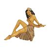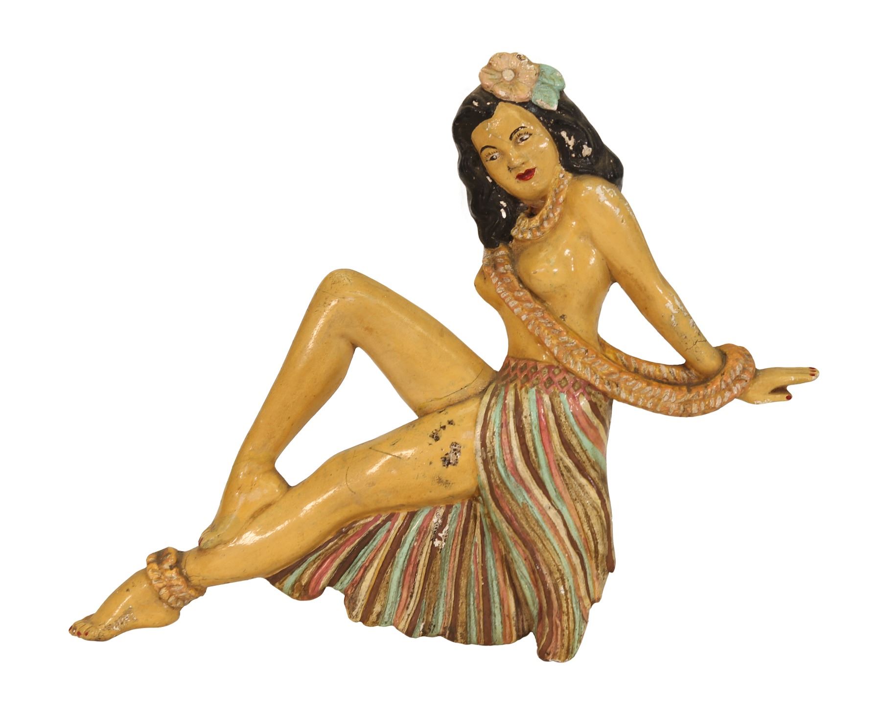 (1950s) Vintage plaster mold of topless Hawaiian hula girl figurine with colorful skirt, flowered hair piece, and wrapped in a boa of leis. Hand painted plaster. Original condition. 14"x10". GOOD condition with areas of rubbing to paint.