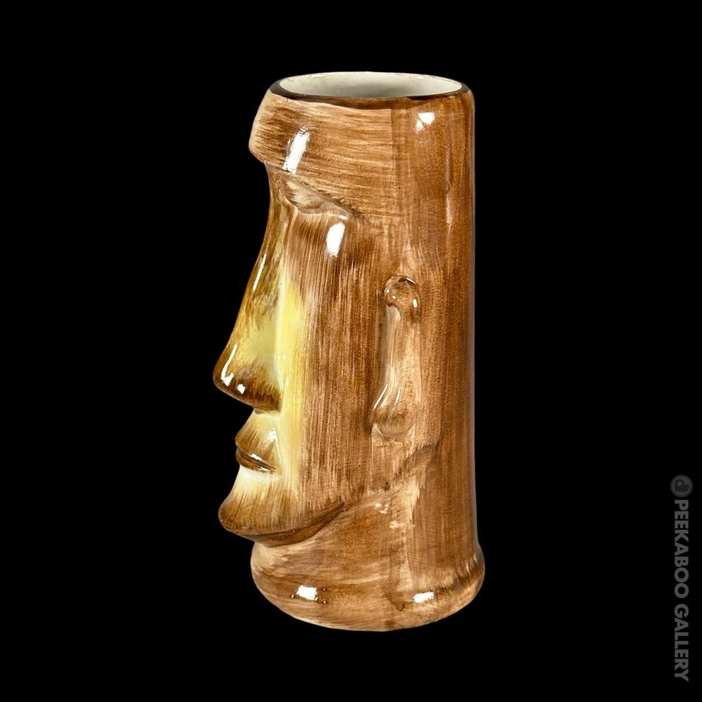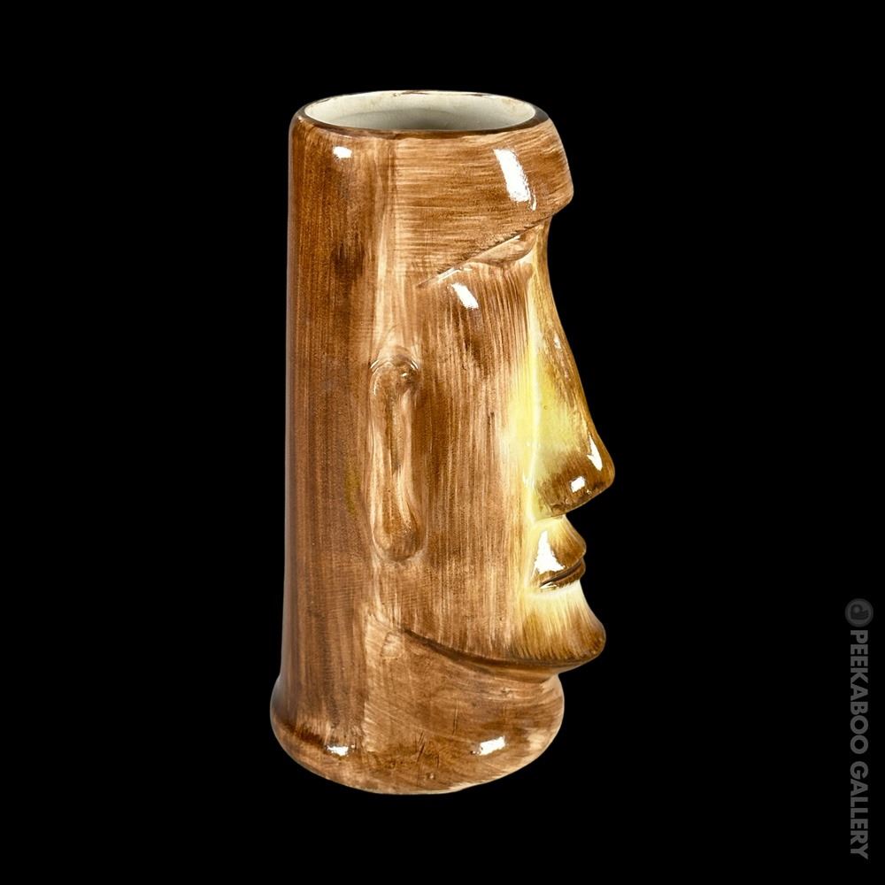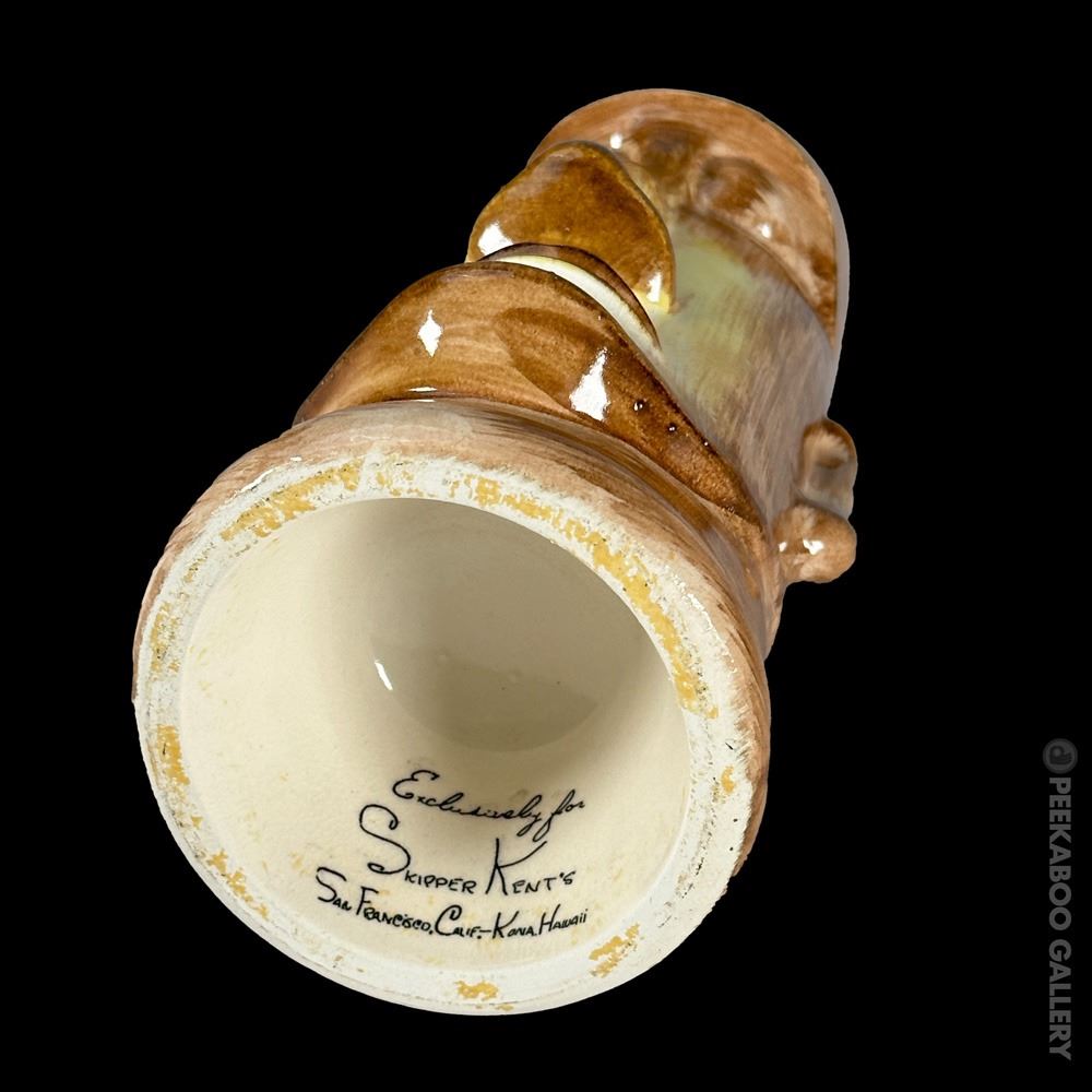(1950s) Skipper Kent's in San Francisco is one of the elusive early Tiki establishments that pre-date the boom in late 1950s. This large mug is one of the best dimensional Moais to come out of the movement. It also features an excellent dry brush accent technique in the glazing. Marked under the base. VG+ with typical wear. 7.75"x4.25"dia.