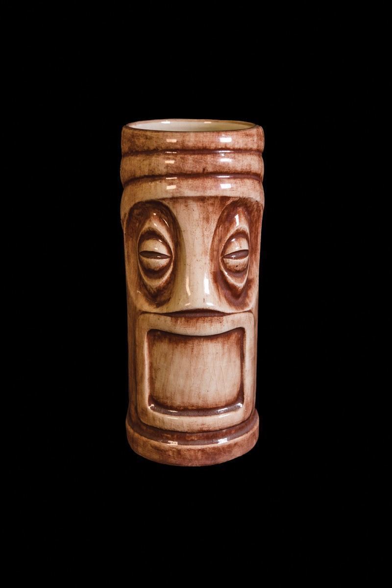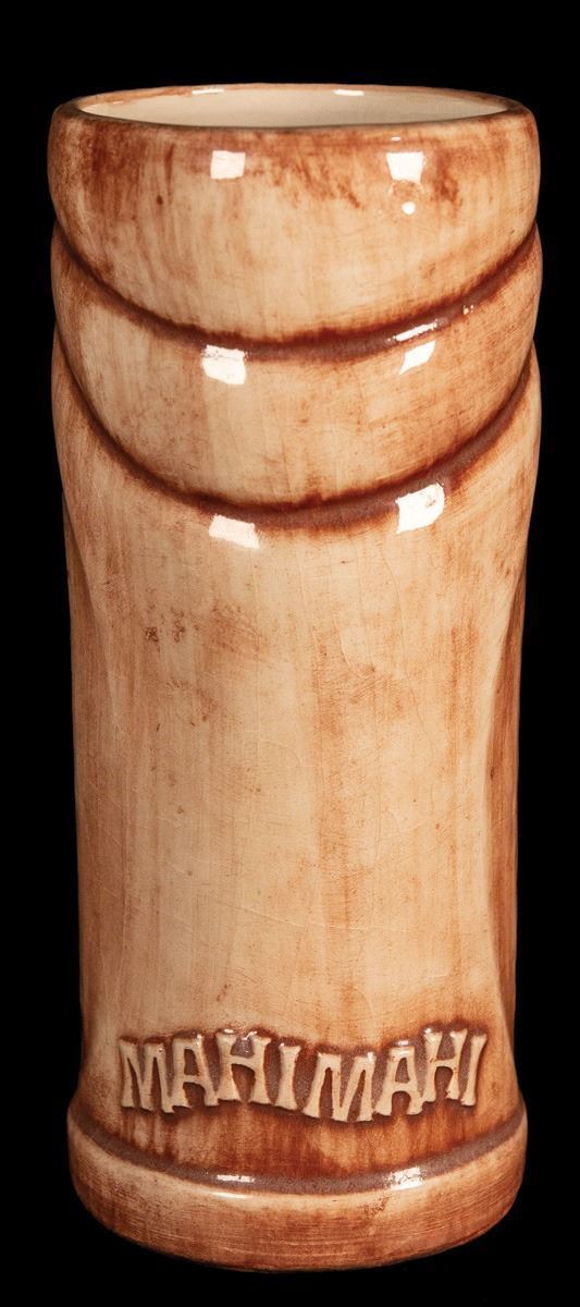 (1960s) SPURLIN CERAMICS. Here is one of OA's custom mugs made for the MAHI MAHI in Nashville, TN. Eli Hedley flew out to Nashville to personally install the decor at this venue and used OA as the materials supplier. A signature Hedley designed figural tiki was used as the company logo and OA was commissioned to create the signature mug. OA engaged Stella Bodey and Spurlin Ceramics for the job. This is one of OA's warehouse samples. Rare!7".VG+ Light crazing in the clear glaze.