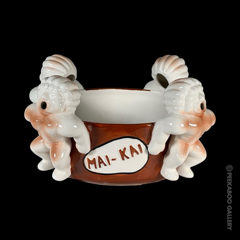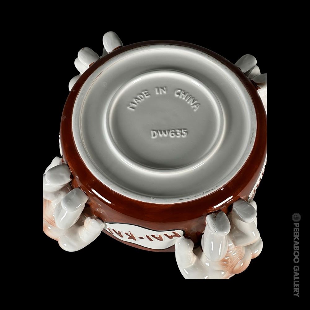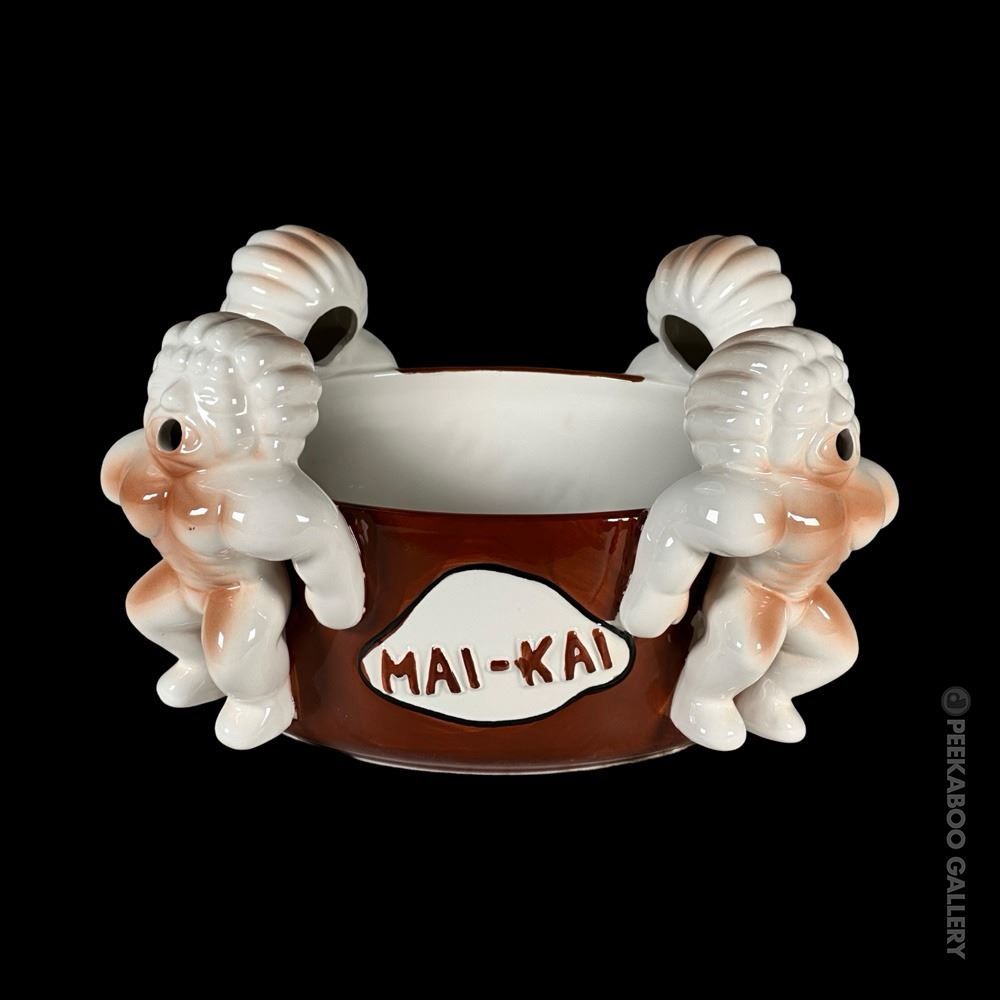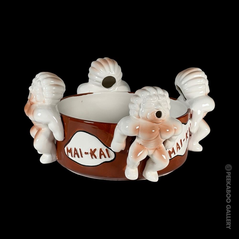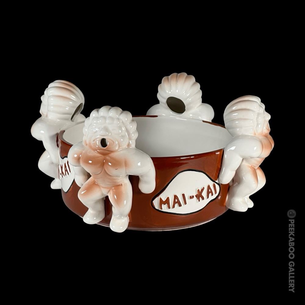(1970s) One of the ultimate drinking vessels in the genre of Polynesian Pop! The Mystery Bowl represented a total abandonment of civilization and an embrace of primitive passions... at least for the length of one drink for four! This concept of the MAI-KAI of presentation ceremony with a gong hit, alluring Mystery Girl and formalized straw insertion was so grand and novel, it was lifter for the Kahiki Supper Club in Columbus, Ohio. This is the third iteration of this legendary drink bowl. Dating from the 1970s thru the 1990s, Dynasty Wholesale began producing them for the MAI-KAI. The size is impressive and can be a cornerstone of any advanced Tiki mug collection! VG+. 6.75"x12"dia.