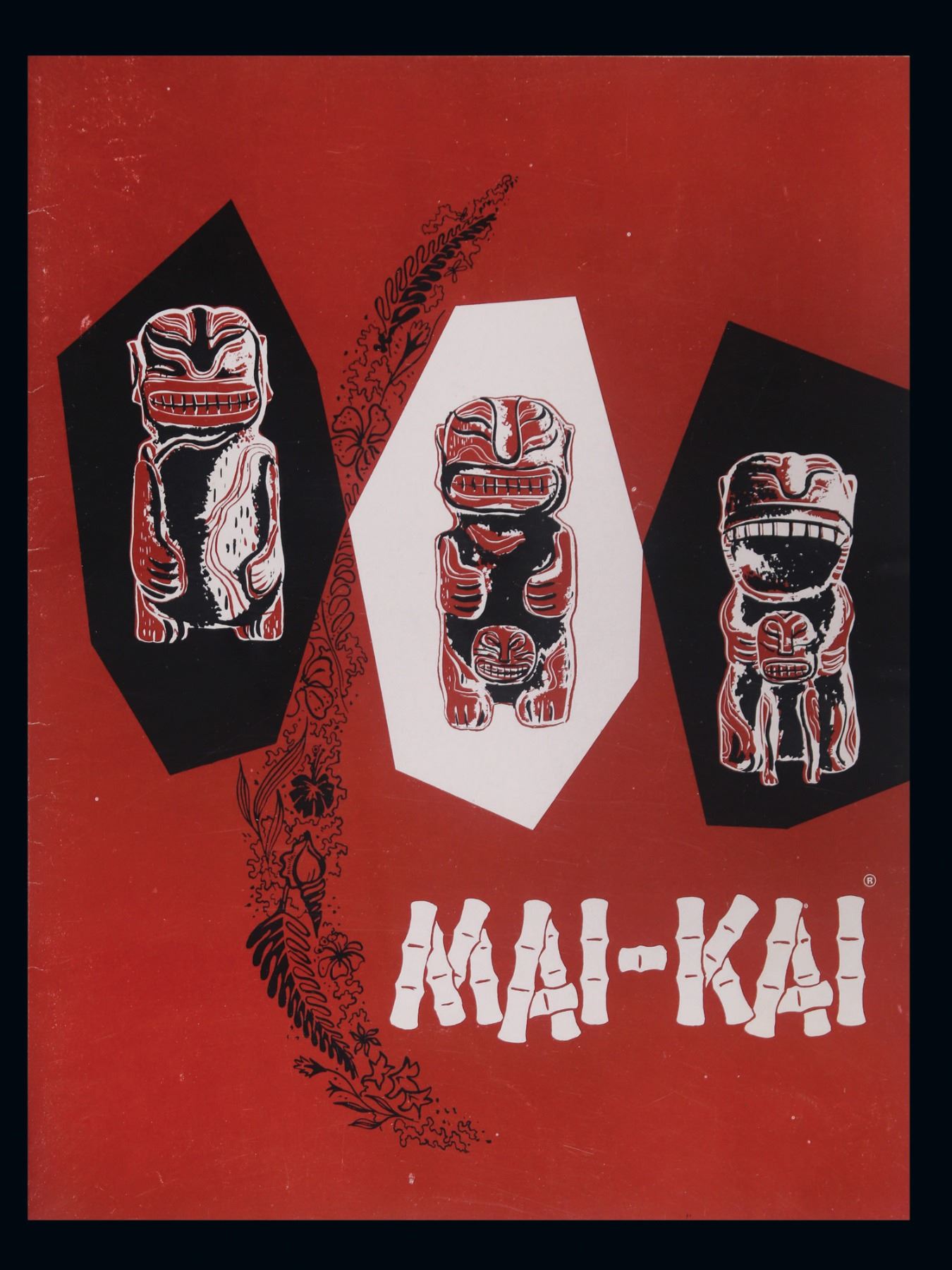 (1950s) Another early restaurant menu for the MAI-KAI restaurant with a gorgeous cover illustration of the signature logo cannibals used in the early years of the business. VG+. 9.5"x12.5" closed.