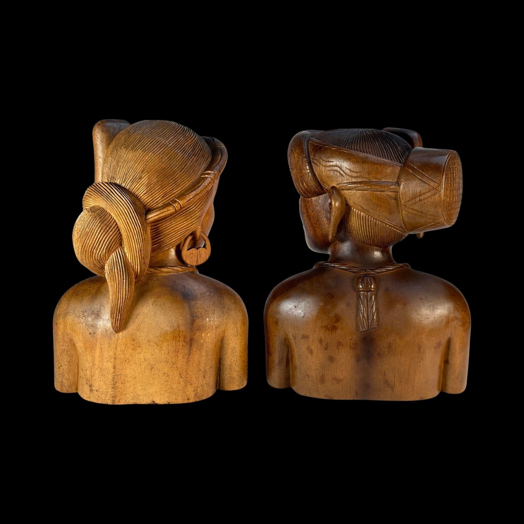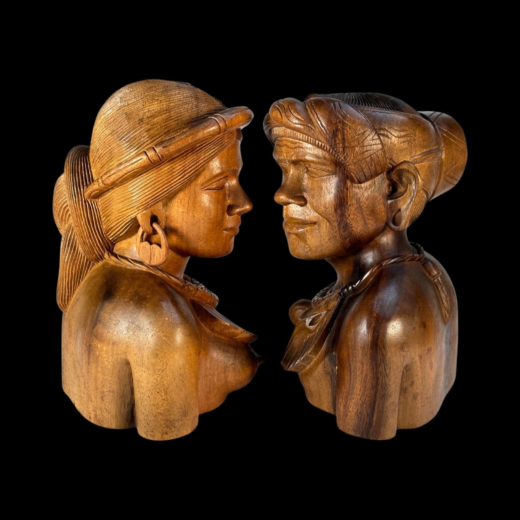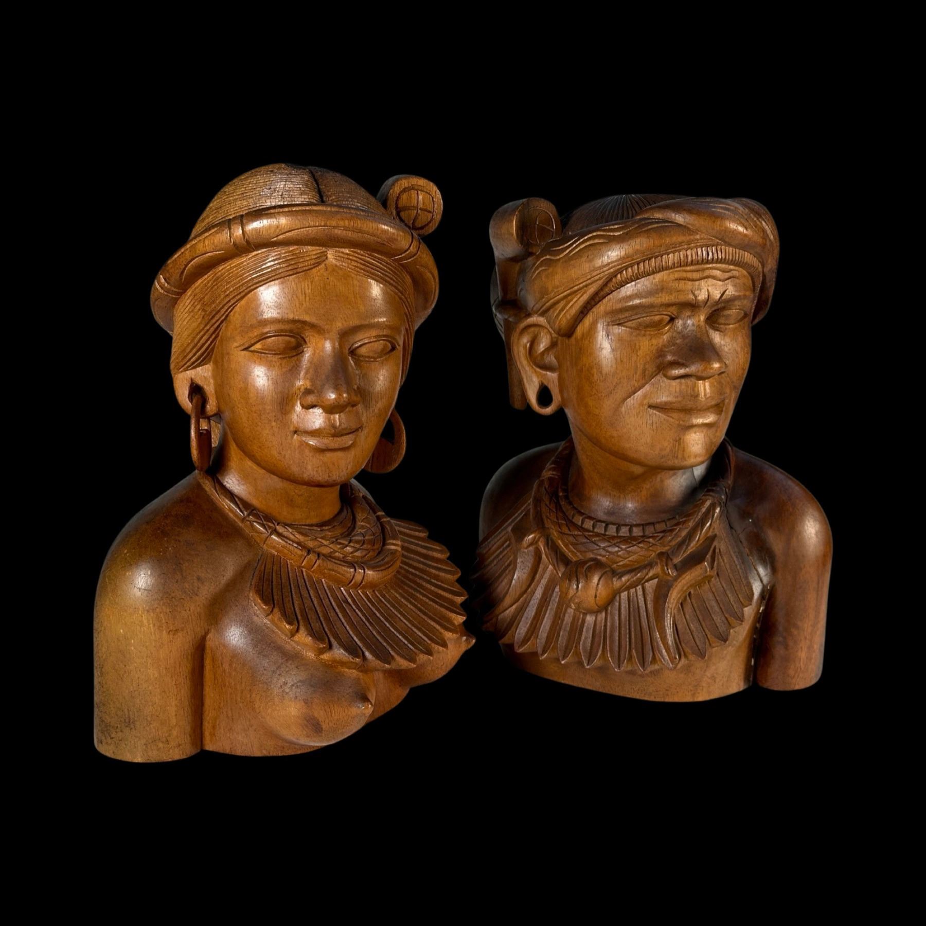 (1960s)* A staple of ethnographic Tiki lounge decor, these sculptures were carved by Igorot carvers and imported for their exotic value. Their natural nudity was part of the National Geographic eroticism used as a temporary escape from mid-century Puritan America. We carried a nice set of these from the Oceanic Arts collection. Overall VG+ with a light stress crack in the wood on the male. 10"x12.25"x8" male, 9"x12.5"x9" female.