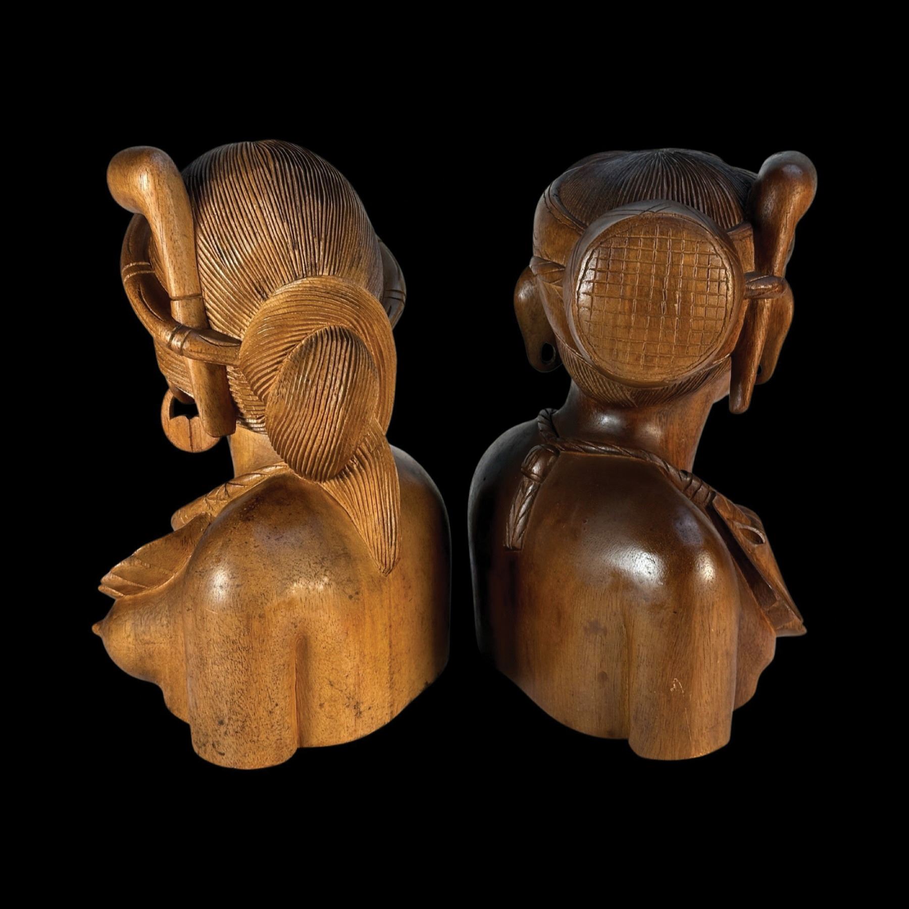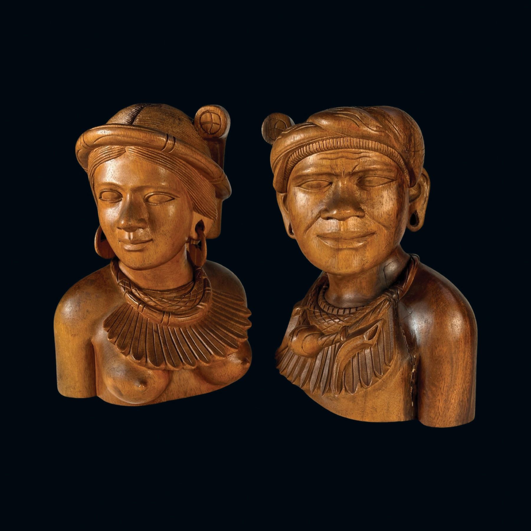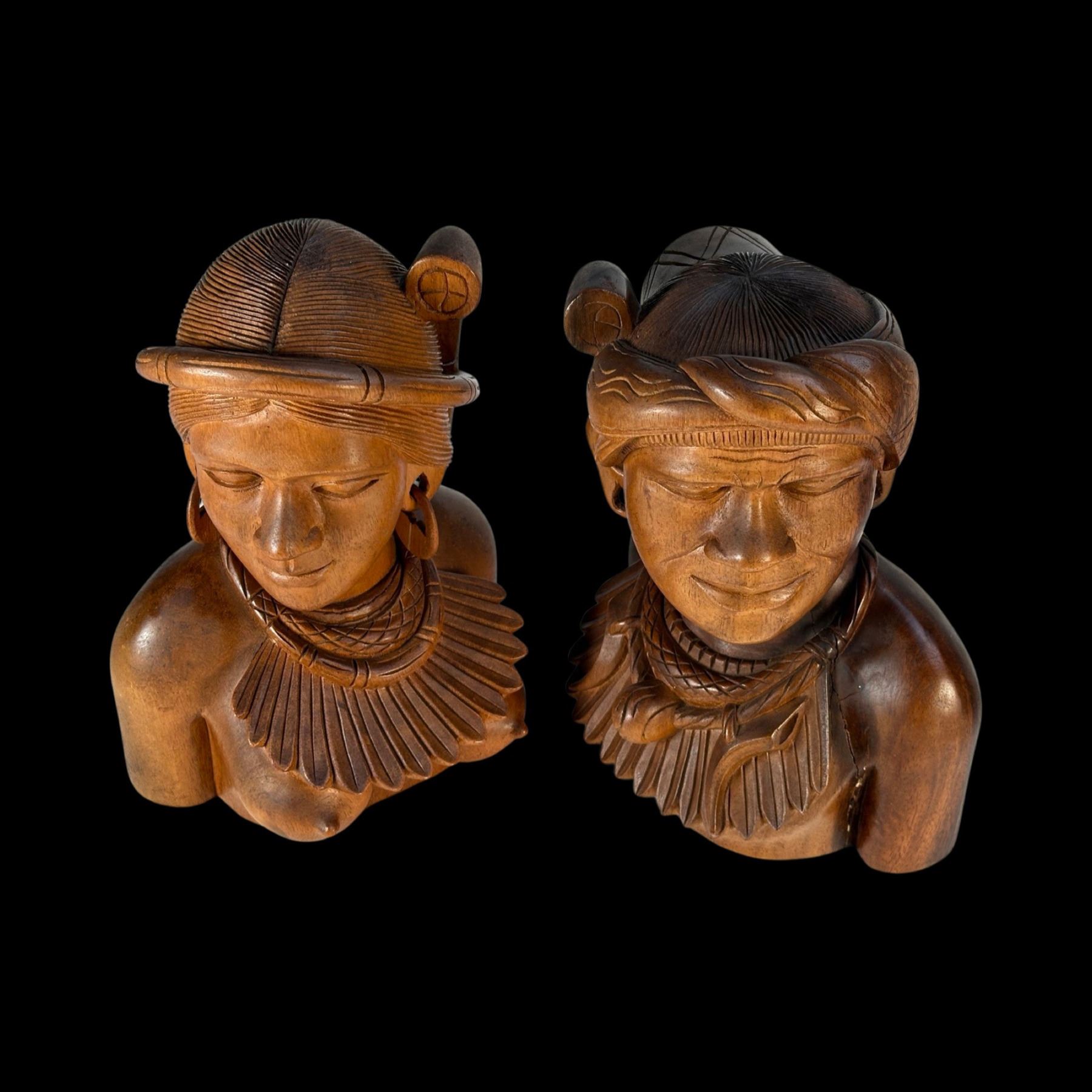 (1960s)* A staple of ethnographic Tiki lounge decor, these sculptures were carved by Igorot carvers and imported for their exotic value. Their natural nudity was part of the National Geographic eroticism used as a temporary escape from mid-century Puritan America. We carried a nice set of these from the Oceanic Arts collection. Overall VG+ with a light stress crack in the wood on the male. 10"x12.25"x8" male, 9"x12.5"x9" female.