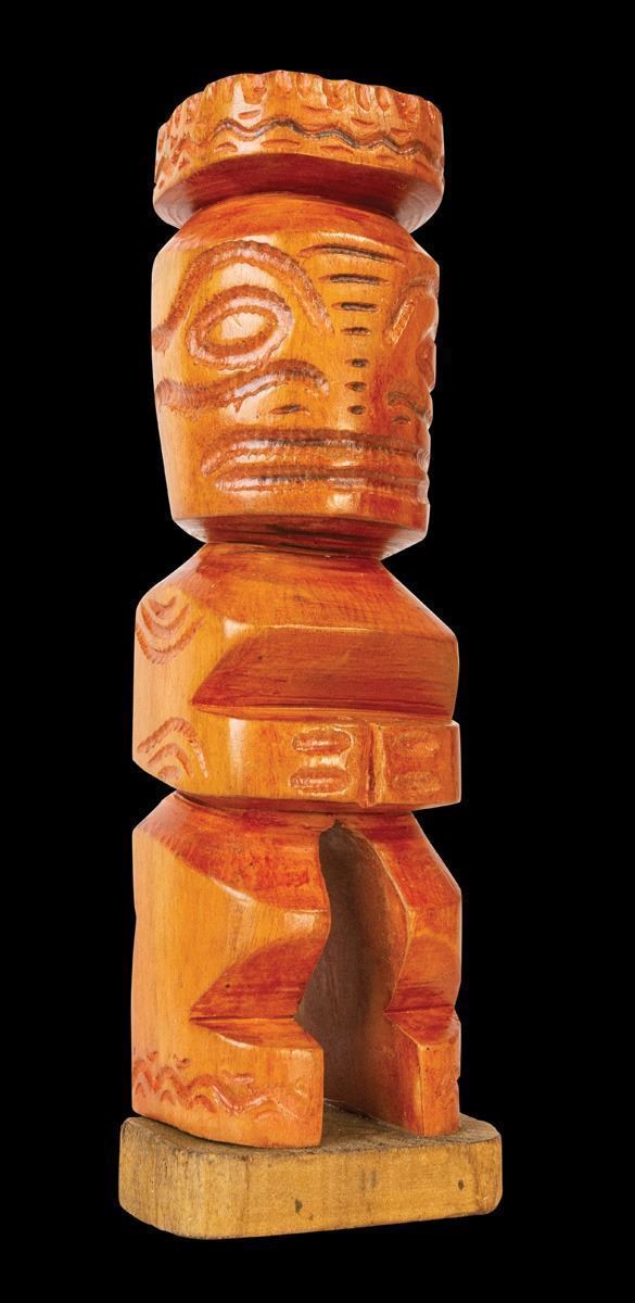 (1960s) A table size figural carving of a Marquesan tiki with headdress. Spindle chocks present.9"x3".VG+ with typical wear.