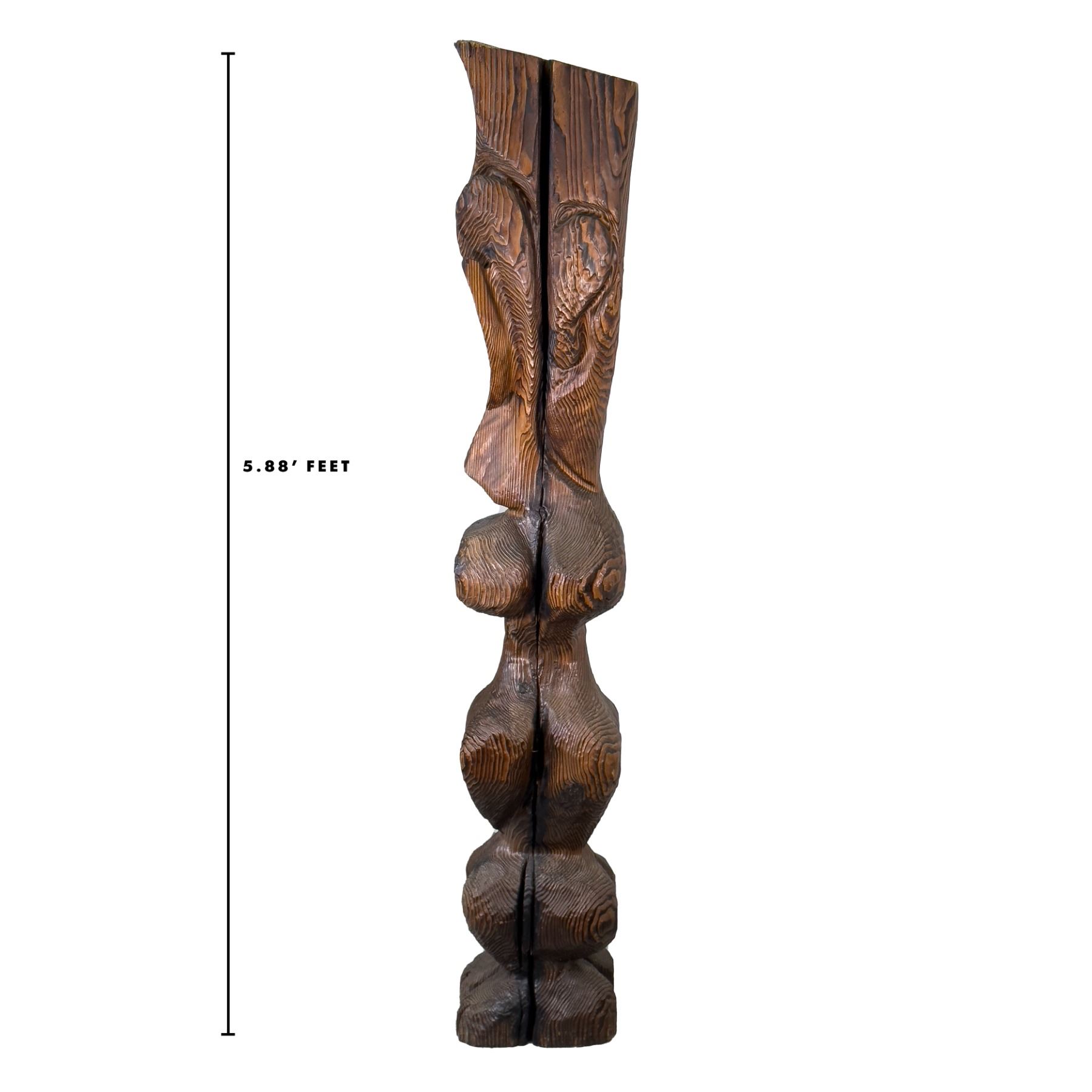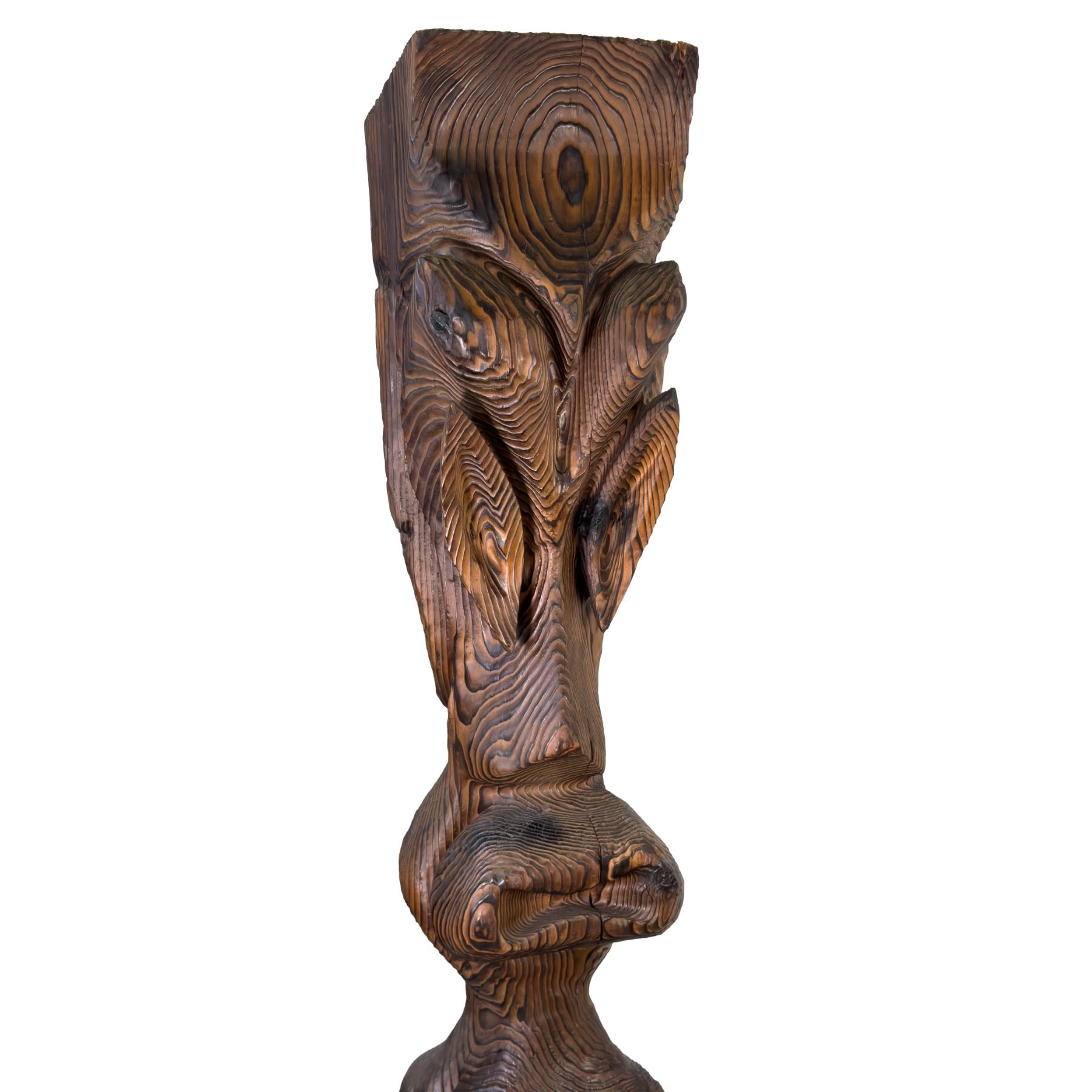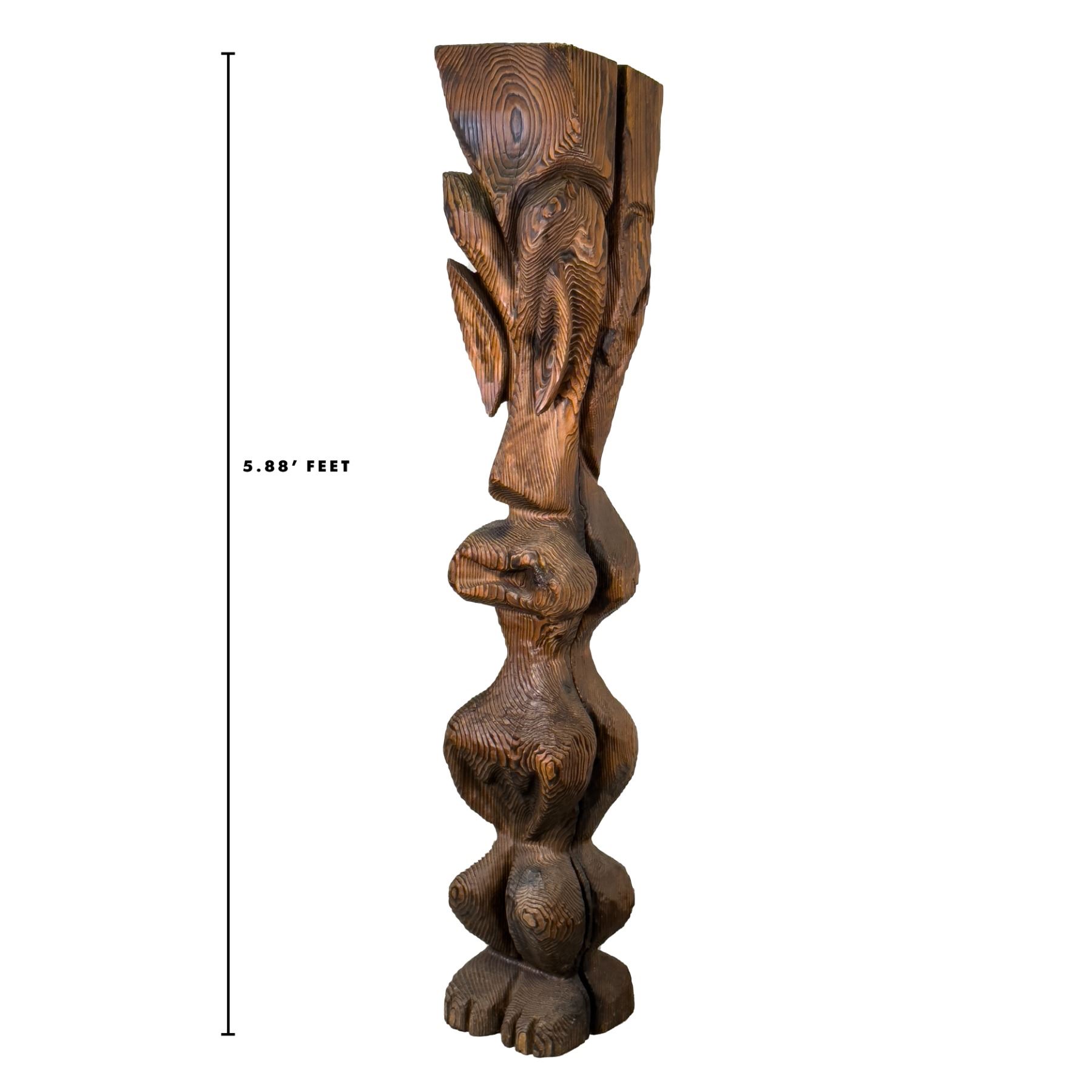 (1960s) Here's a rare specimen neither we nor WITCO afficianado, Sven Kirsten has encountered! A large format, self standing figural Tiki by WITCO. The God of Fortune styled Tiki is by far, one of the finest pieces we have seen to come of Woilliam Westenhaver's shop. The carving is substantial and the detailed carving is exquisite. Some wear and repaired chipping to the very top temple of the head, otherwise, its an excellent survivor. One will be hard pressed to find a WITCO piece of this quality as this style was surely made in limited numbers. 70.5"x12"x12". VG+ with some wear and chipping.