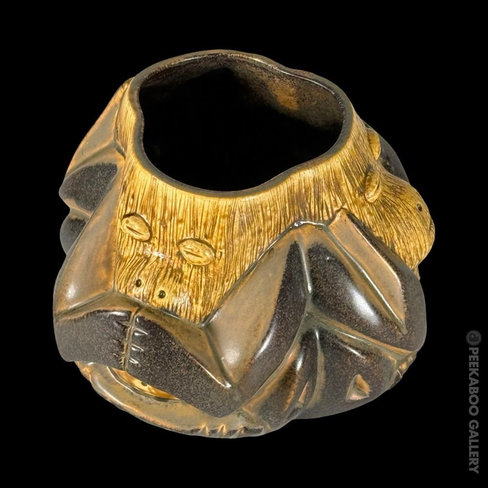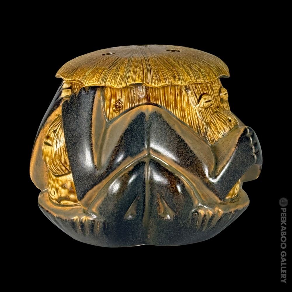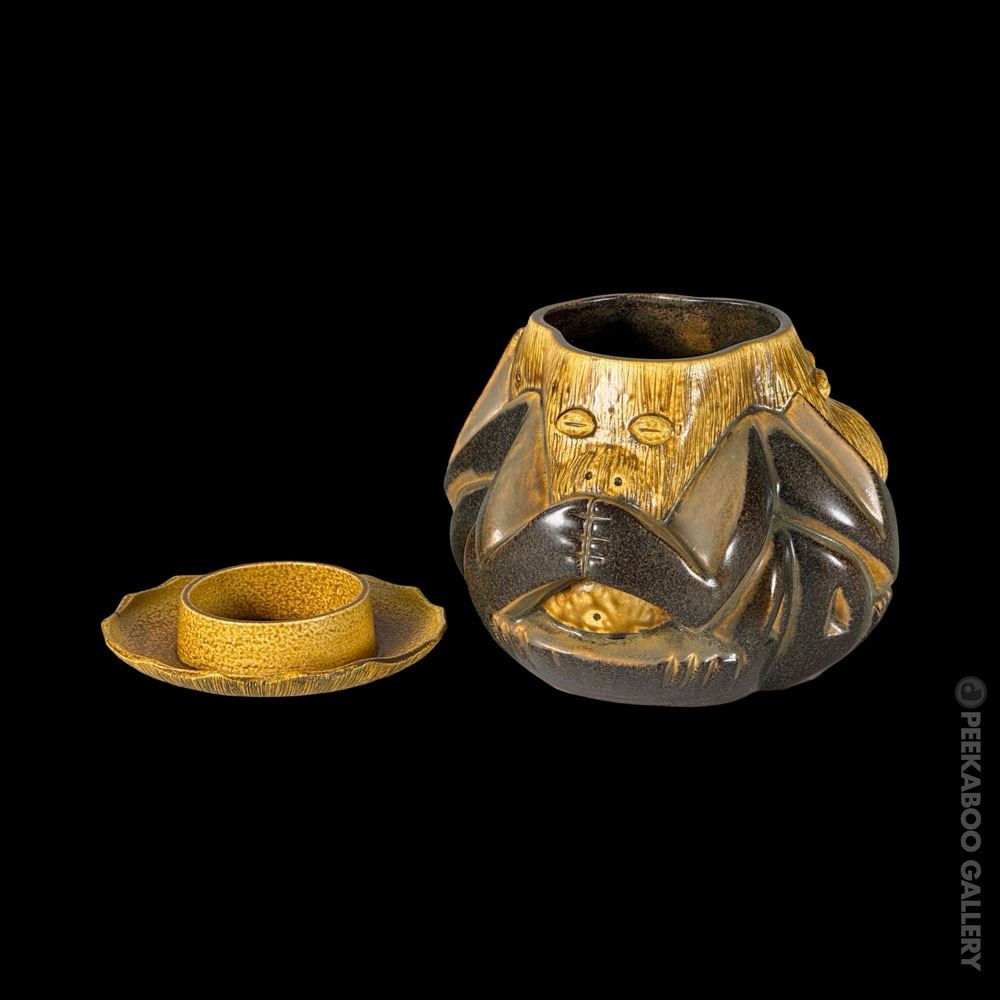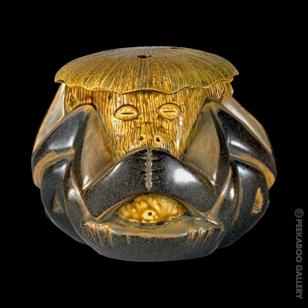 (2016) Simply one of the coolest mugs ever made! Paul Nielsen of Munktiki managed to top his incredible Coconut Monkey line with this three sided masterpiece. The ingenious sculpt incorporates three "carved" sides into a coconut, this time shaping the proverbial Japanese "Three Wise Apes": "Hear No Evil", "See No Evil" and "Hear No Evil". This mug is substantial in weight and size and of course, has the straw hat topper. Limited to 100 pieces, this has to be one of the largest in their mug line. Numbered #65/100. VG+. 6"x8" dia w/ lid.