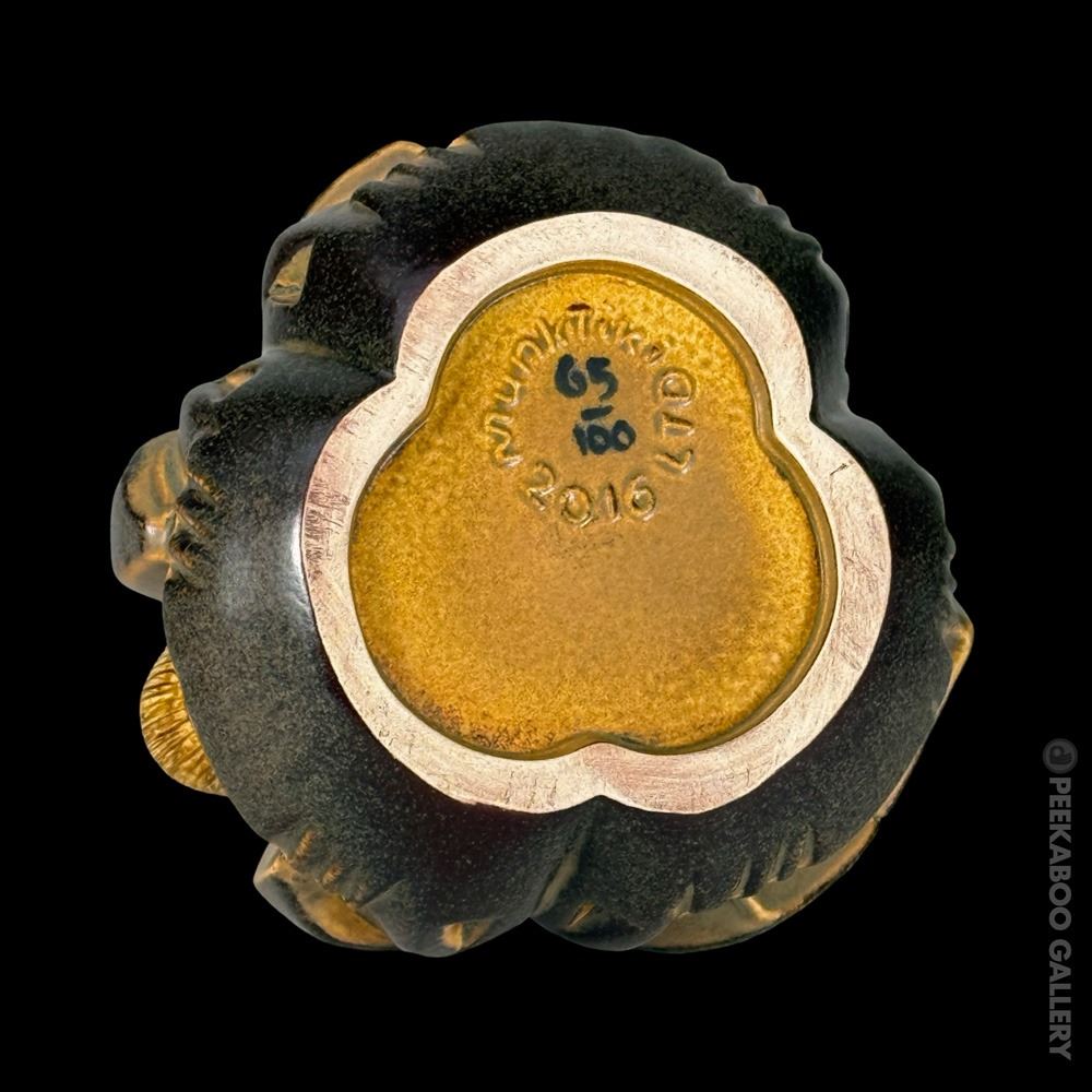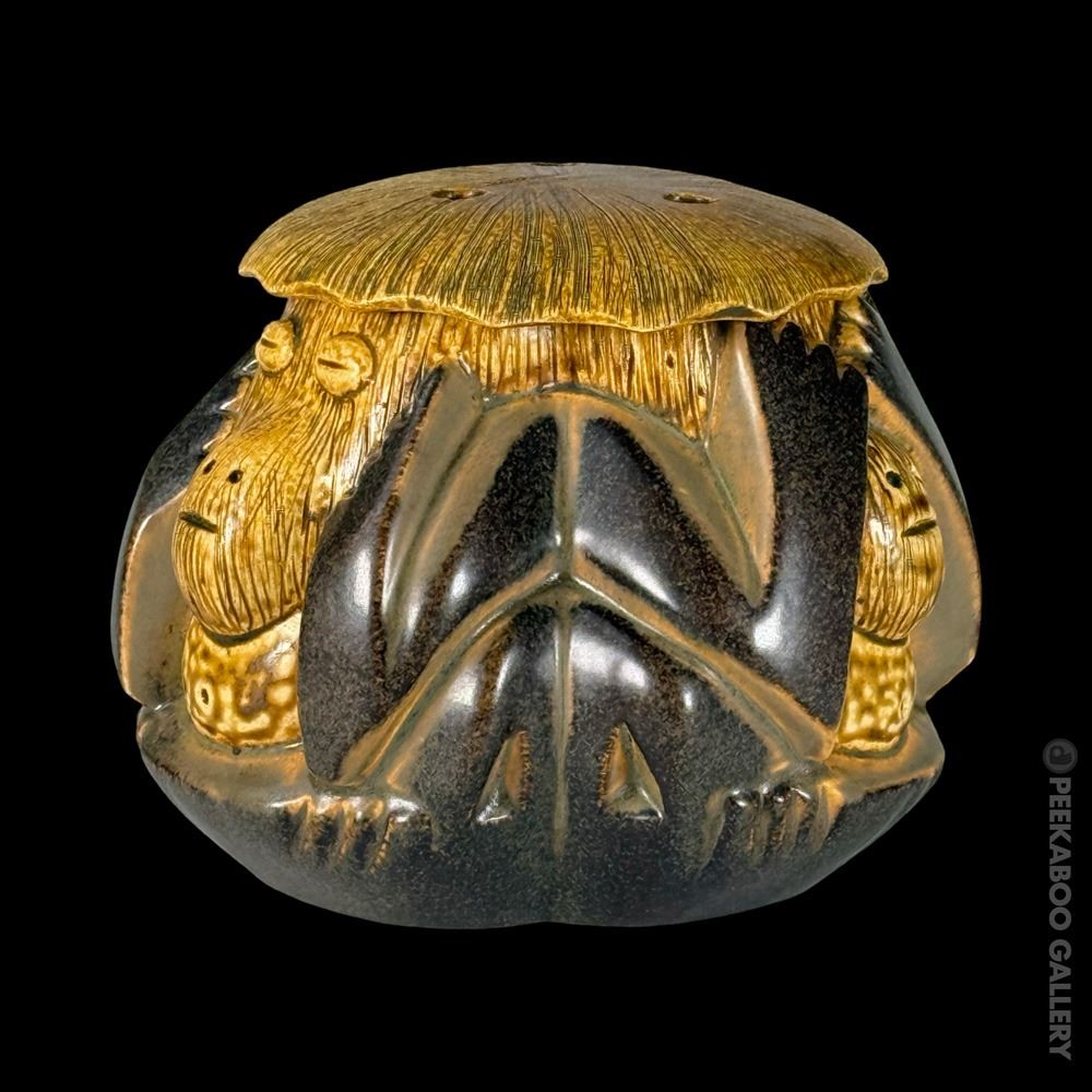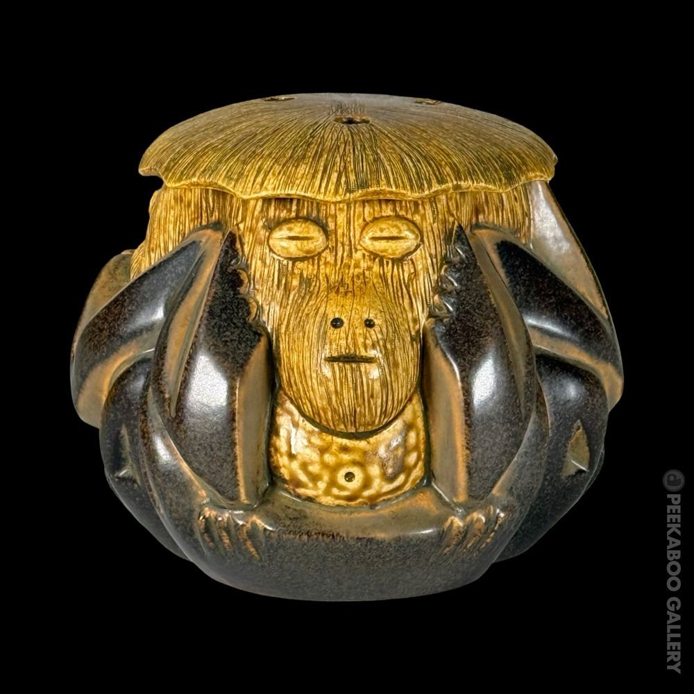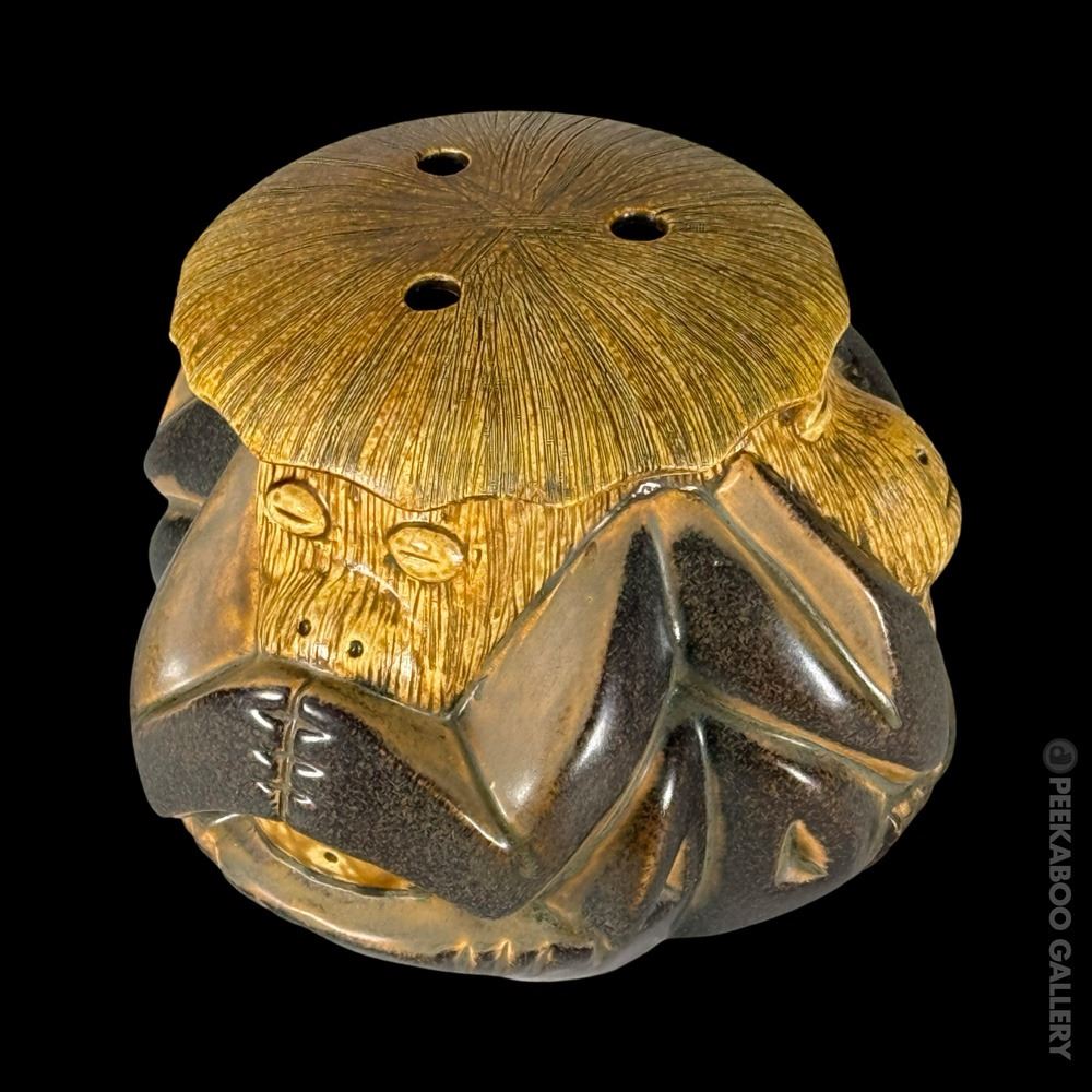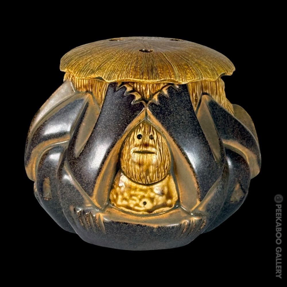 (2016) Simply one of the coolest mugs ever made! Paul Nielsen of Munktiki managed to top his incredible Coconut Monkey line with this three sided masterpiece. The ingenious sculpt incorporates three "carved" sides into a coconut, this time shaping the proverbial Japanese "Three Wise Apes": "Hear No Evil", "See No Evil" and "Hear No Evil". This mug is substantial in weight and size and of course, has the straw hat topper. Limited to 100 pieces, this has to be one of the largest in their mug line. Numbered #65/100. VG+. 6"x8" dia w/ lid.