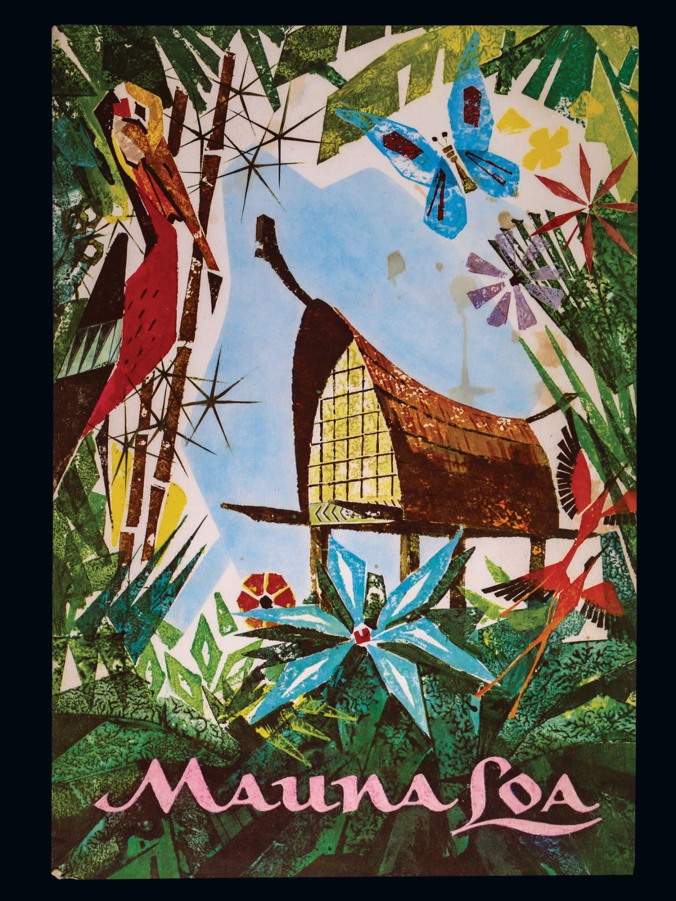 (1960s) Simply gorgeous and rare menu for the short lived Mauna Loa restaurant in Detroit, Michigan. No relation to the Mauna Loa in Mexico other than it was perhaps inspiration for this ill-fated venture. The Mauna Loa was a case-book example of a restaurant planned at the height of the Polynesian Pop craze but opening once the bubble had burst. Filled with handsome illustrations. VG+. 10.75"x15.75" closed.