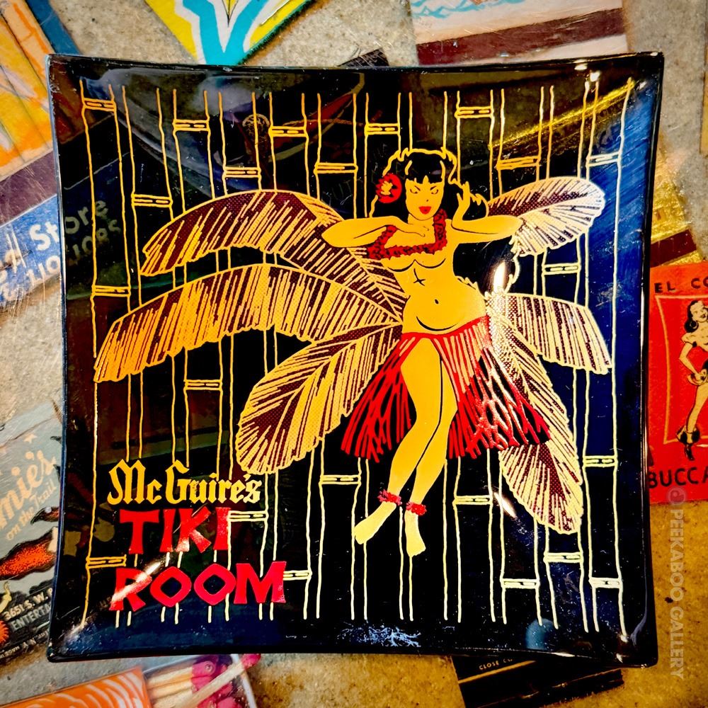 (1960s) One of the most classic of the smoke glass ashtrays, this one featuring a bamboo screen background and lovely hula dancer. VG+. 5.25"x5.25".