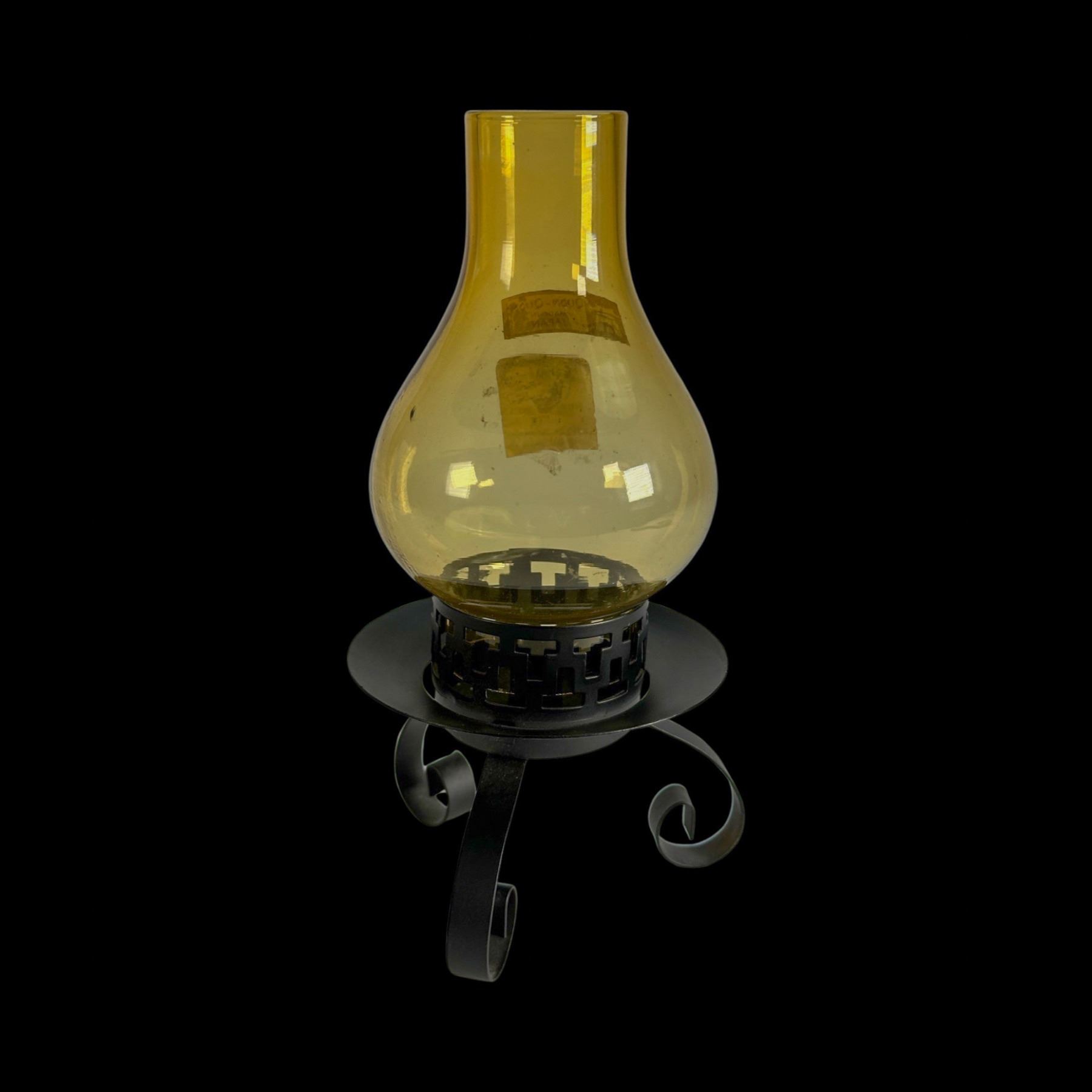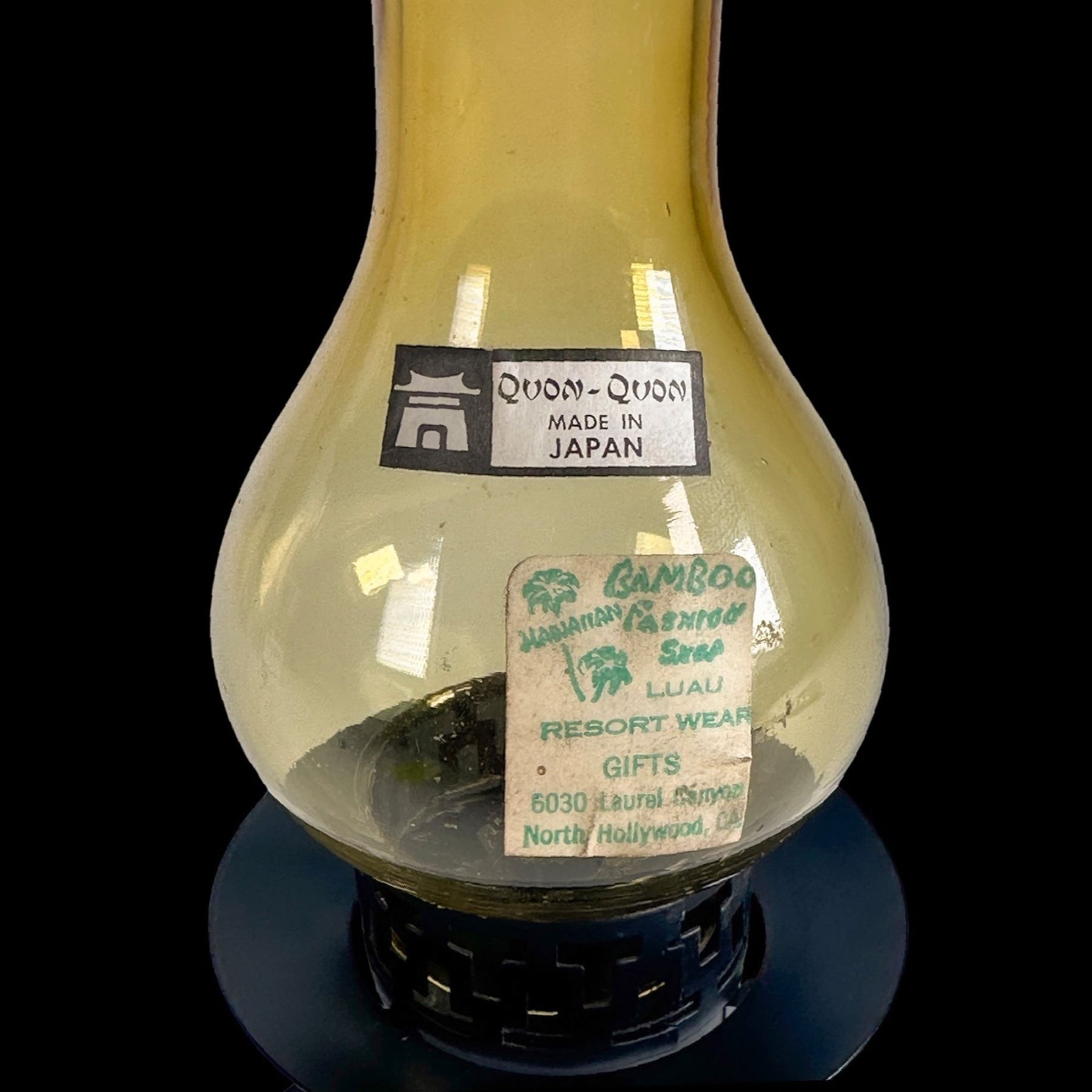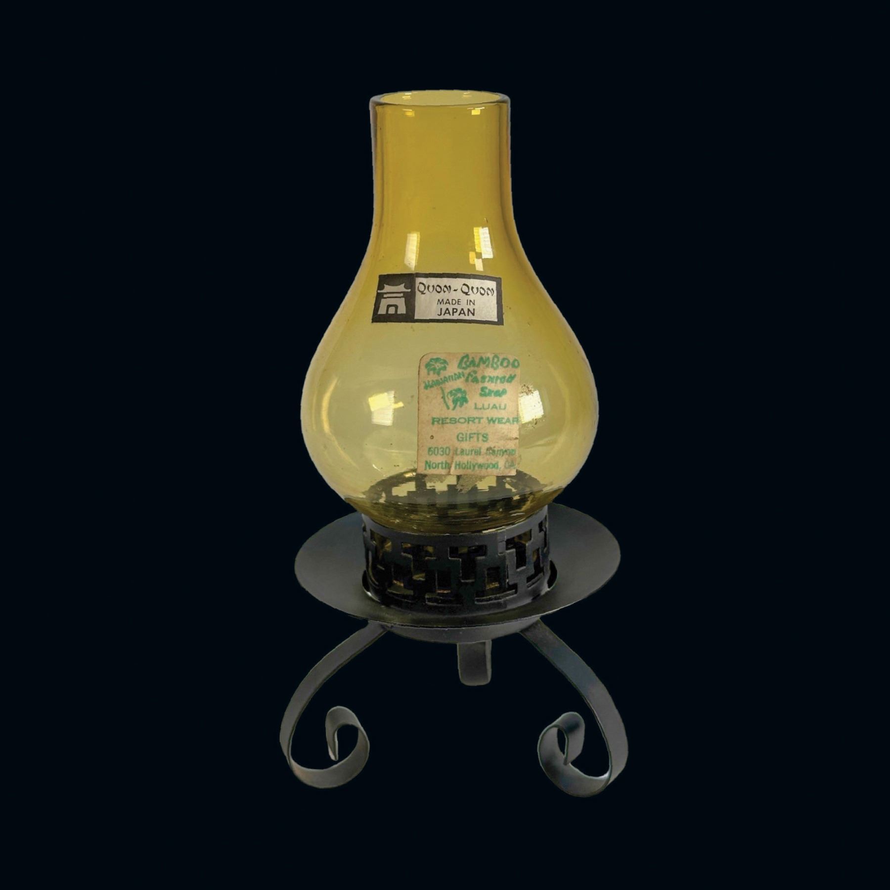 (1960s)* Quon-Quon was an import supplier of "exotic" goods very much in the same vein as Orchids of Hawaii. The glass chimney retains a sticker label from The Bamboo house located in North Hollywood on Laurel Canyon Blvd in Los Angeles. VG+. 3.75"dia x 7.5".