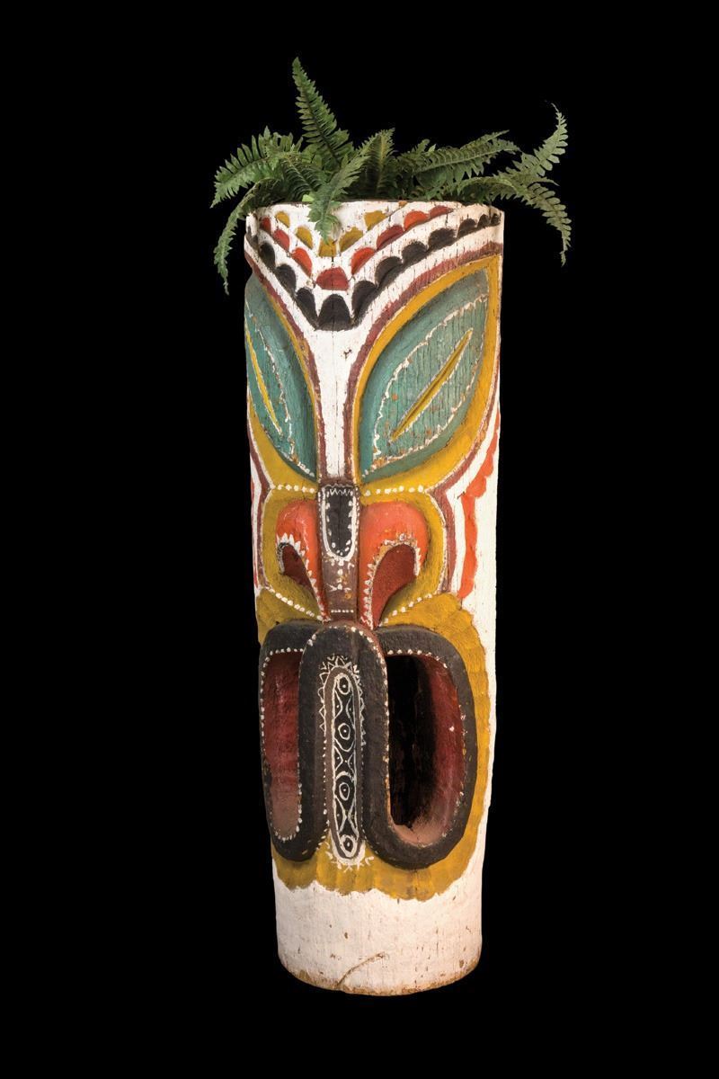(1960s) A carved palm tiki by carving legend, Milan Guanko. This was either traded or sold to OA by Gunako in the 1960s and was part of the Luau Rentals inventory ever since. The top hollowed out for use as a planter. It comes with the plastic foliage as seen.46"x15.5"VG+ with typical wear
