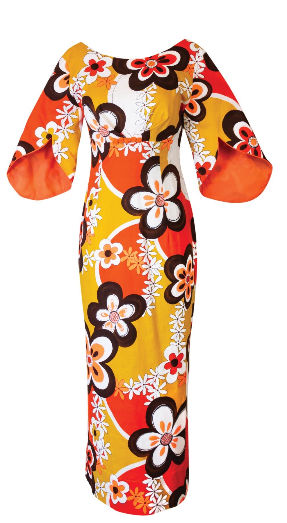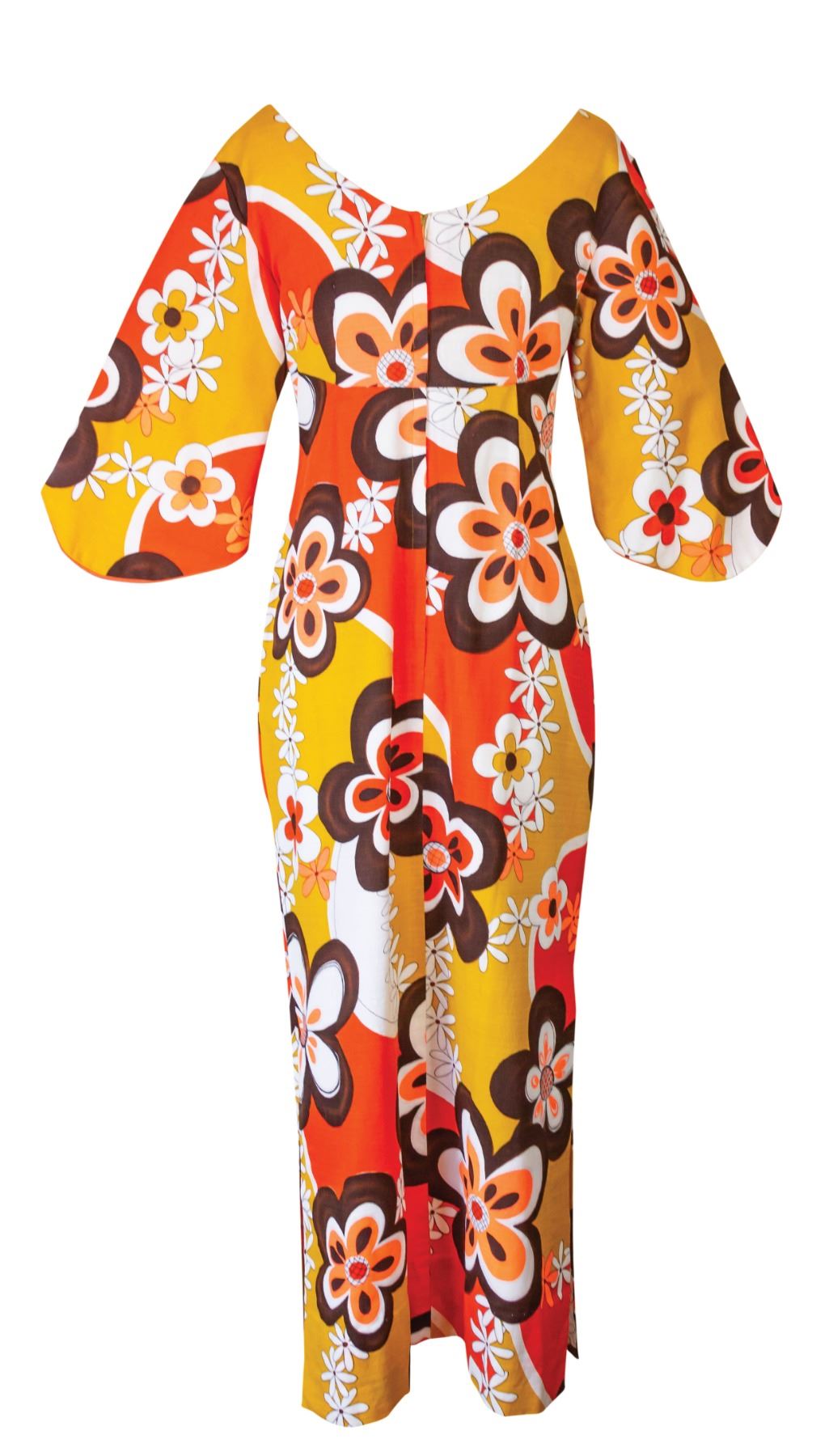 (1970s) Dress Chest 18" across, Waist 15" across, Length 46". VG+ with typical wear.