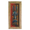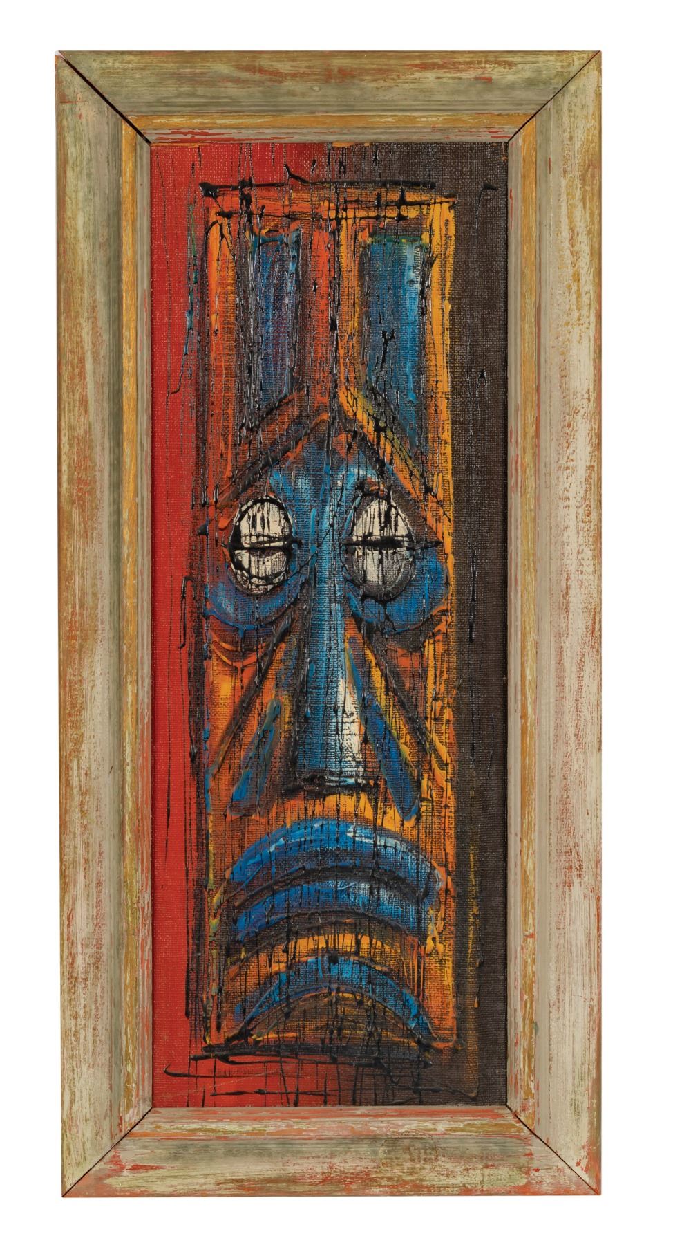 (1960s) Did this invent the "Sad Tiki School" of painting? Wonderful mod take on Moai Tiki. Striking, vivid colors of blue, white, orange, and reds create the base image with thin black lines cascading over the face. Brushed white wood frame. Displays beautifully.16.5"x34". VG+.