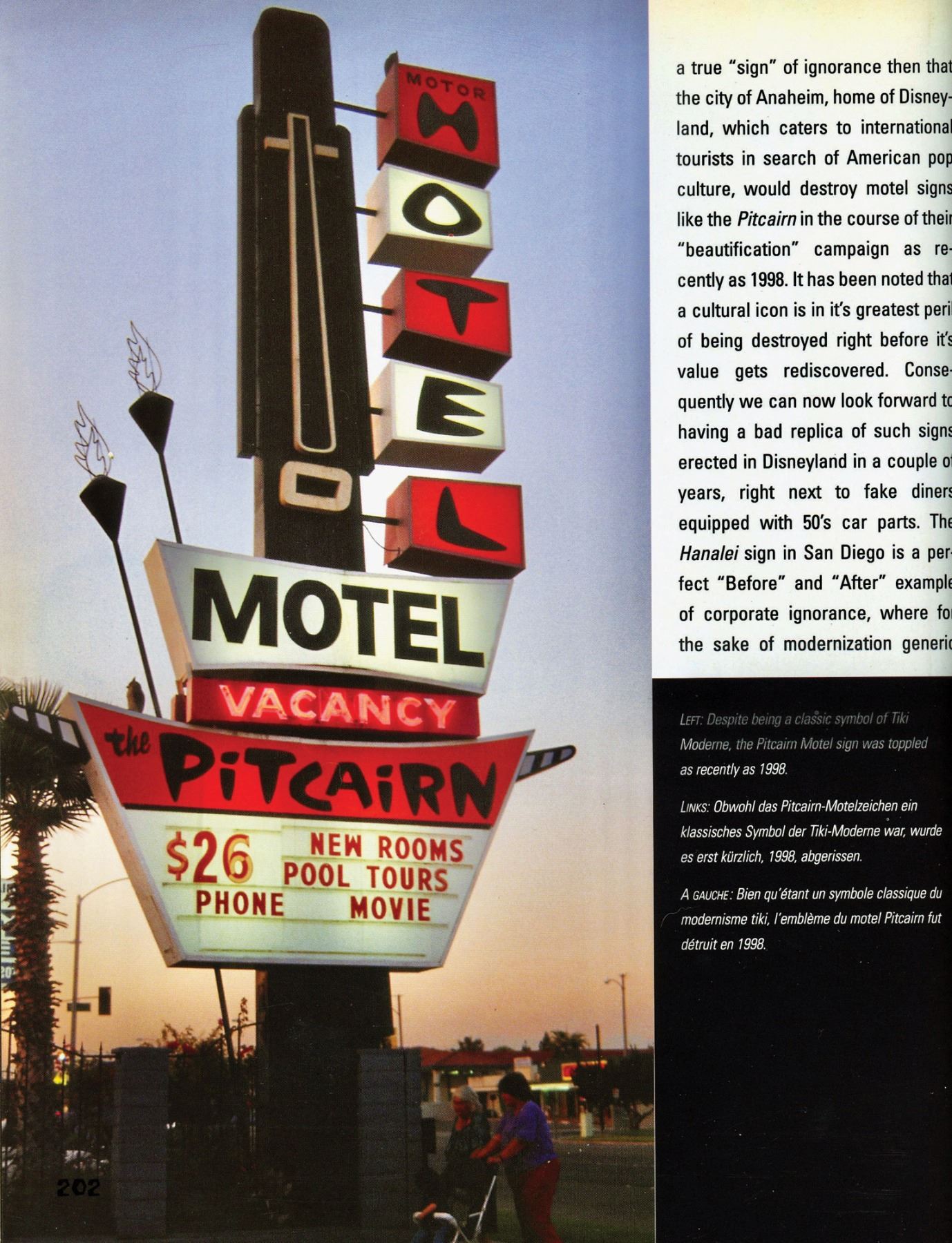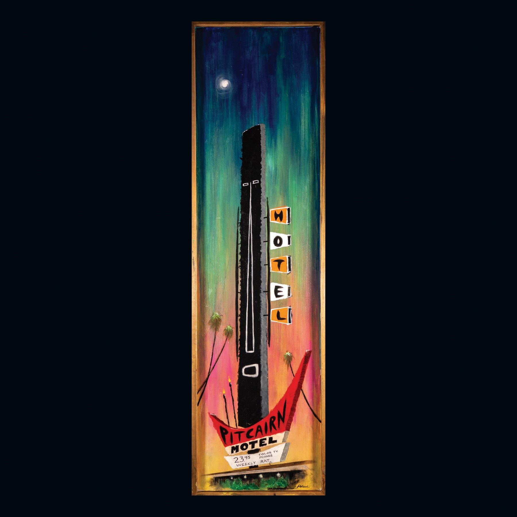 (2000s)* A wonderfully stylized depiction of the iconic Pitcairn Motel sign as shown in THE BOOK OF TIKI, pp202. VG+. 12.5"x46.5" painting, 13.75"x47.5" frame.
