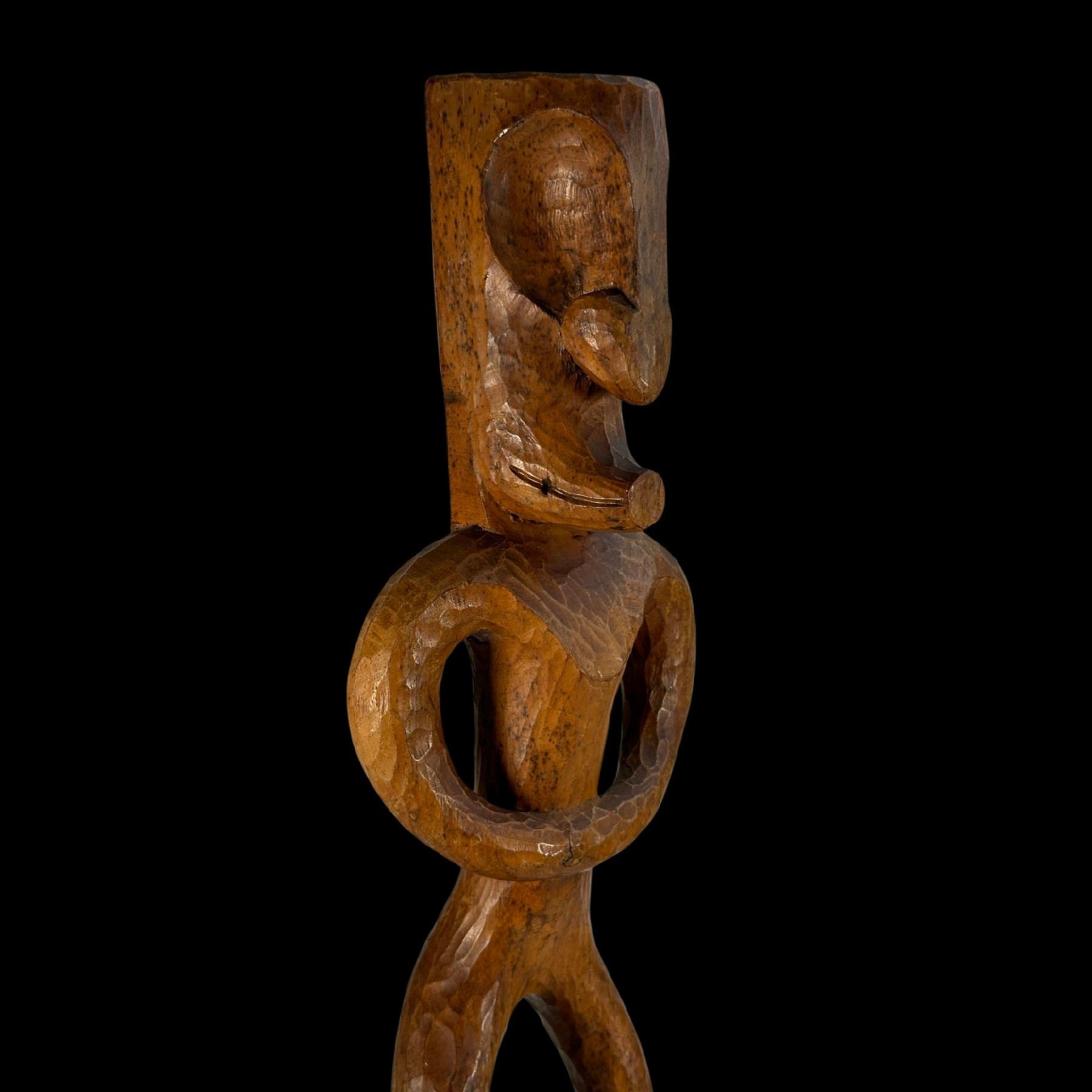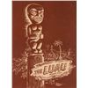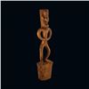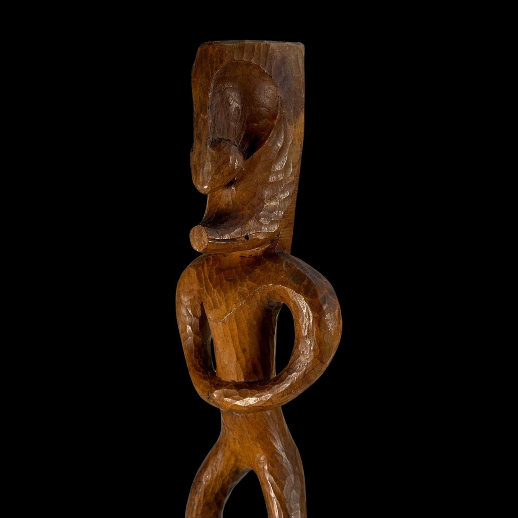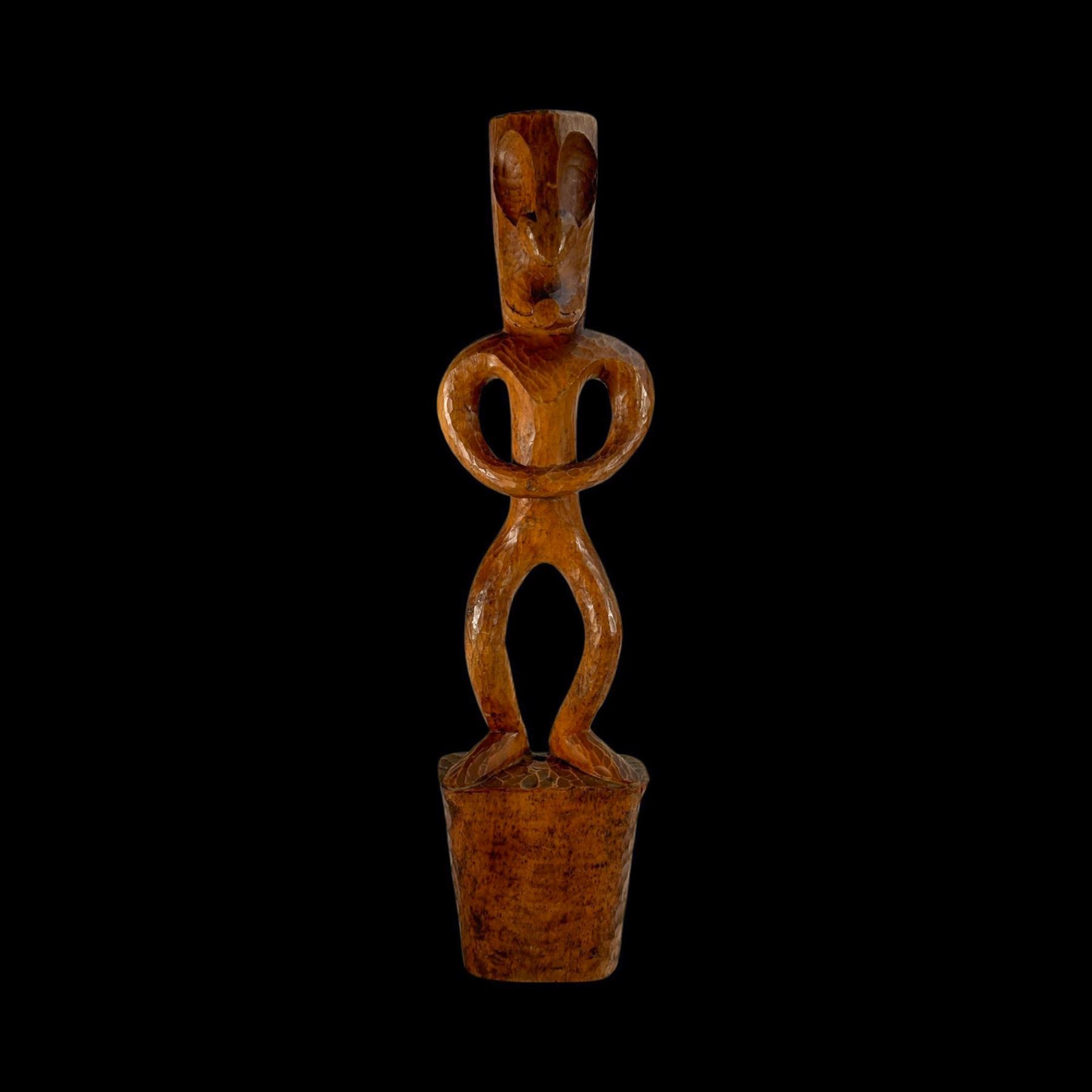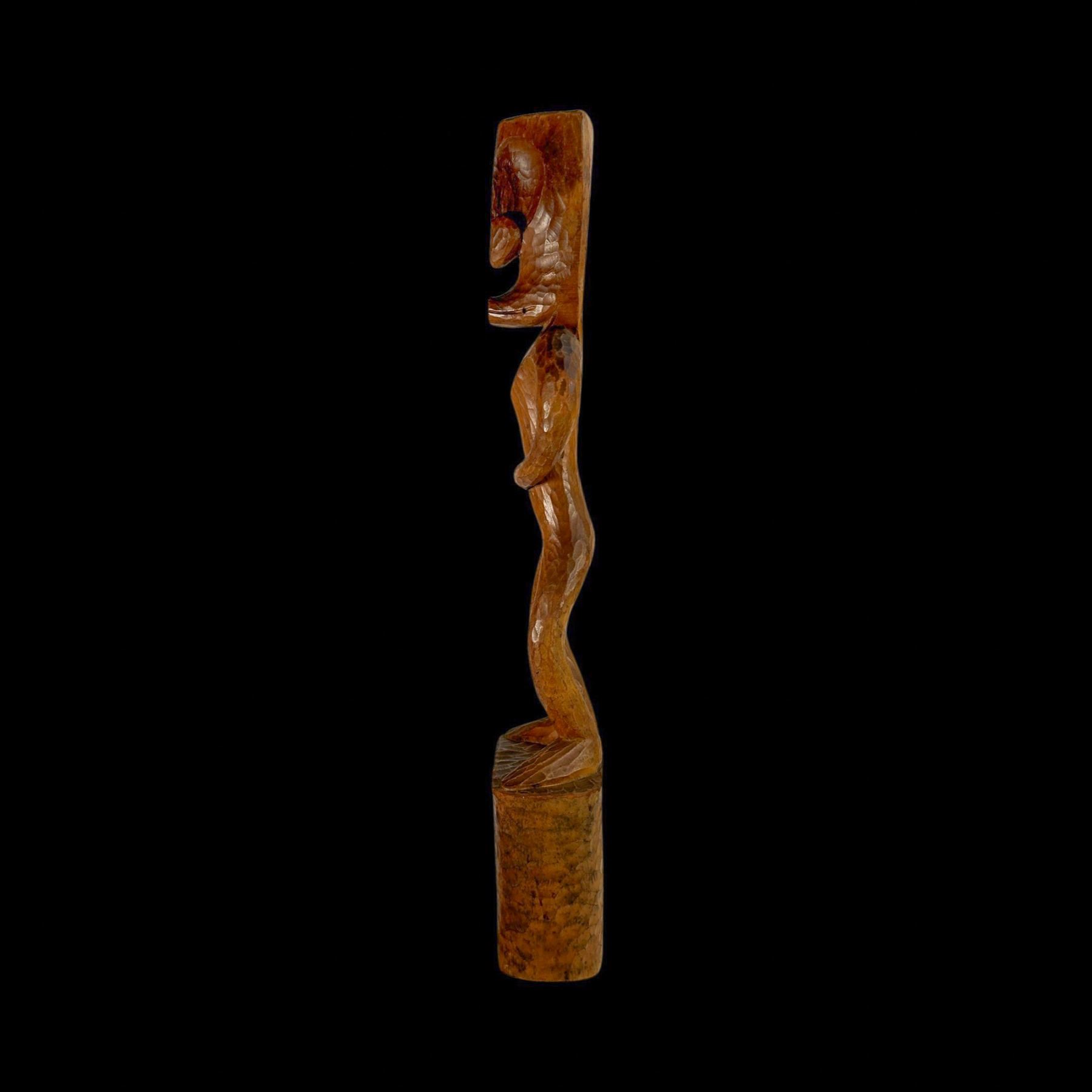 (1950s)* Displayed at Musee Quai Branly Paris, published in TIKI POP page 227. A seven foot version of this unusual Tiki stood at the Luau in Beverly Hills. That original Tiki was provided by Oceanic Arts from their catalog #124 "TIKI FIGURE". The original at The Luau was stolen, eventually recovered, and finally migrated to the Hanalei Hotel from where it then, again disappeared. This hardwood sculpt is highly stylized and features a hefty plinth base. VG+. 5.75"x21.5"x3".