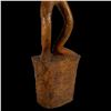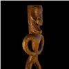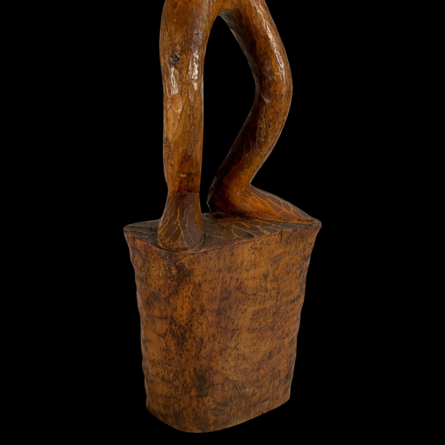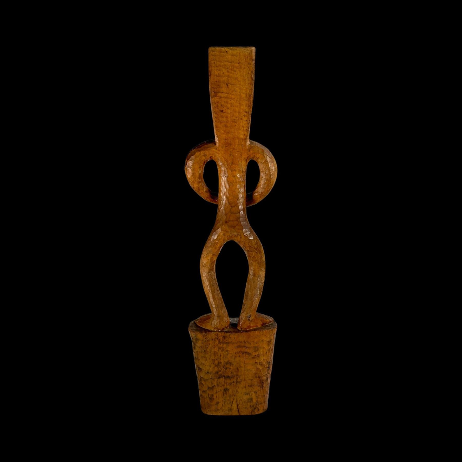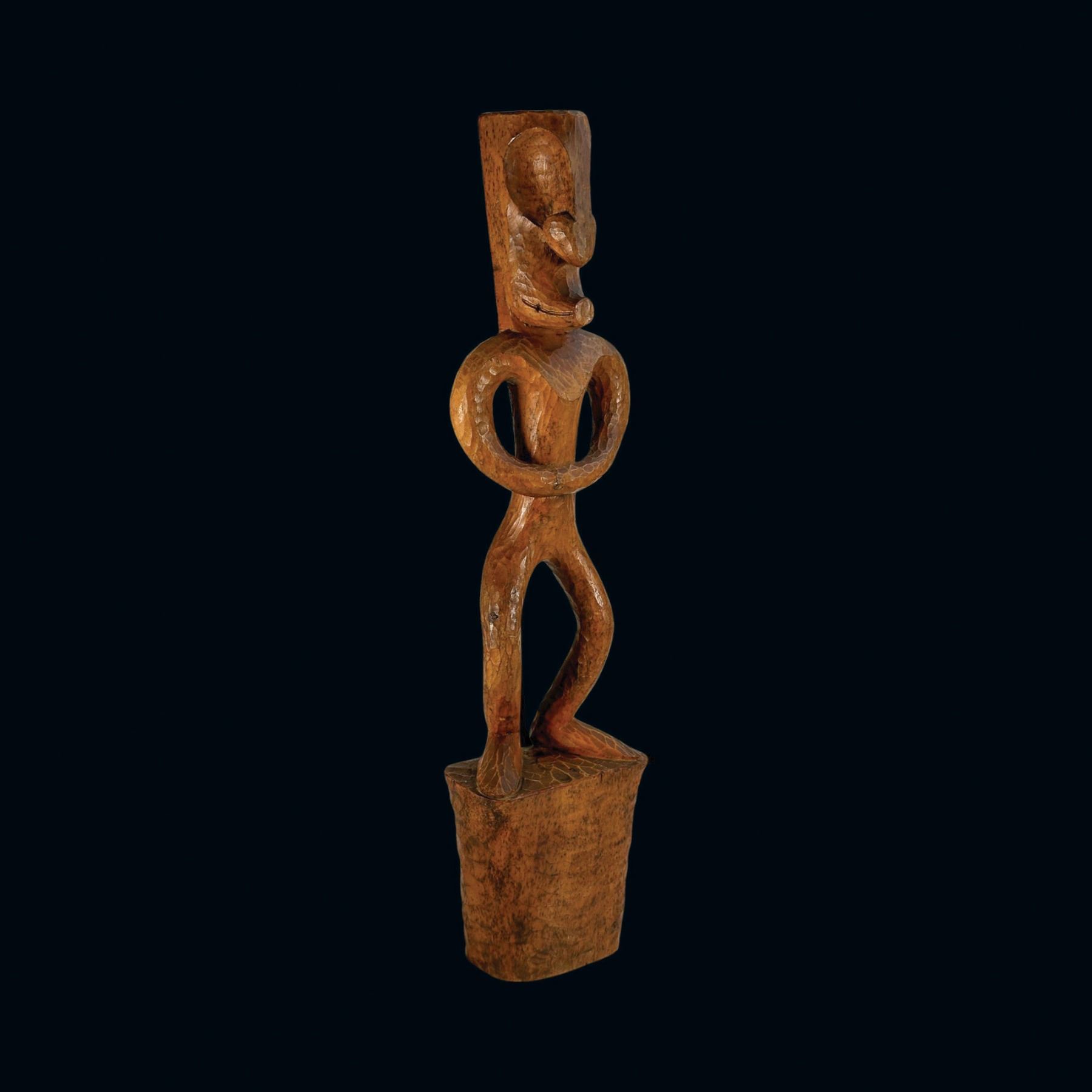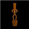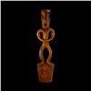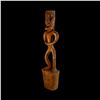 (1950s)* Displayed at Musee Quai Branly Paris, published in TIKI POP page 227. A seven foot version of this unusual Tiki stood at the Luau in Beverly Hills. That original Tiki was provided by Oceanic Arts from their catalog #124 "TIKI FIGURE". The original at The Luau was stolen, eventually recovered, and finally migrated to the Hanalei Hotel from where it then, again disappeared. This hardwood sculpt is highly stylized and features a hefty plinth base. VG+. 5.75"x21.5"x3".