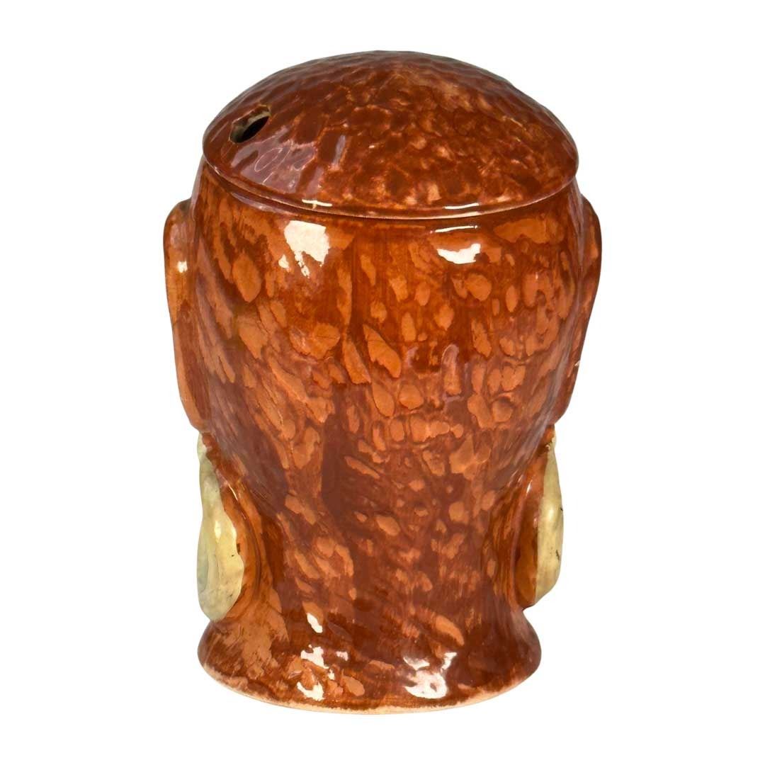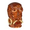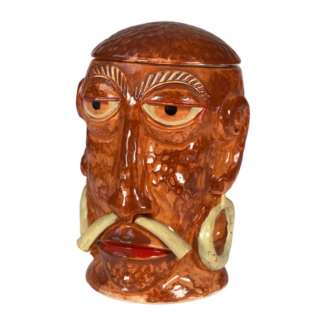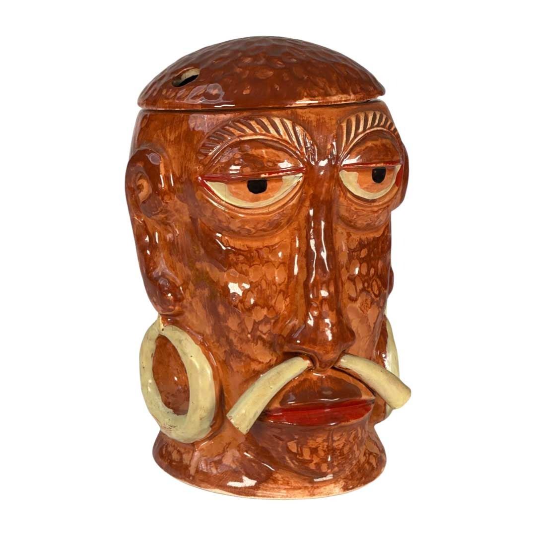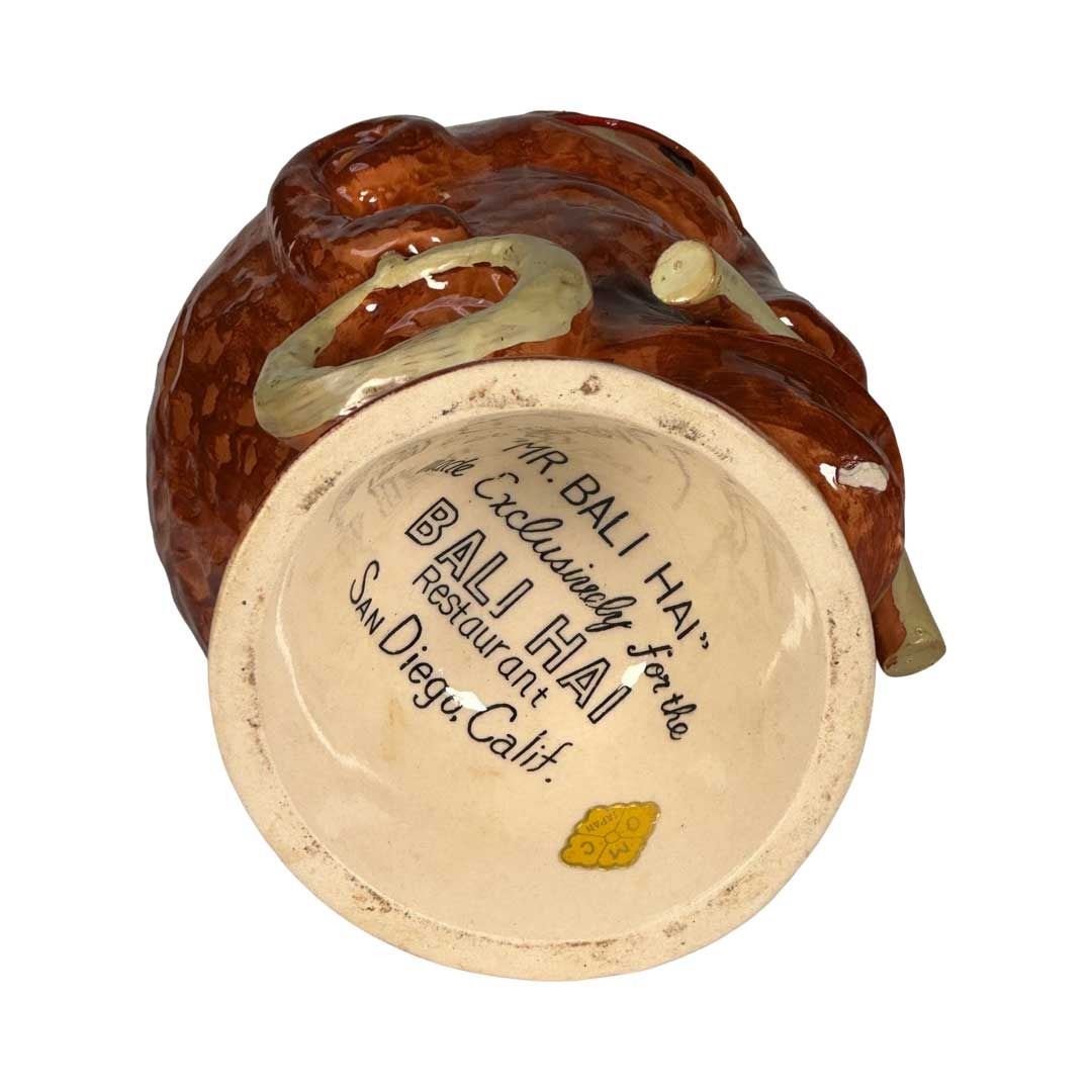 (1960s) Here is one of the most famous and unique Tiki mugs ever produced. Mr. Bali Hai was produced for the incredible restaurant and bar venue on Shelter Island, San Diego, California. Marked on the bottom and includes the removable lid with straw holes. This is an earlier issue of this mug Retains OMC sticker. Mug 6"x4.25" w/ lid 7"x4.25". VG with lights stress crack and typical wear.