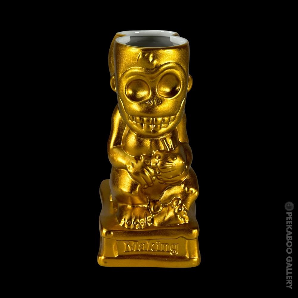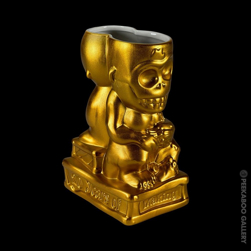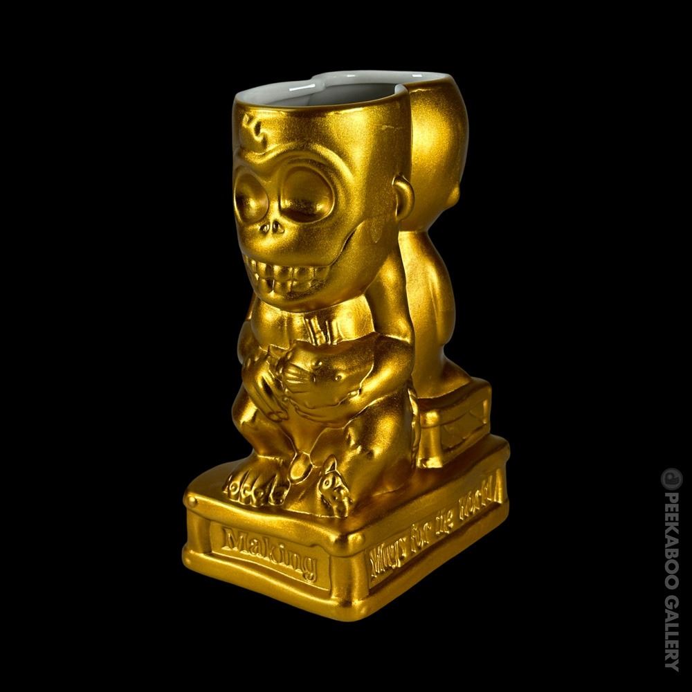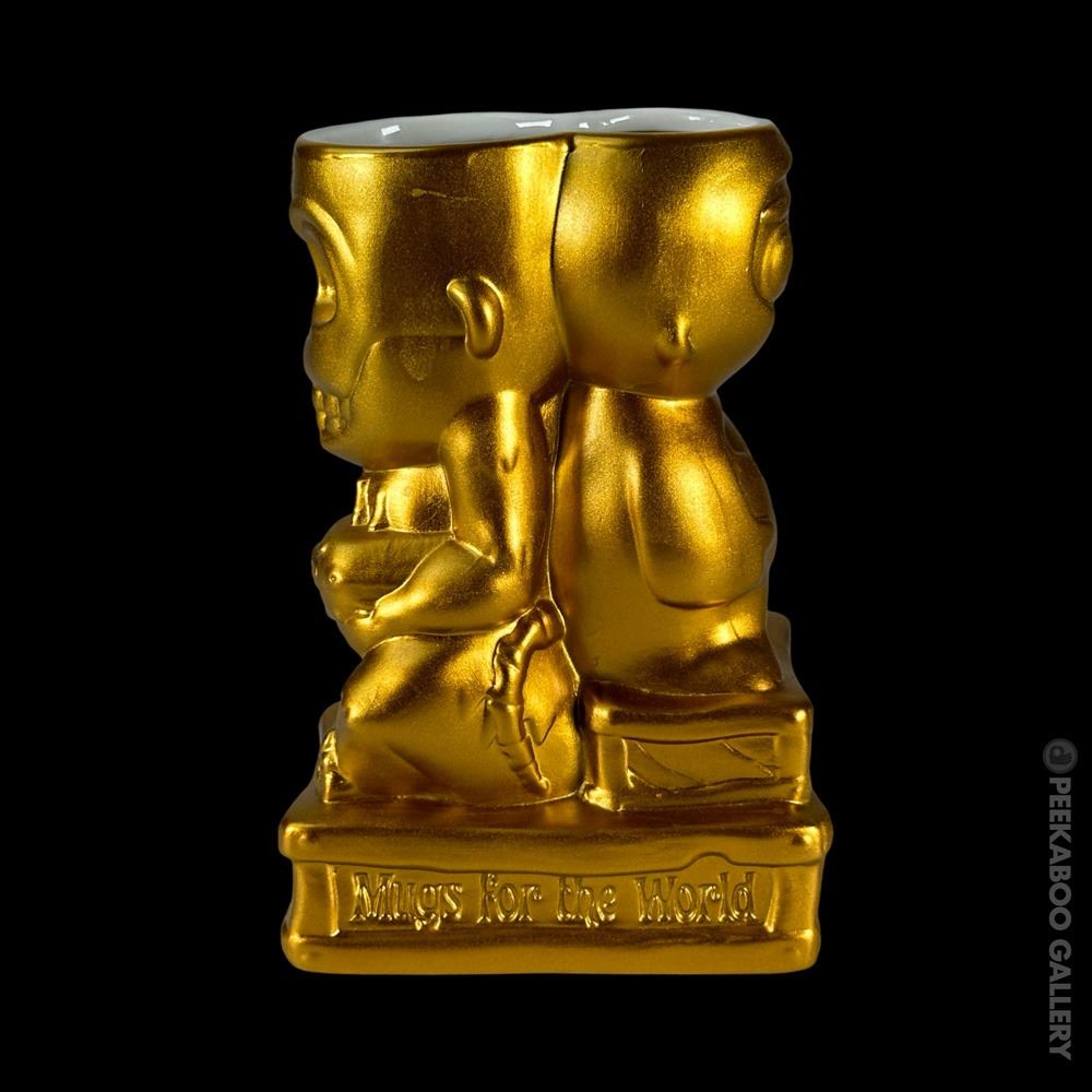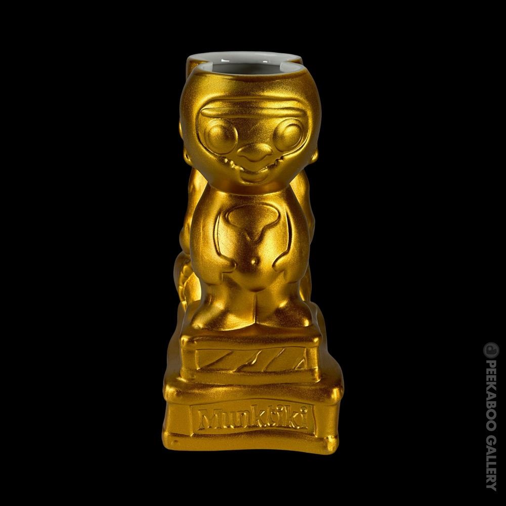 (2020) This double sided mug is a collab between father and son, the founders of MUNKTIKI, each taking a side for character of their choice. The gold coloring denoting the occasion of the anniversary. VG+ in orig box. 3.5"x7.75"x5.5".