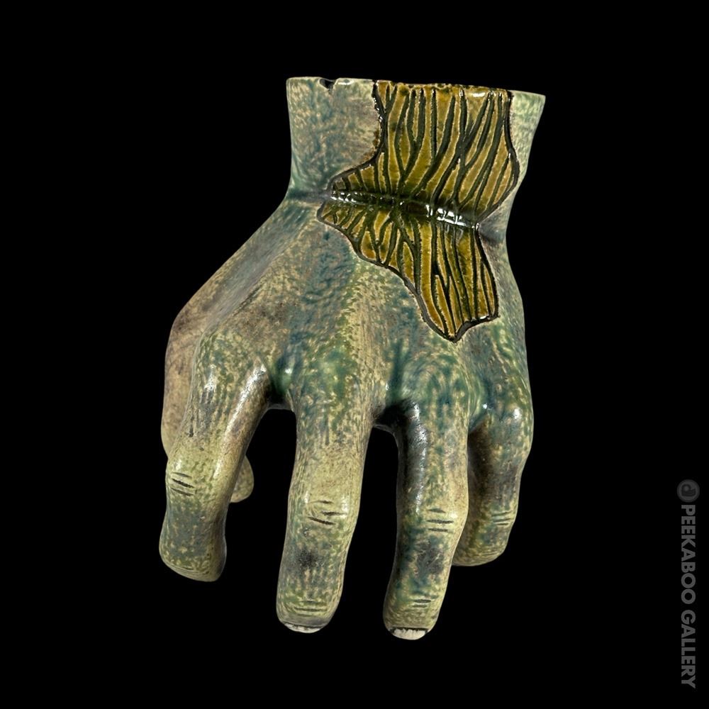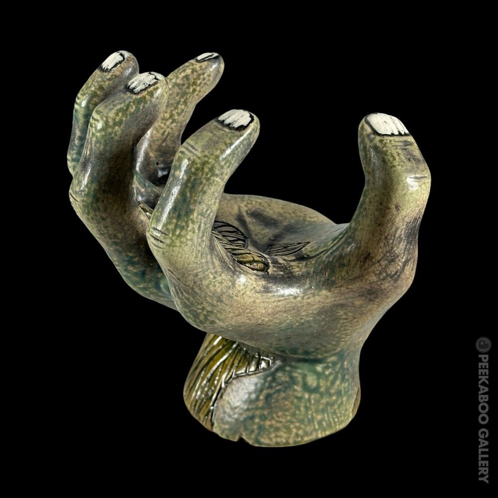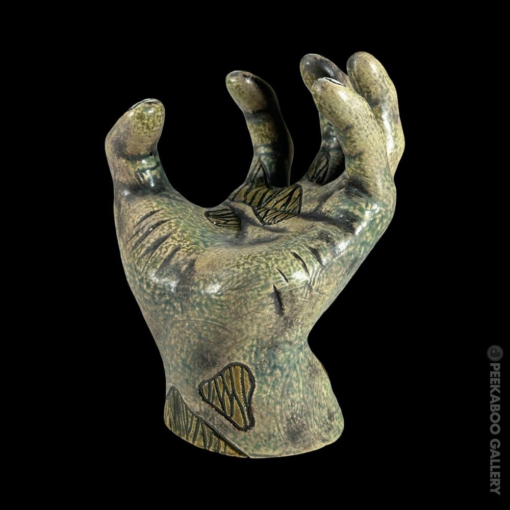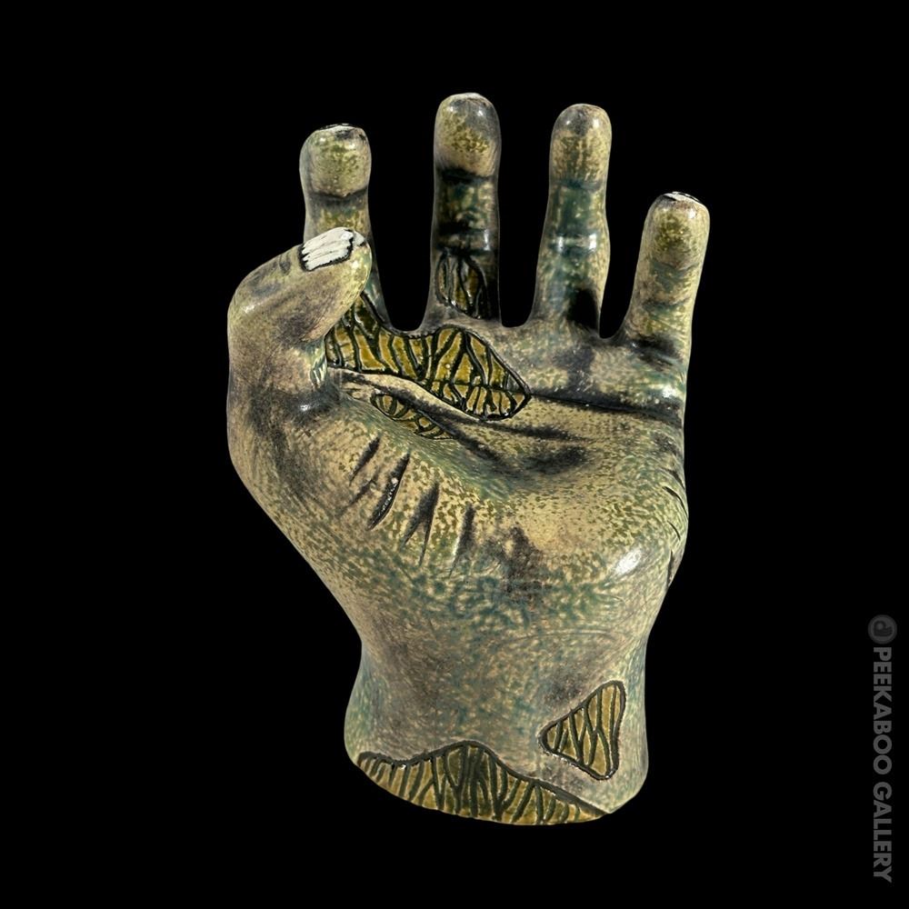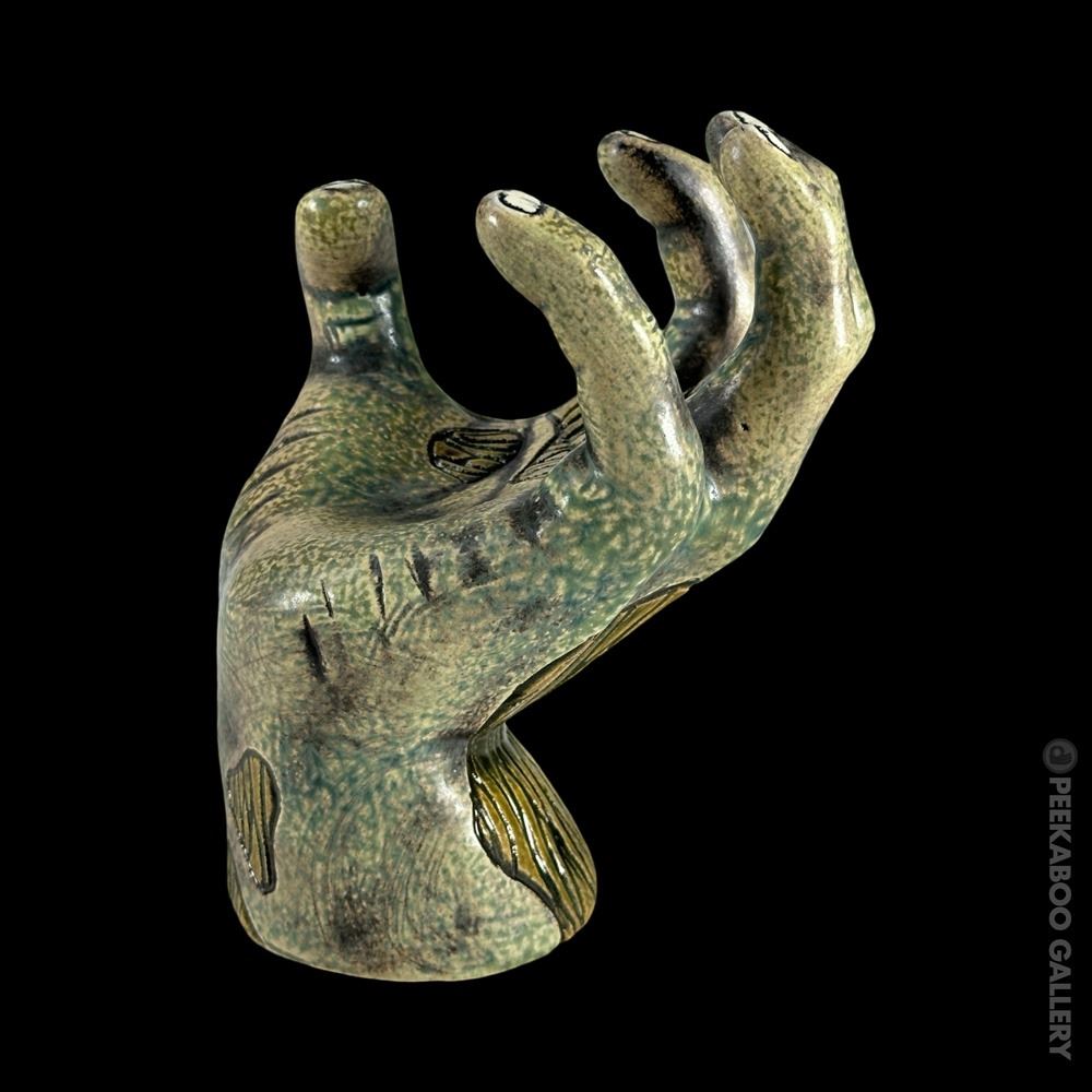 (2011) Another amazing limited line by Munktiki. This "mug" is an incredible sculpt, produced in a small number of 100, although for the most part, each one is unique. The accents of every mug was customized with variant versions of colors and ripped flesh/bone. No two are alike. The mug stands on its fingers or on the severed wrist. VG+. 5.75"x5"dia.