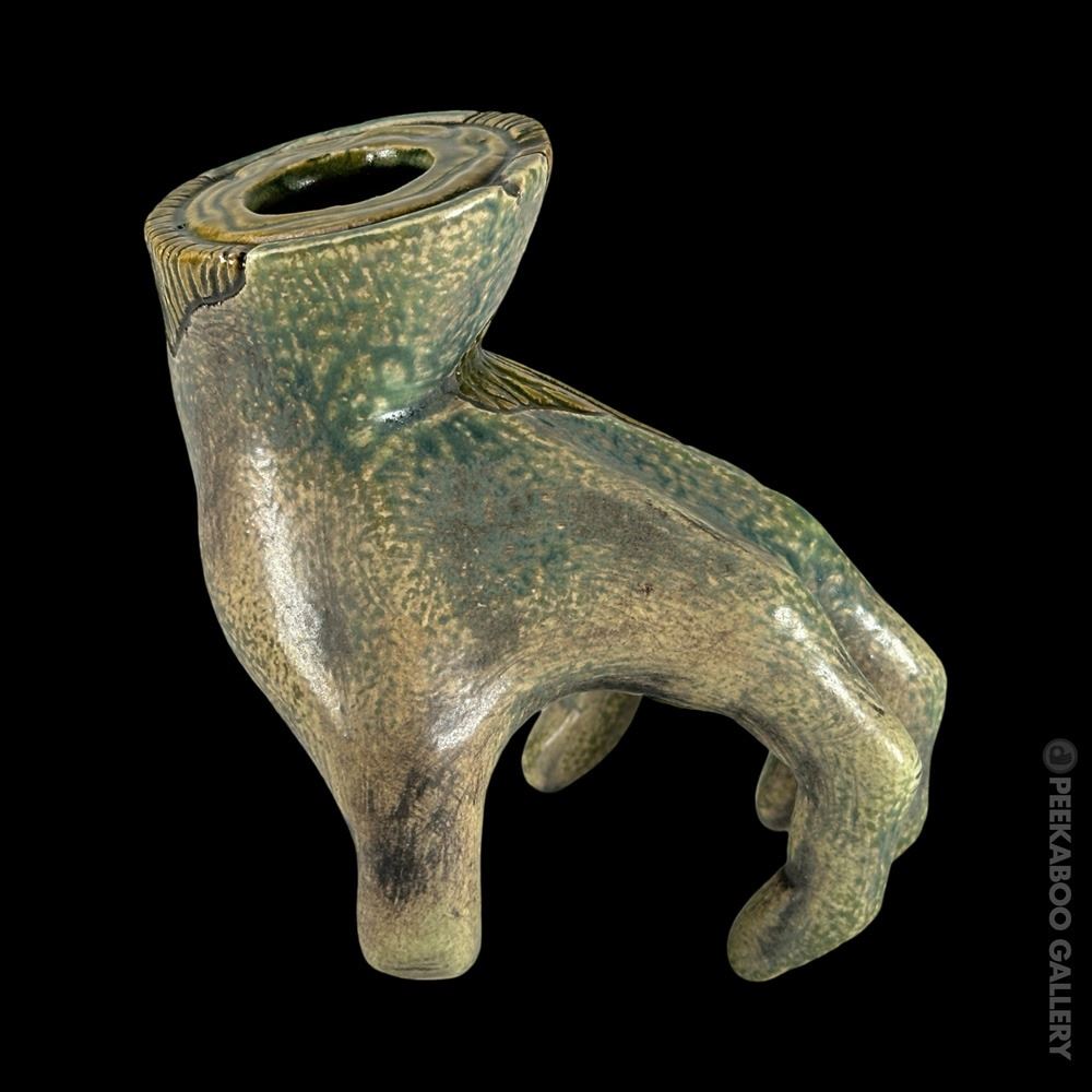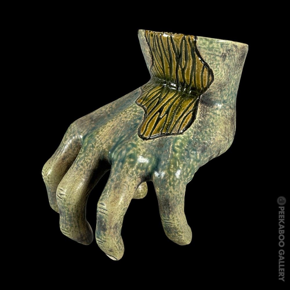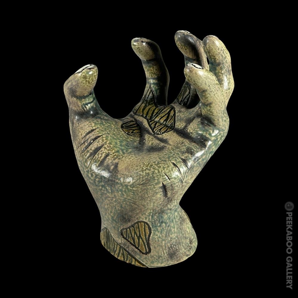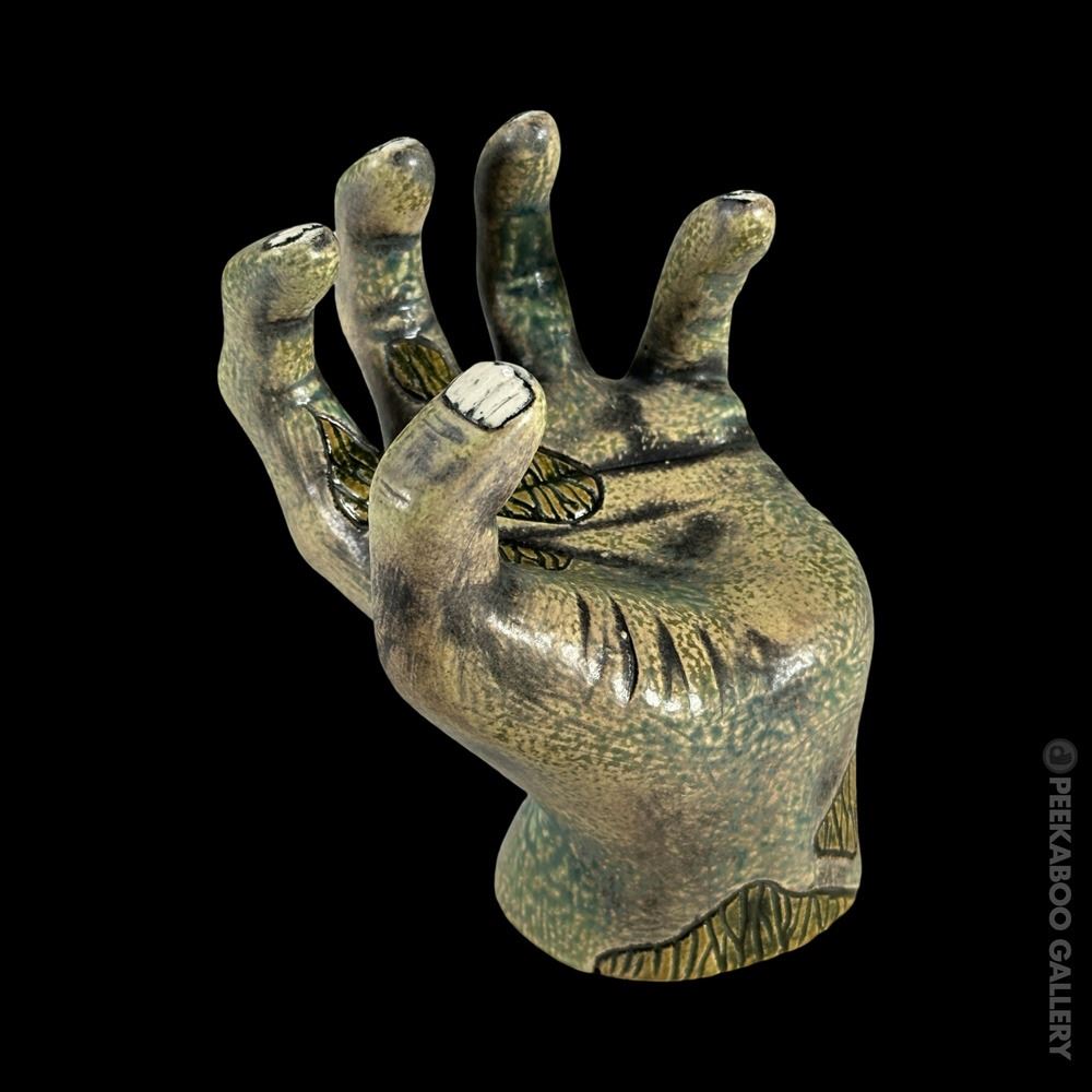(2011) Another amazing limited line by Munktiki. This "mug" is an incredible sculpt, produced in a small number of 100, although for the most part, each one is unique. The accents of every mug was customized with variant versions of colors and ripped flesh/bone. No two are alike. The mug stands on its fingers or on the severed wrist. VG+. 5.75"x5"dia.
