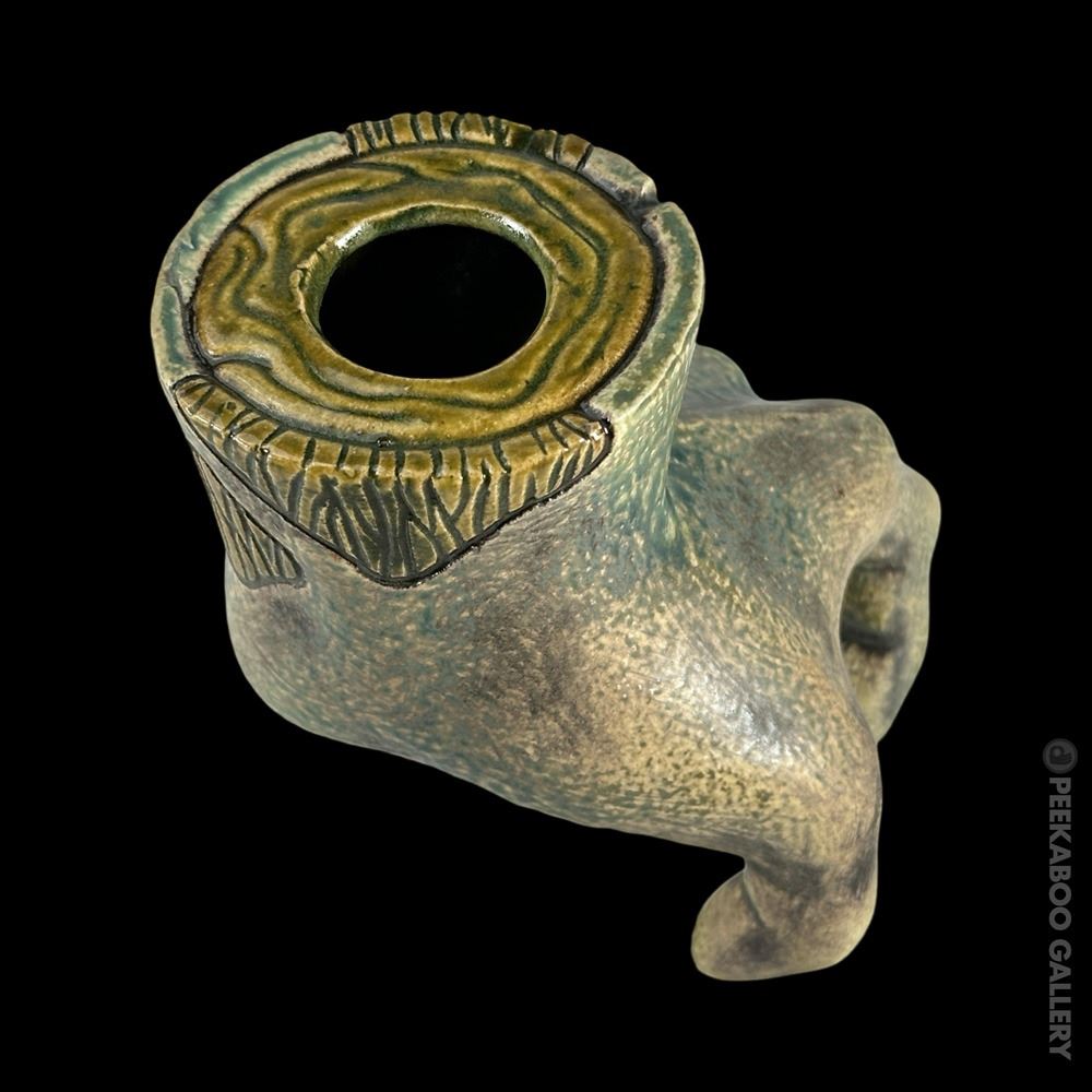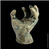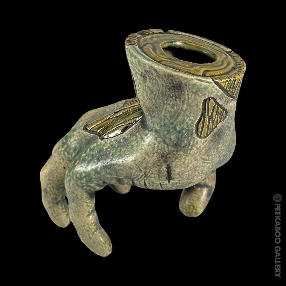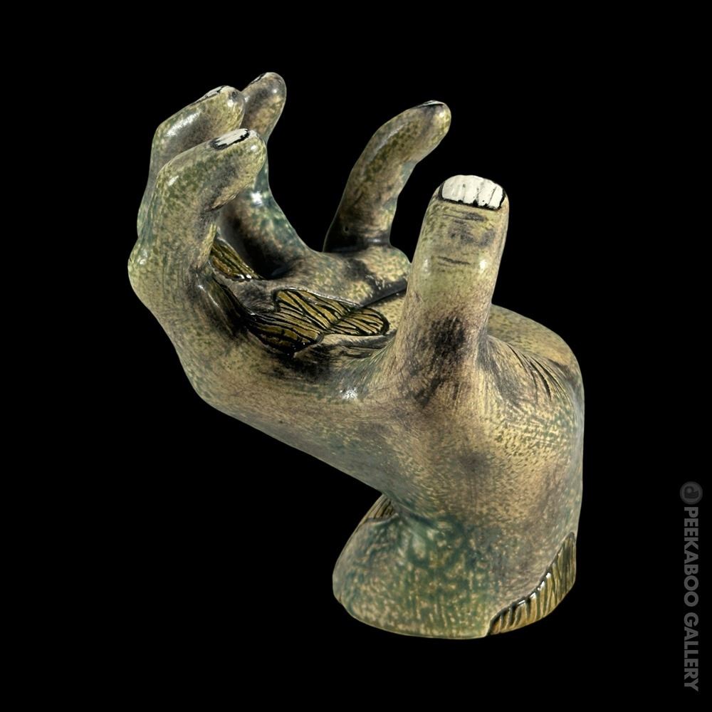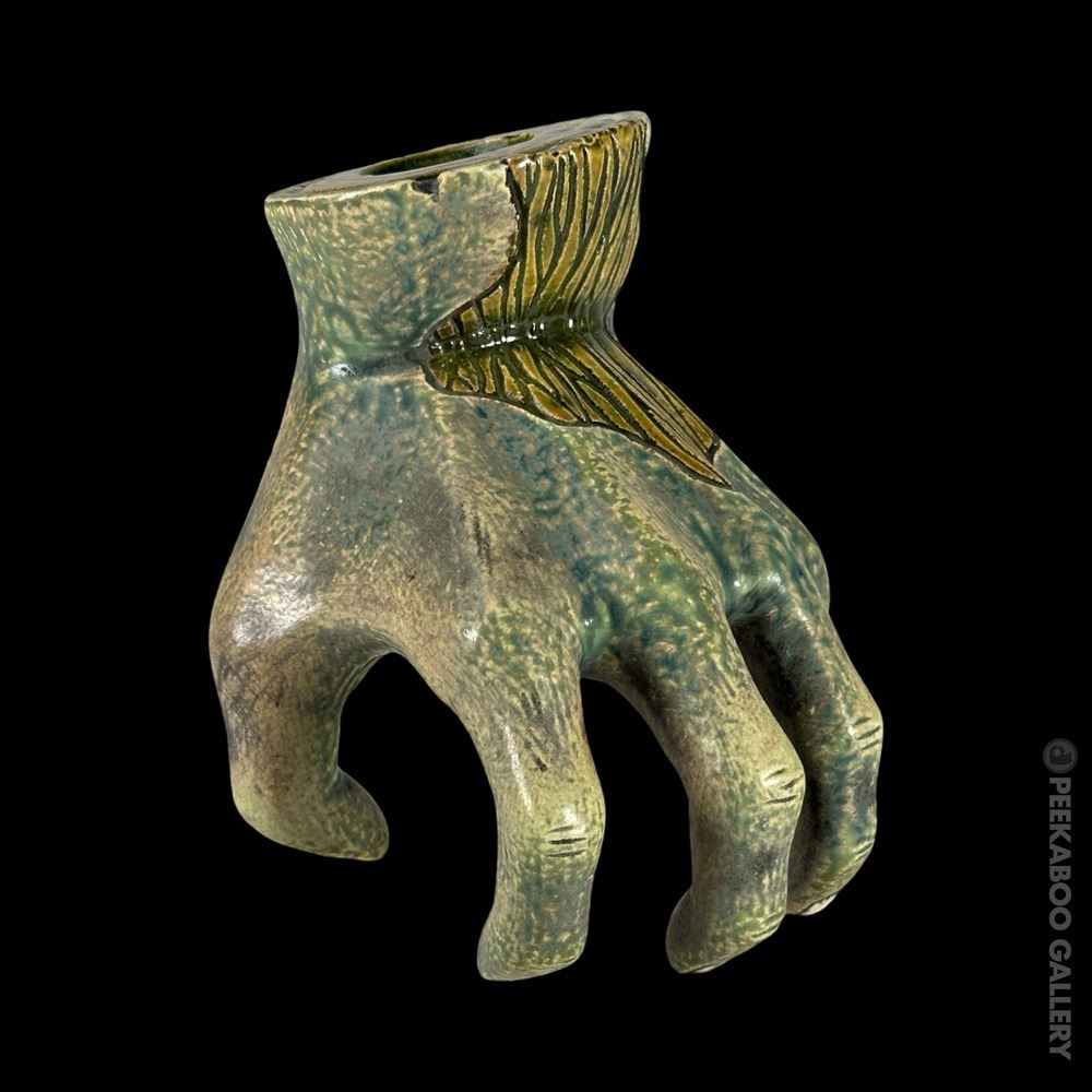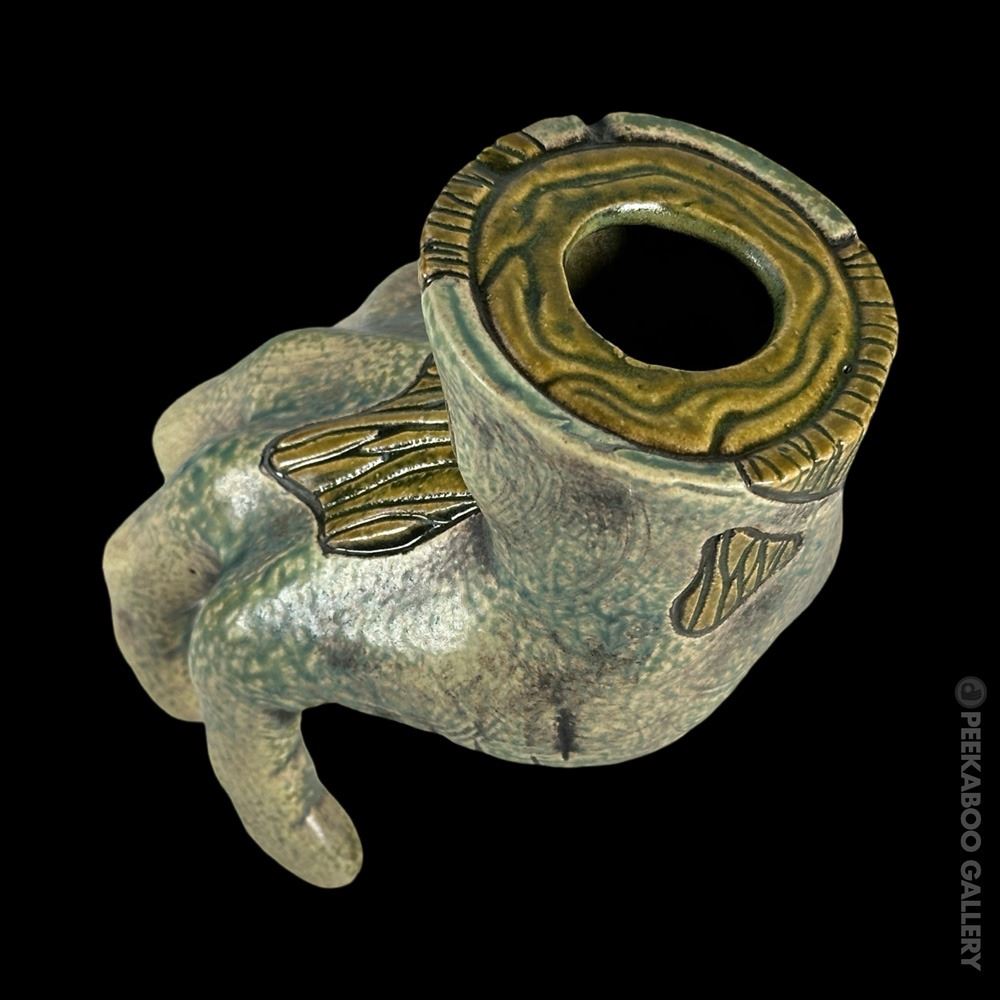 (2011) Another amazing limited line by Munktiki. This "mug" is an incredible sculpt, produced in a small number of 100, although for the most part, each one is unique. The accents of every mug was customized with variant versions of colors and ripped flesh/bone. No two are alike. The mug stands on its fingers or on the severed wrist. VG+. 5.75"x5"dia.