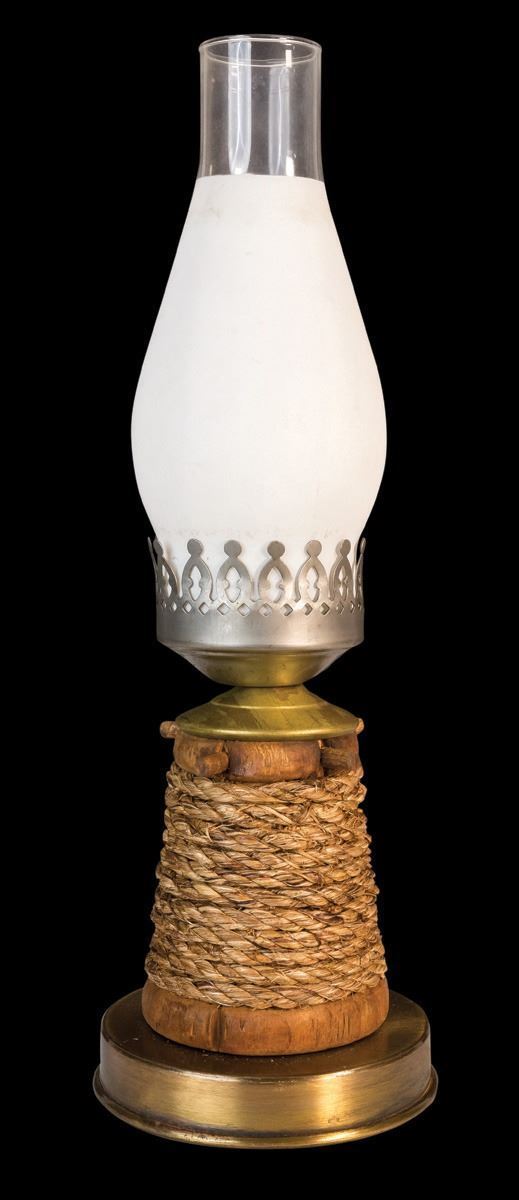 (1960s) A rare turned hardwood replica of a taller pattern ship's capstan with coiled rope. This particular pattern was not featured in the OA catalog yet was offered on the showroom floor as an alternative style. Tall glass hurricane glass shade.14"x5"VG+