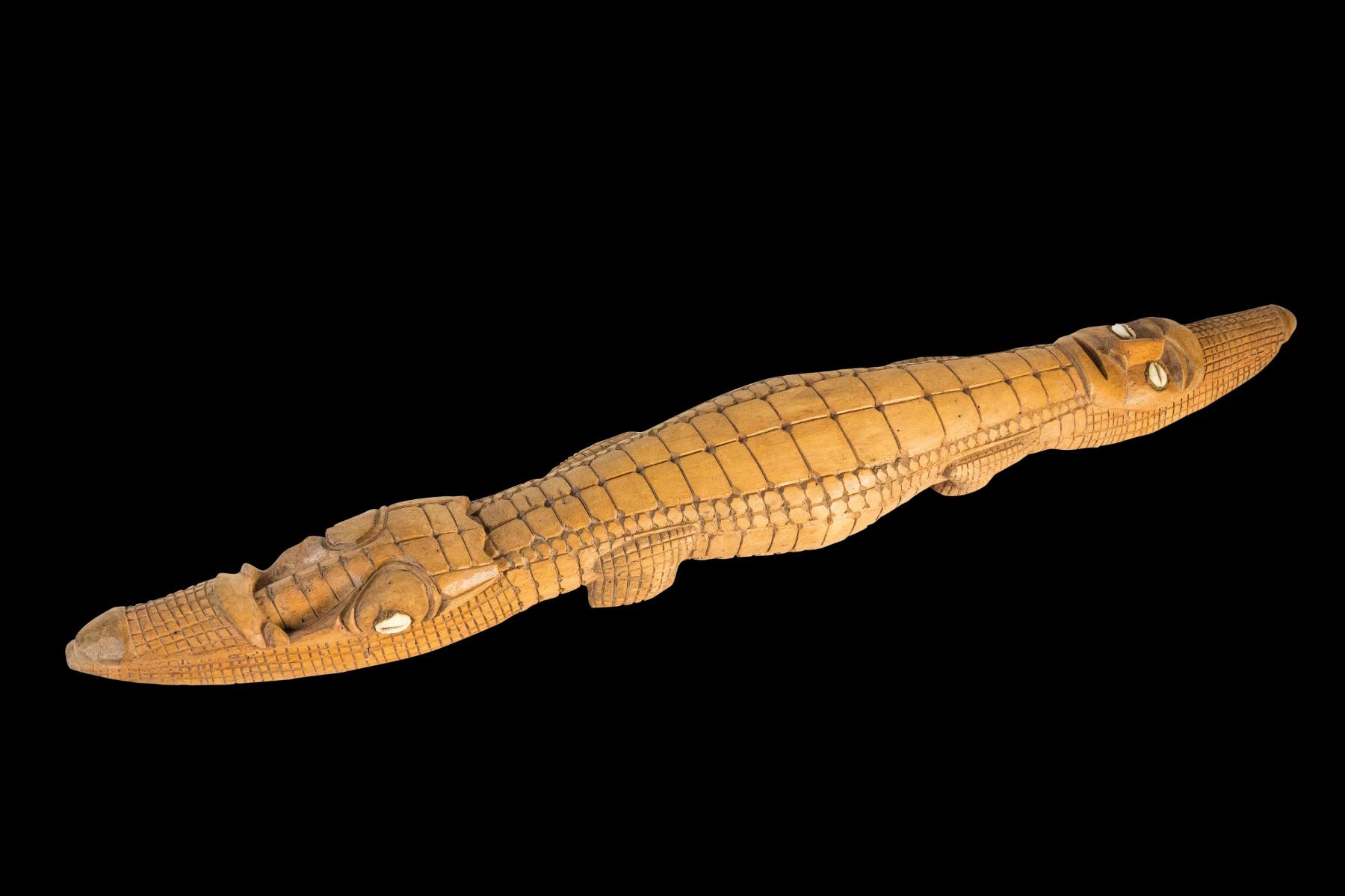 (Mid-20th Century) New Guinea Folk Art Crocodile sculpture with inset cowrie shell eyes and ancestor face on the tail. 3.5"x34". VG+.