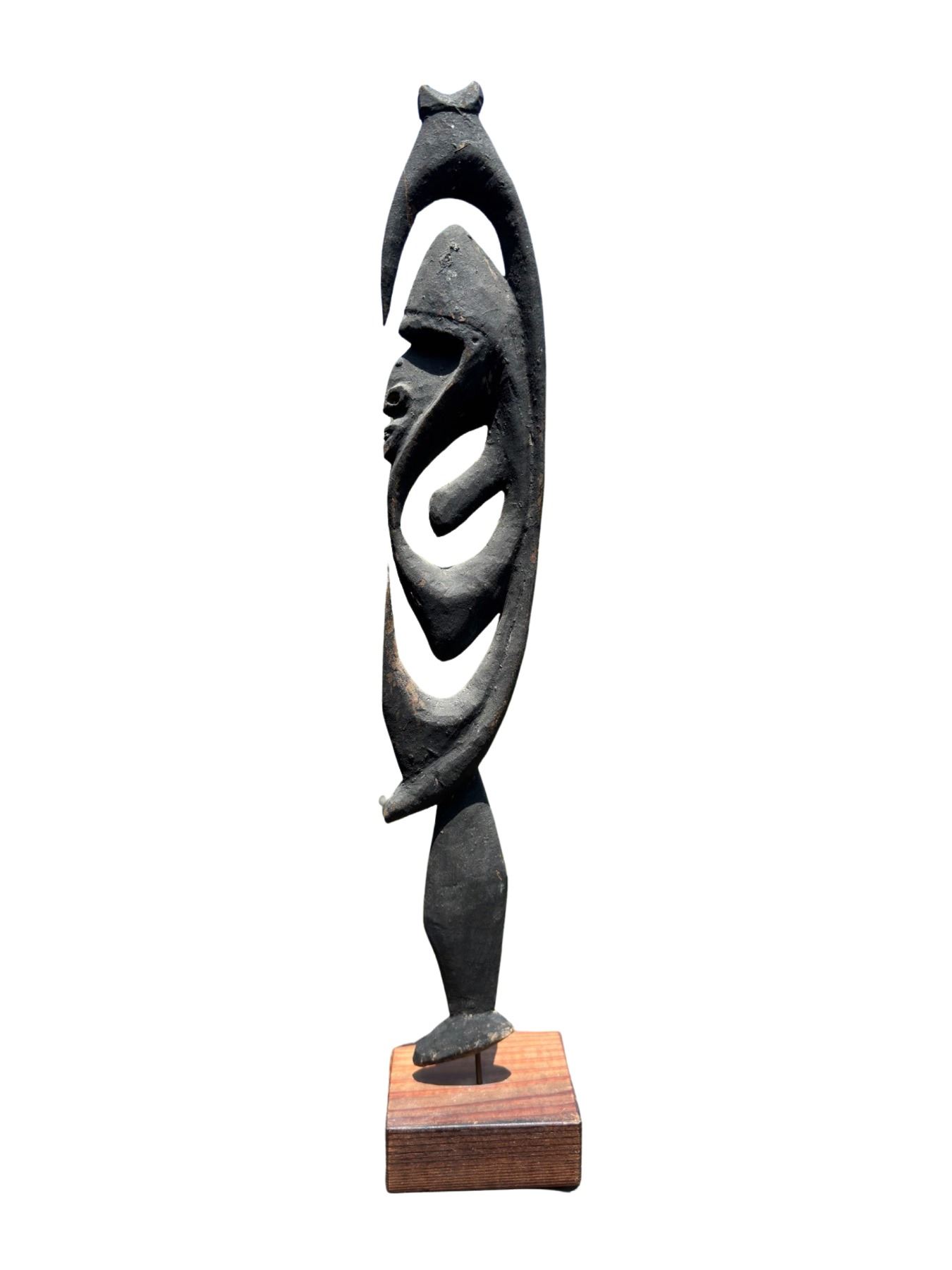 (1950s) A striking primitive artifact from Papua New Guinea. A Kamanggabi Hook figure used to ward off evil spirits. Very delicately carved. Mounted on wood base. 22"x4" on base. VG+ with typical wear.