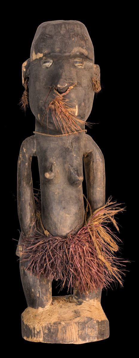 (Mid-Century) Carved wood ancestor figure with raffia attachments and inset shell eyes.17"x5"VG+ with typical wear