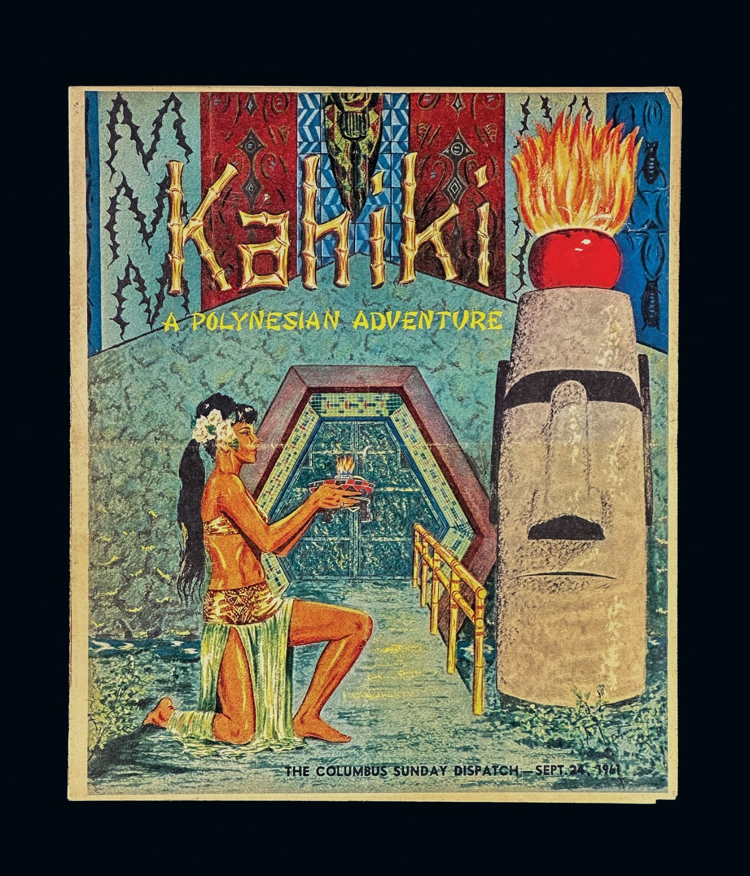 (1961) An amazing local Ohio newspaper periodical supplement advertisement taken out by the Kahiki to advertise to the local region on their opening. Features gorgeous illustrations from the cover, to interior cutaways of the building and celebrity guests "you're apt to meet" upon a visit to the Kahiki! Rare. VG+ with small tear and creasing. 11"x13" closed.