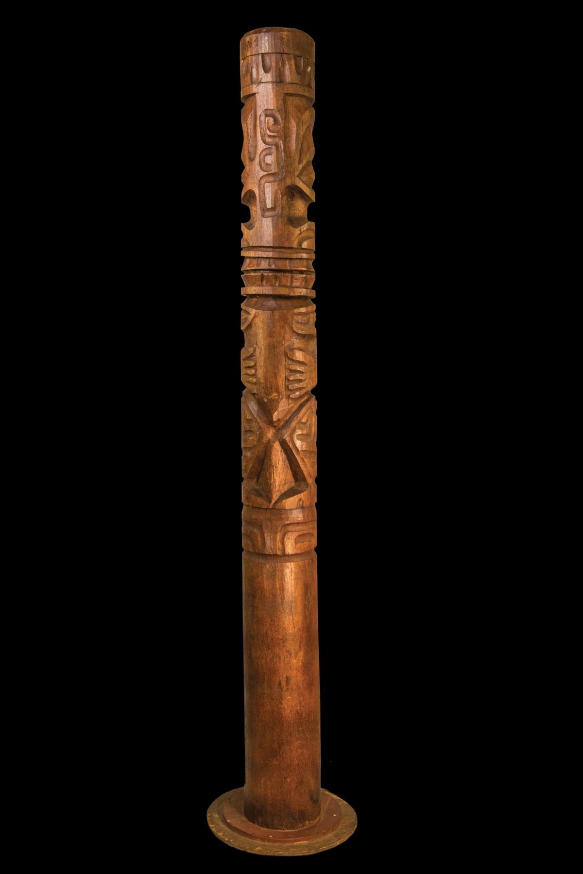(1960s) These figures were carved across Tahiti by native craftsmen for use in restaurants and other commercial locations. These in particular were salvaged from closed Trader Vic's locations and sold to OA. These were carried in the OA Luau Rental Department and on the showroom floor as samples. The carving is striking and it features a rich, vintage patina. Is mounted on a round flat base for display stability and will stand on its own. 82"x8" on base. VG+ with typical wear.