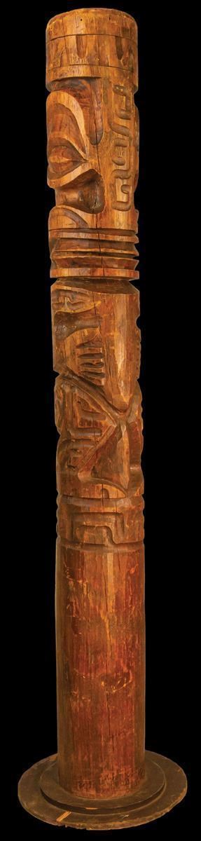 (1960s) These figures were carved across Tahiti by native craftsmen for use in restaurants and other commercial locations. These in particular were salvaged from closed Trader Vic's locations and sold to OA. These were carried in the OA Luau Rental Department and on the showroom floor as samples. The carving is striking and it features a rich, vintage patina. Is mounted on a round flat base for display stability and will stand on its own.84"x9.5".VG+ with typical wear.