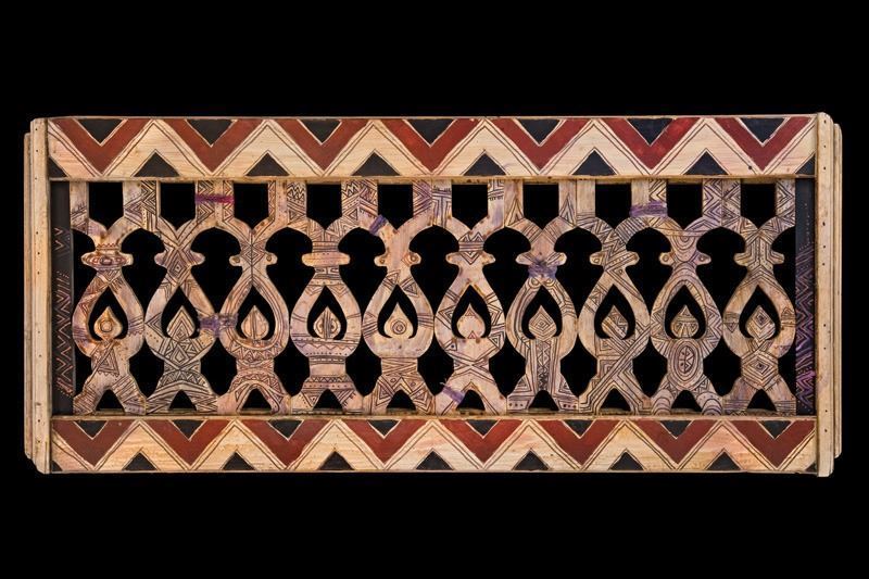 (1990s) Here is a salvaged 19th Century lintel used on a Victorian estate and repurposed by LeRoy Schmaltz to evoke the establishment of Western plantations across the Pacific islands. The duality of European and American architecture and its melding with island environments made for picturesque bedfellows. Cool, sun-shaded verandas and open flow breezeways conjure a mood in both form and function for Western settlers throughout the Pacific region. This detailed panel is hand painted on both sides and features fiber lashing accents.28"x55"x3.75"VG+ with typical wear