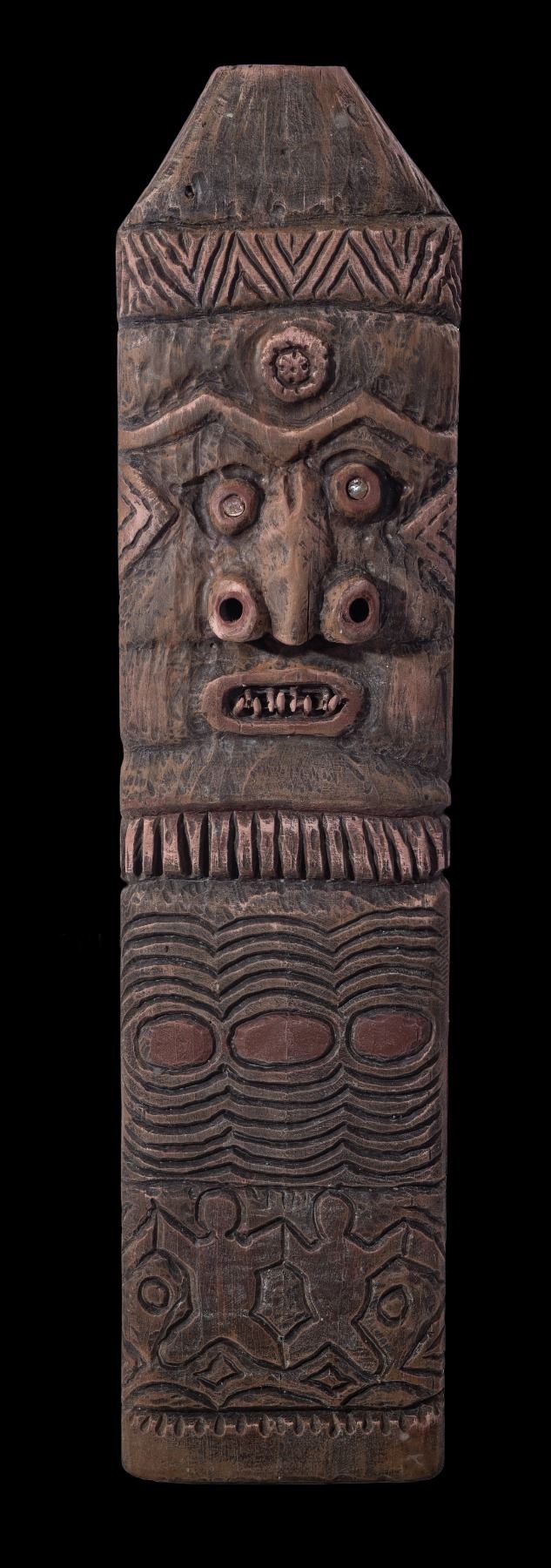 (1990s) Another handsome New Caledonia Tale carved by LeRoy Schmaltz. This one features inset abalone shell eyes. 48"x12". VG+ with typical wear.
