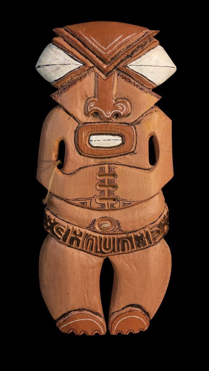(2000s) A LeRoy carved and painted wall panel of the famous OA logo tiki. Signed in ink and carved on the back by LeRoy Schmaltz.24"x10.5".VG+ with typical wear.