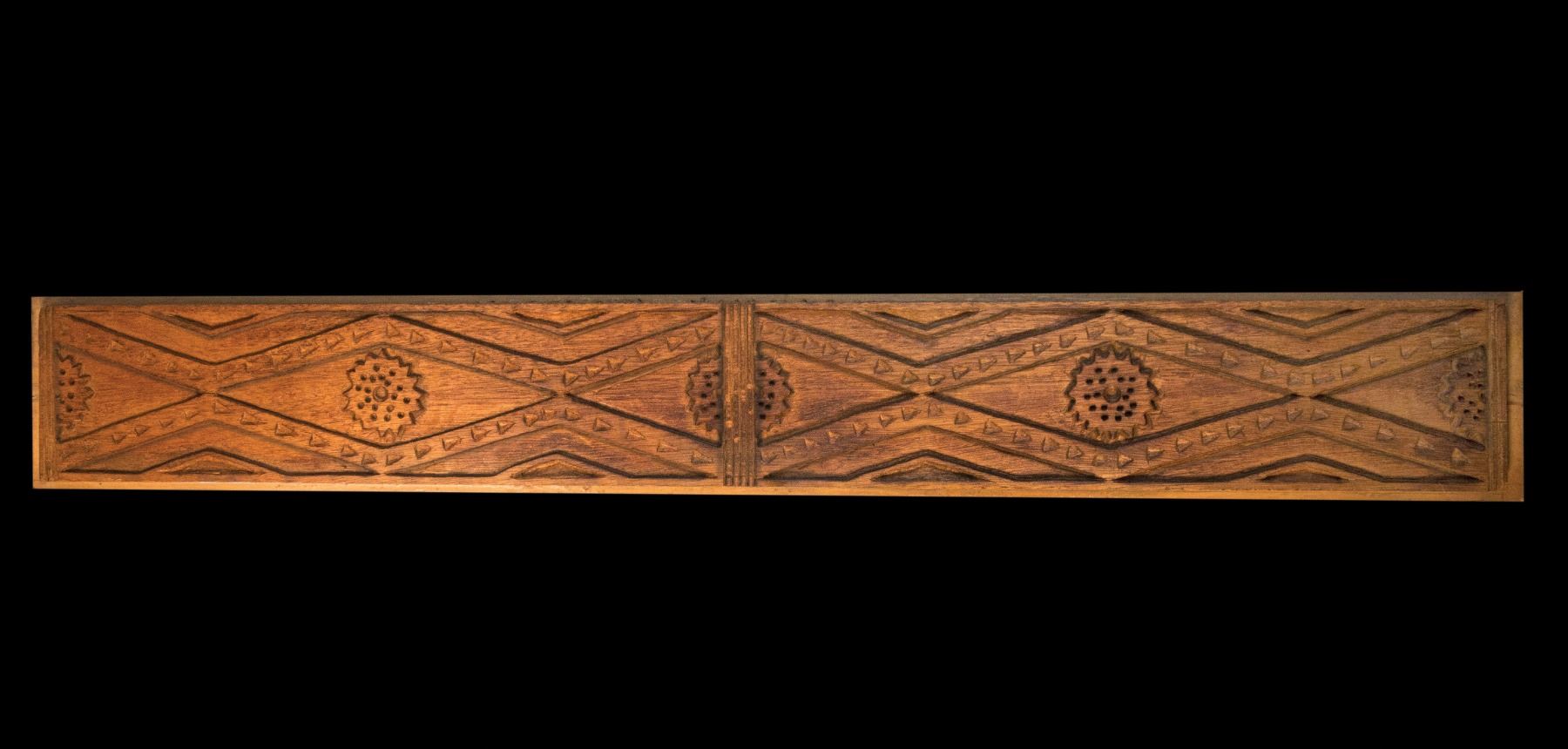 (1960s) A classic OA-George Nakashima design for repeating wall trim. Examples of this type could be found in Tiki temples across the nation with uses in the MAI-KAI to KON TIKI locations. 49.5x7. VG+ with typical wear.