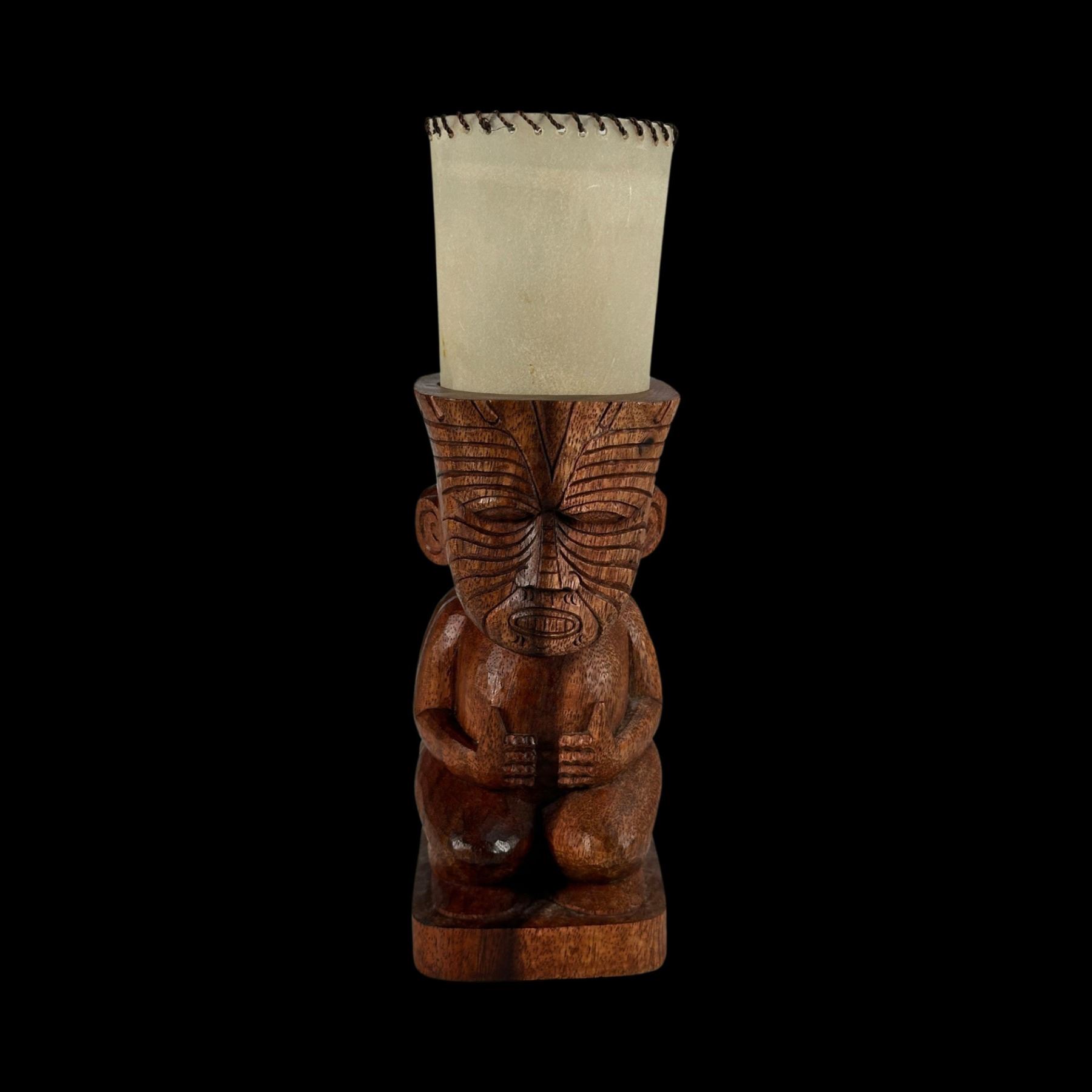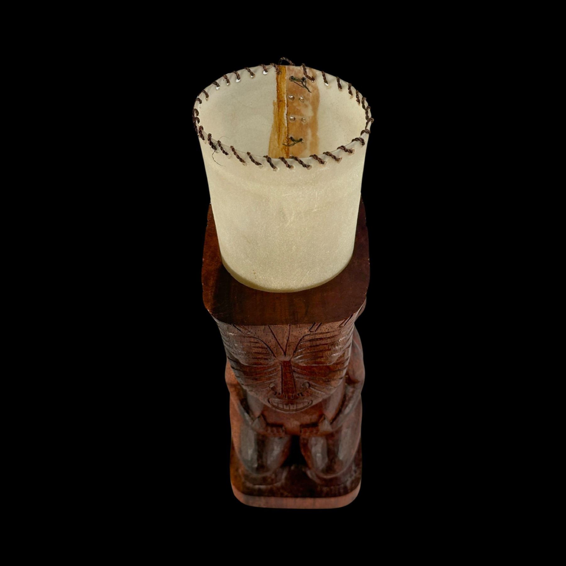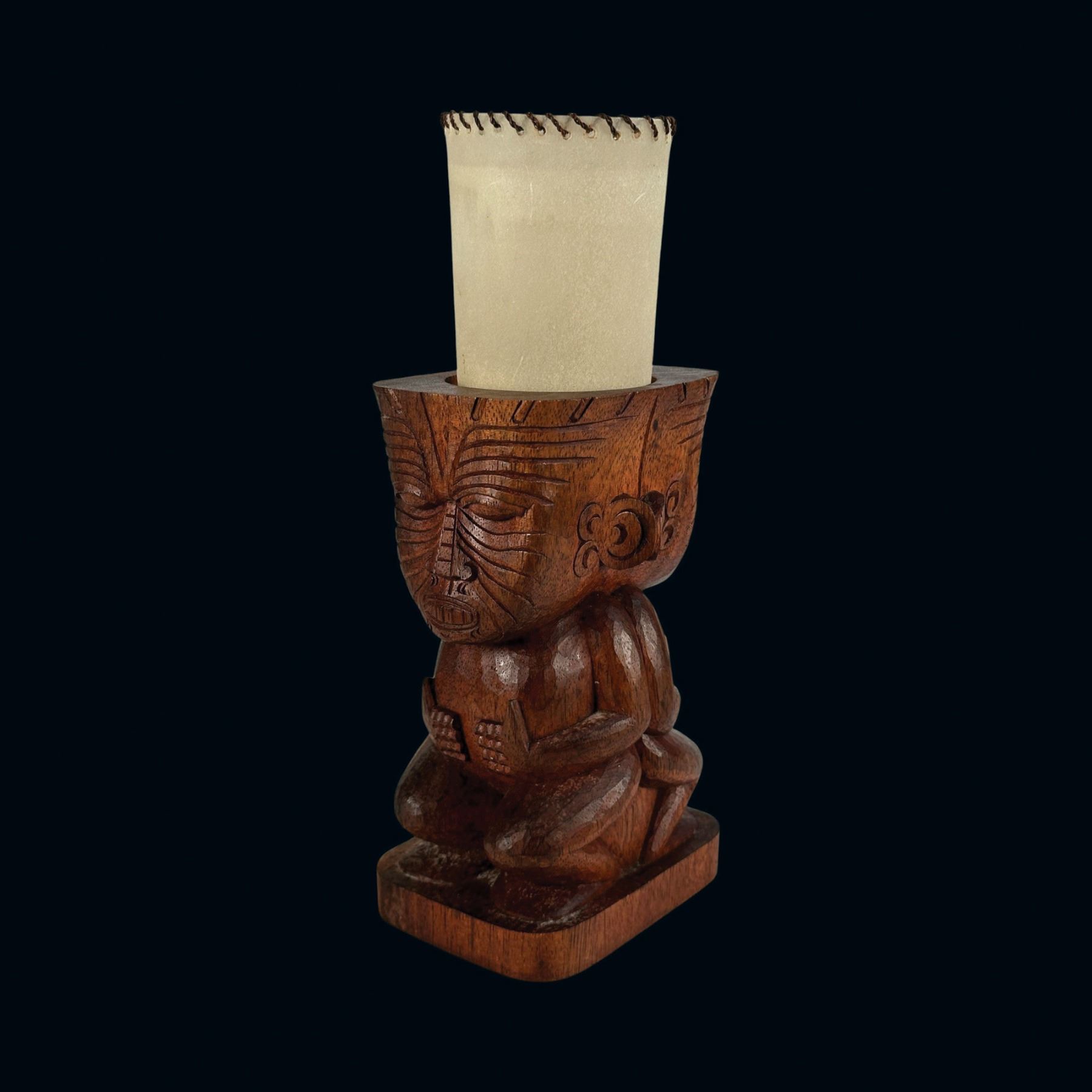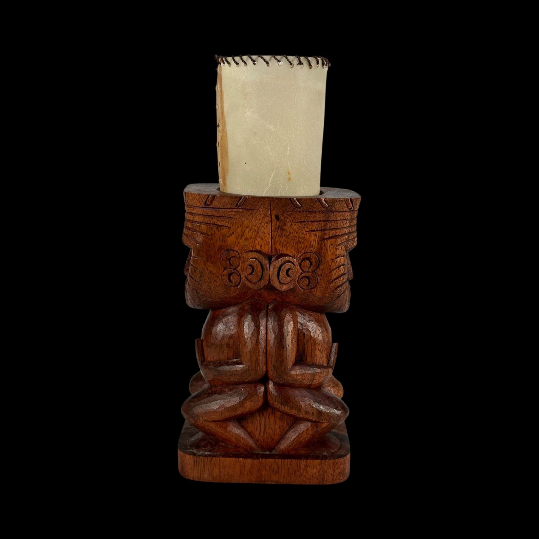 (1960s) One of the most classic Tiki table lamps to have ever been produced by OA. The twin Maori carvings were adopted by Trader Vic's as their signature logo for a period in the late 1950s to the early 60s when the 'shield and oars' took over. This carved hardwood lamp is the Style C version and is topped with an animal skin shade that would cover a glass held candle (not present). VG+ with typical wear. 3.5"x10.75"x4.5".