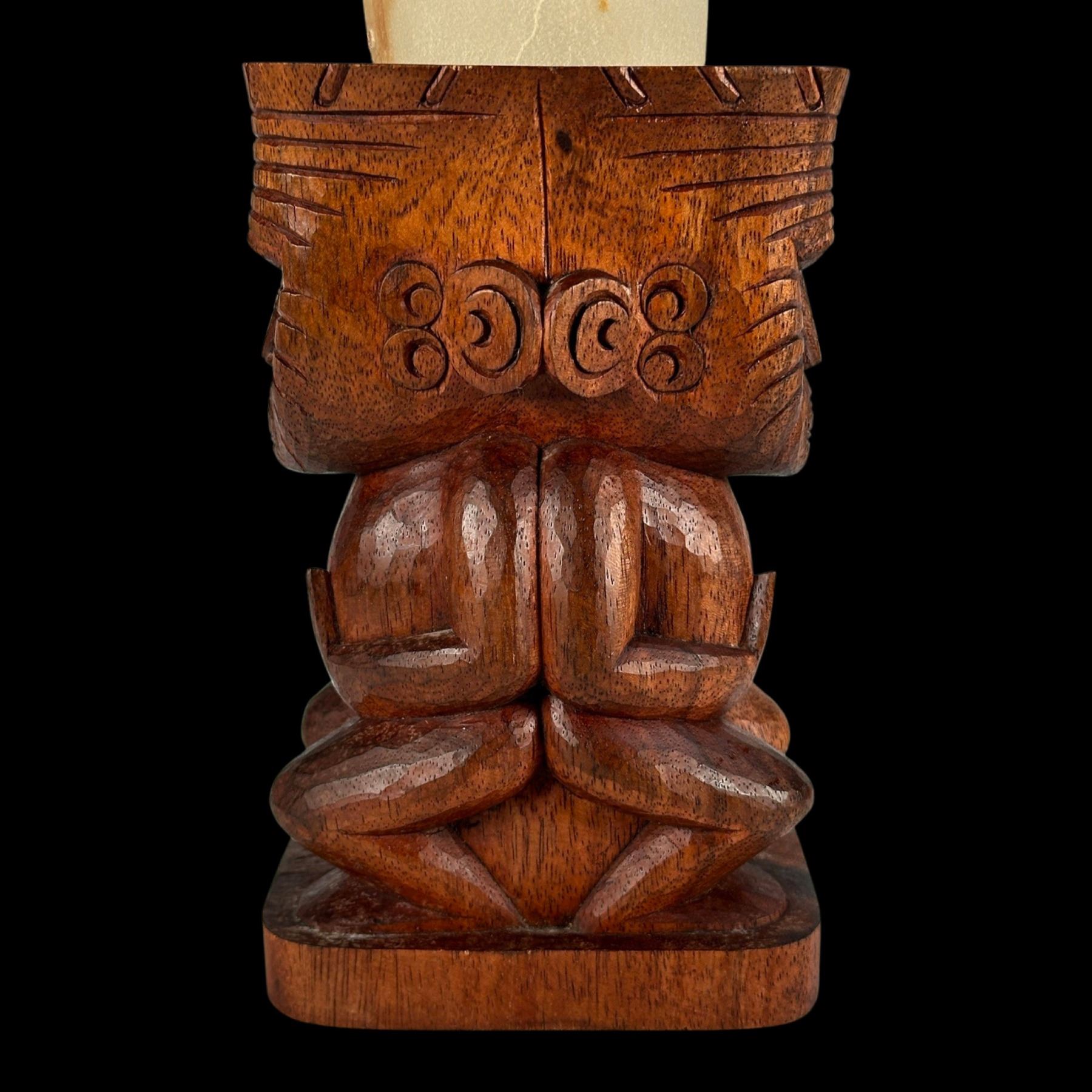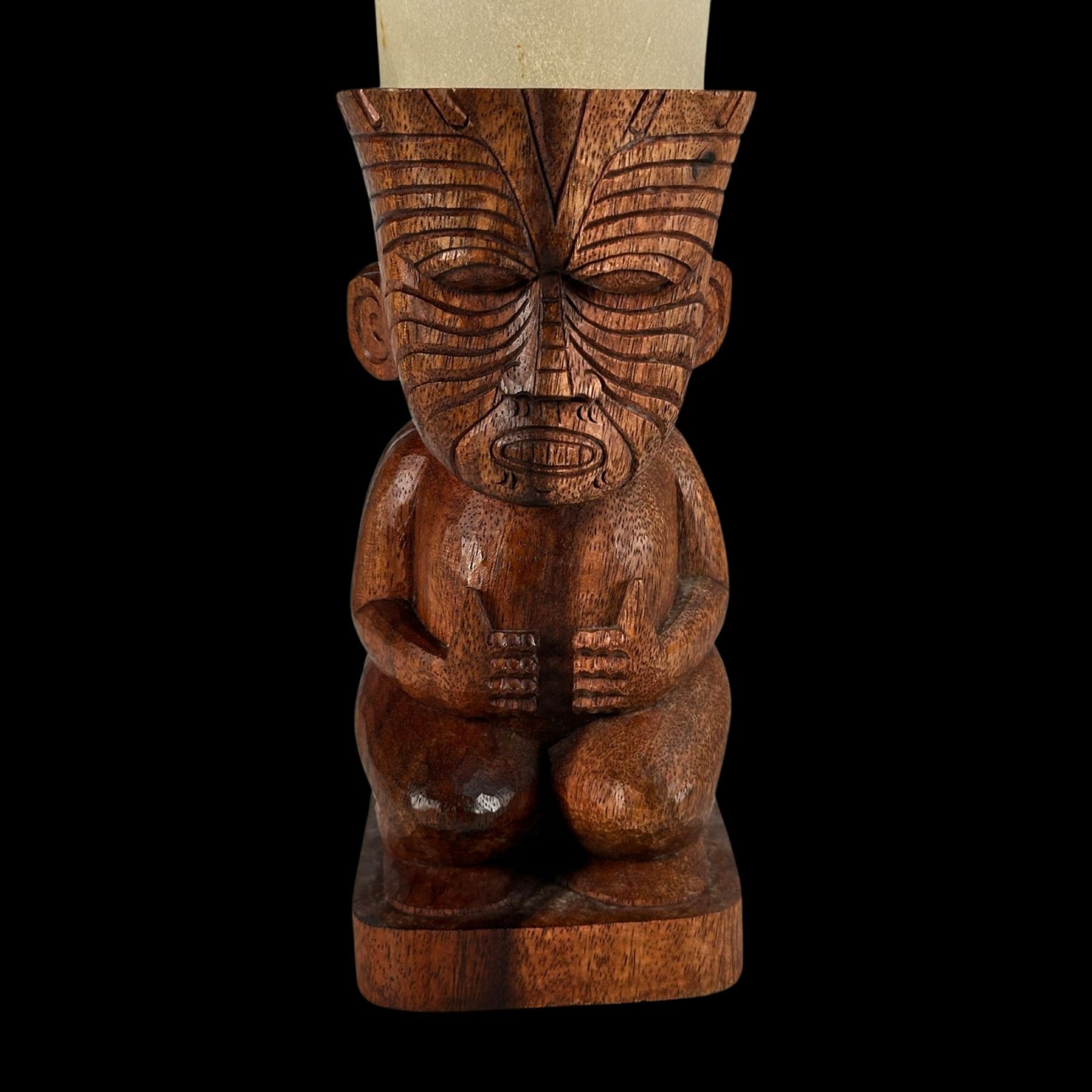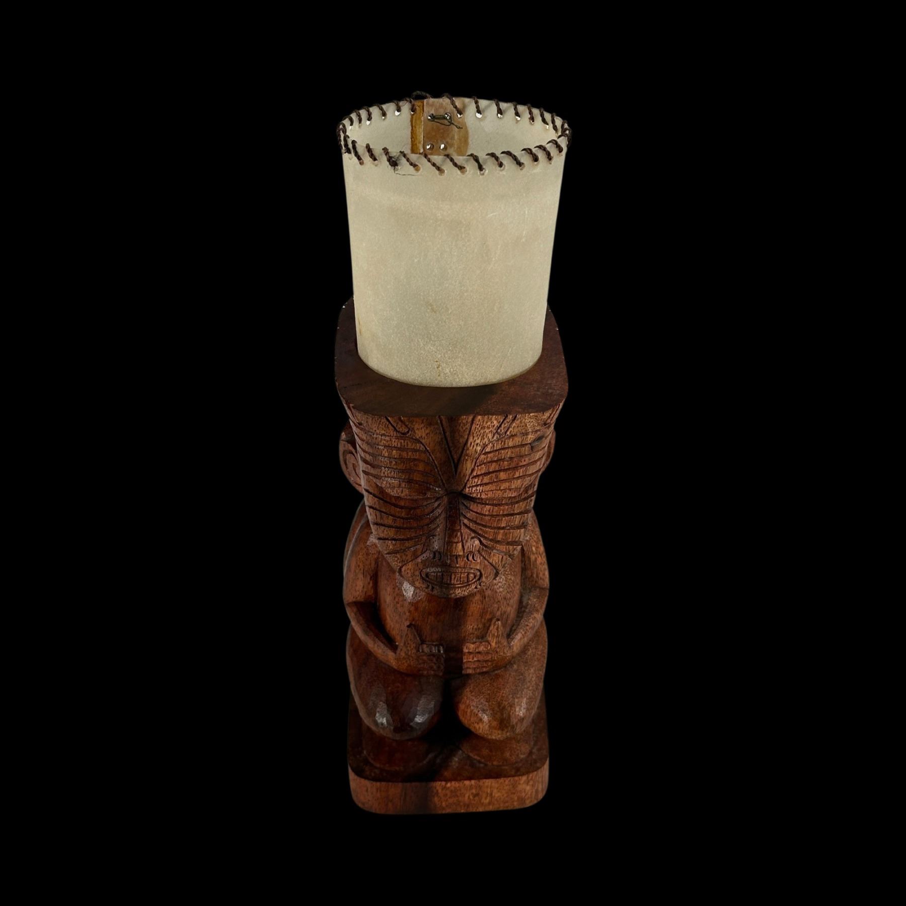 (1960s) One of the most classic Tiki table lamps to have ever been produced by OA. The twin Maori carvings were adopted by Trader Vic's as their signature logo for a period in the late 1950s to the early 60s when the 'shield and oars' took over. This carved hardwood lamp is the Style C version and is topped with an animal skin shade that would cover a glass held candle (not present). VG+ with typical wear. 3.5"x10.75"x4.5".
