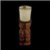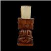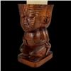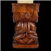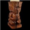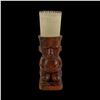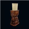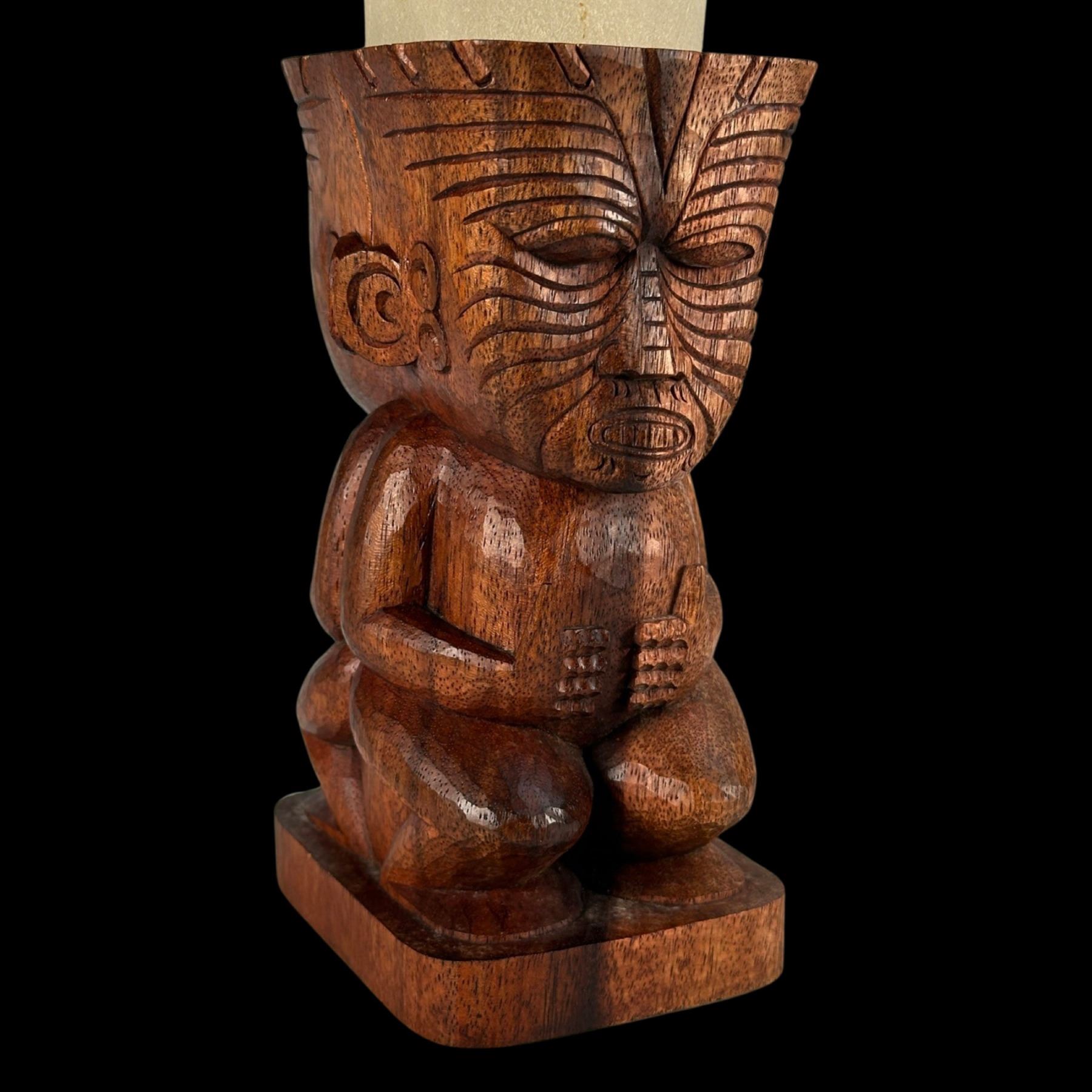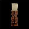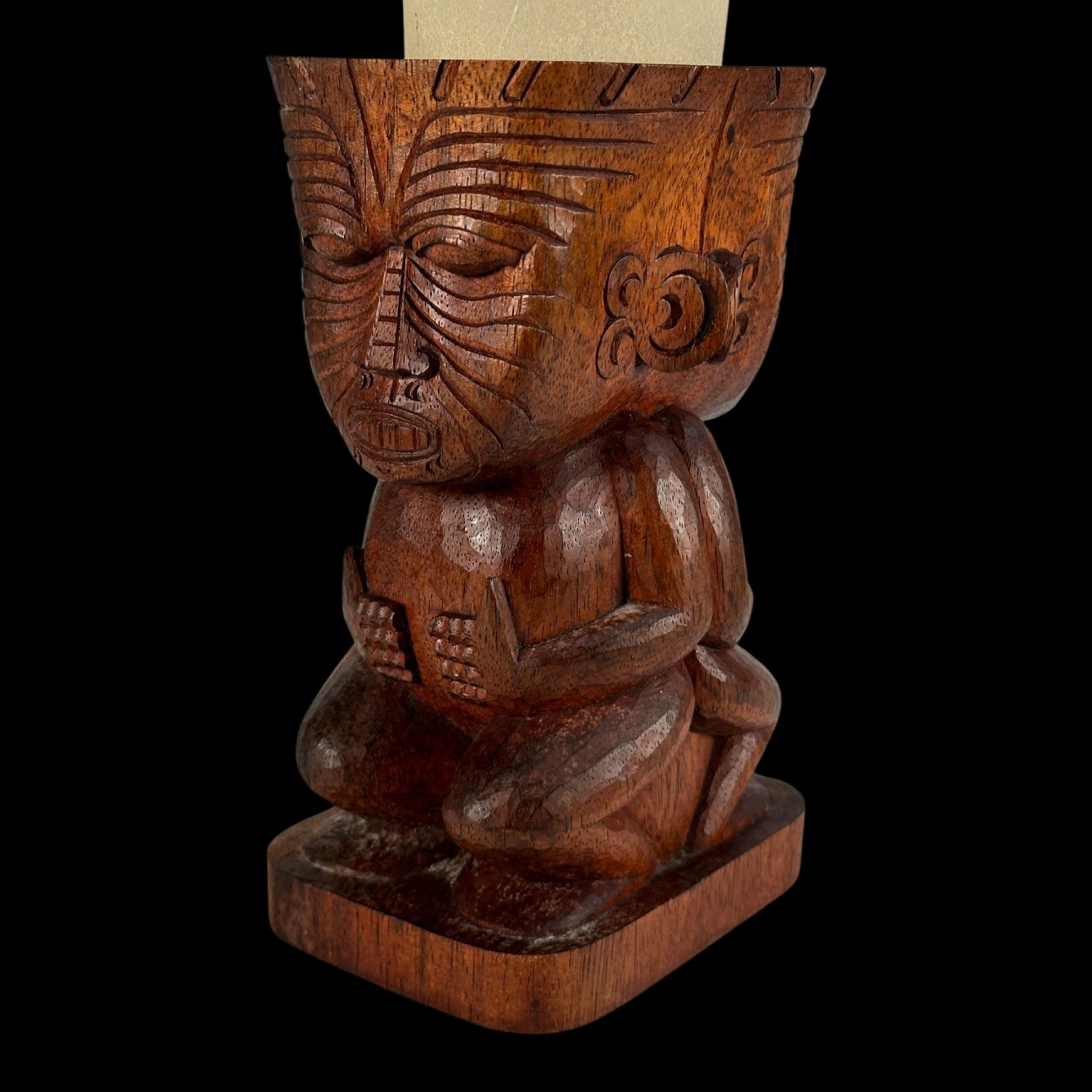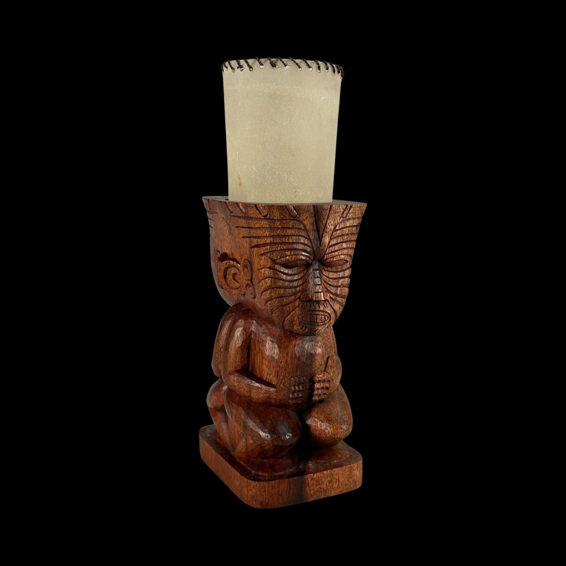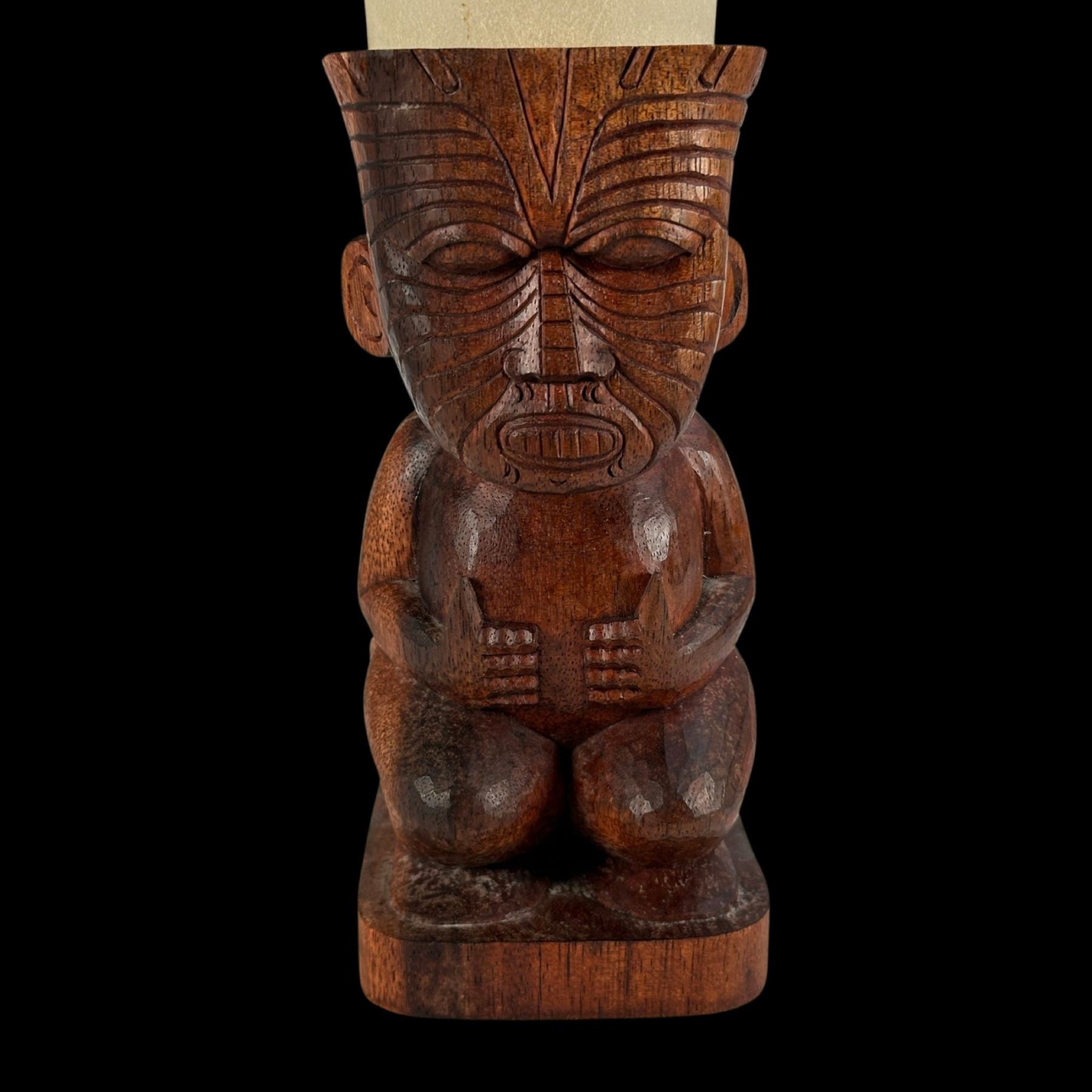 (1960s) One of the most classic Tiki table lamps to have ever been produced by OA. The twin Maori carvings were adopted by Trader Vic's as their signature logo for a period in the late 1950s to the early 60s when the 'shield and oars' took over. This carved hardwood lamp is the Style C version and is topped with an animal skin shade that would cover a glass held candle (not present). VG+ with typical wear. 3.5"x10.75"x4.5".
