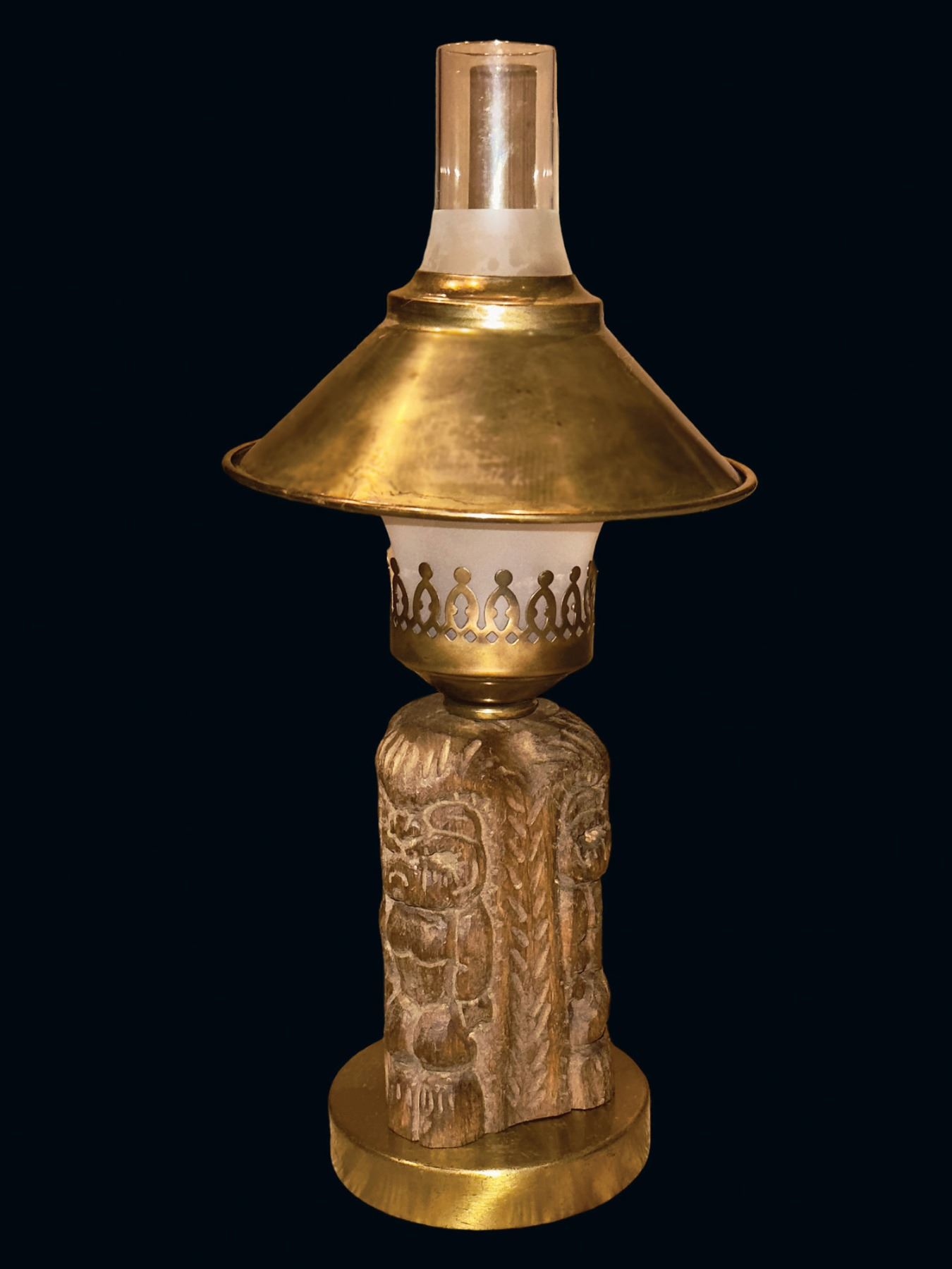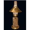 (1960s) Yet another drool inducing table lamp produced by Oceanic Arts. This hardwood carving features a three-sided base with the Hawaiian God of War, KU. On spun brass base hardware and chimney glass with tapa and brass shade. VG+ with typical wear. 7"dia x 15".